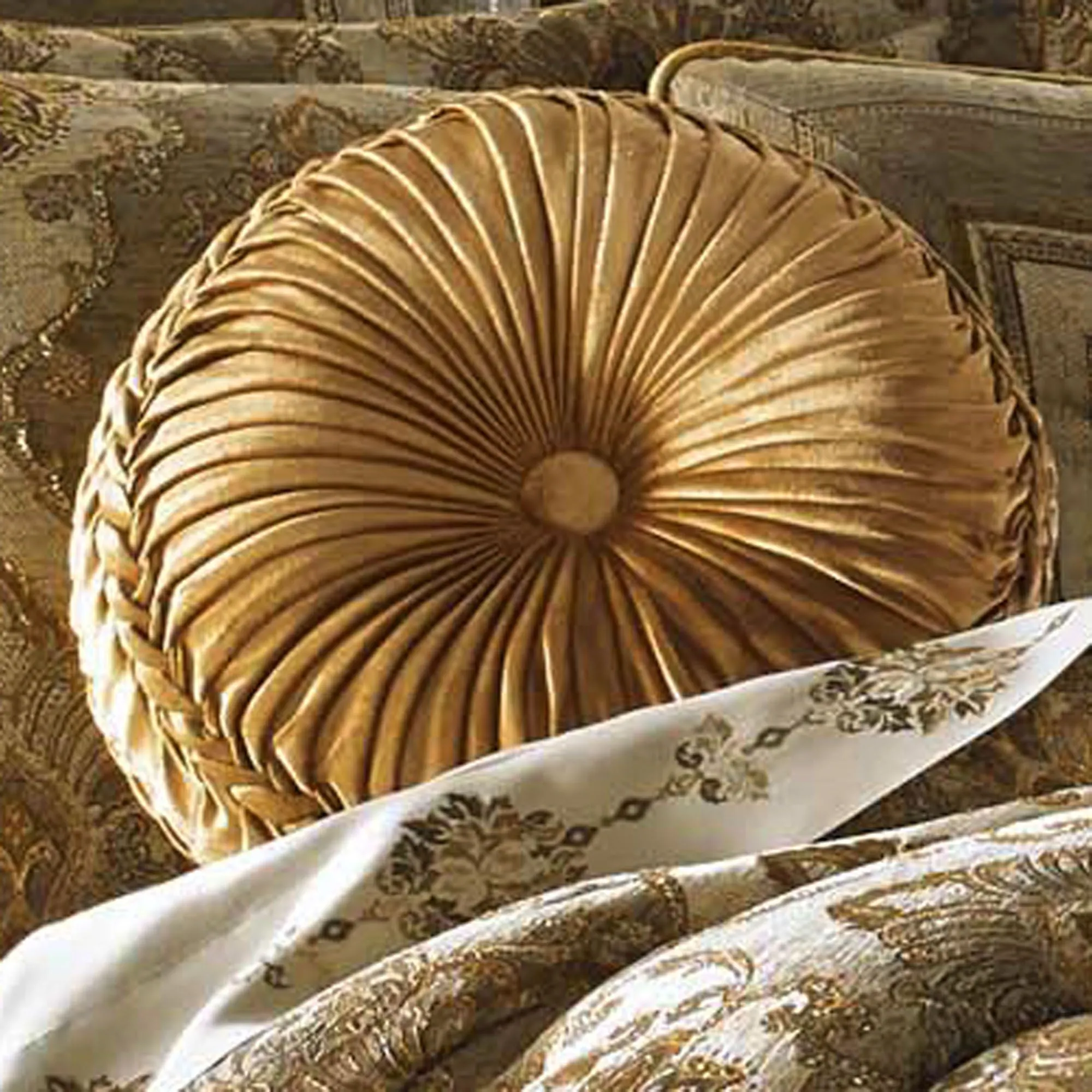 Pillows: Round, 15". Piped Damask Square, 20". Rectangle, 15"x21". Tufted Square, 18".