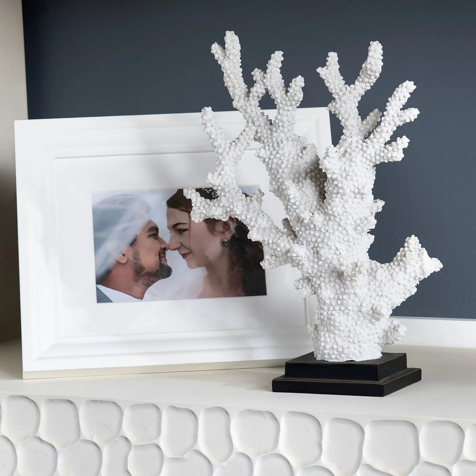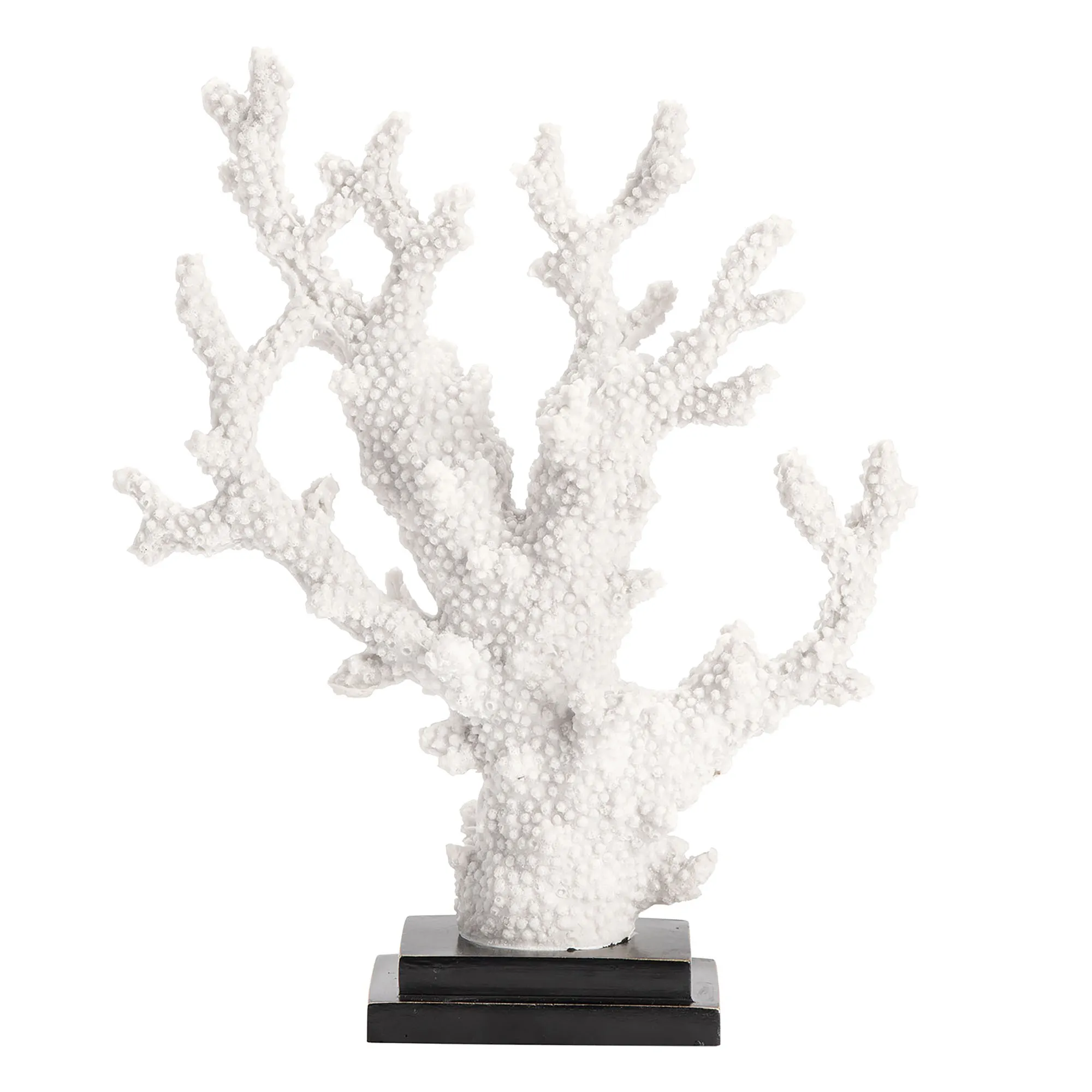 The Branching Coral Table Sculpture transform your home with undersea wonder. Crafted from resin, the sculpture features a white textured coral-like design on a black stepped base. Overall, the coastal sculpture measures 11"Wx4"Dx13.5"H.
