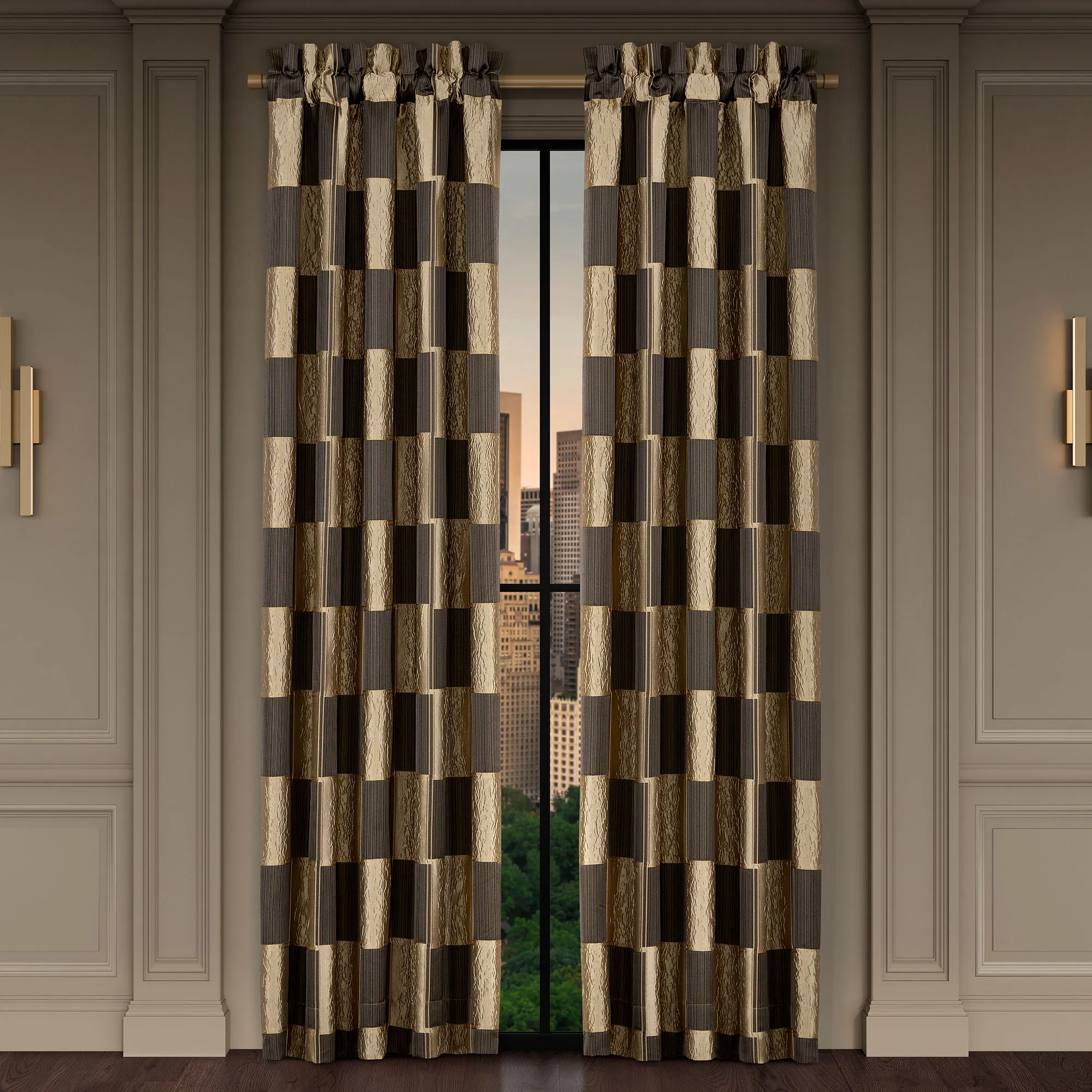 Classic charm combines with modern appeal and textural intrigue to create the Brando Bronze Bedding. From J. Queen New York, the polyester ensemble features a geometric checkered motif crafted from textured striated bronze and woven striated charcoal blocks. Piped edges provide a classic finish to all elements, except the bedskirt and window treatments.
