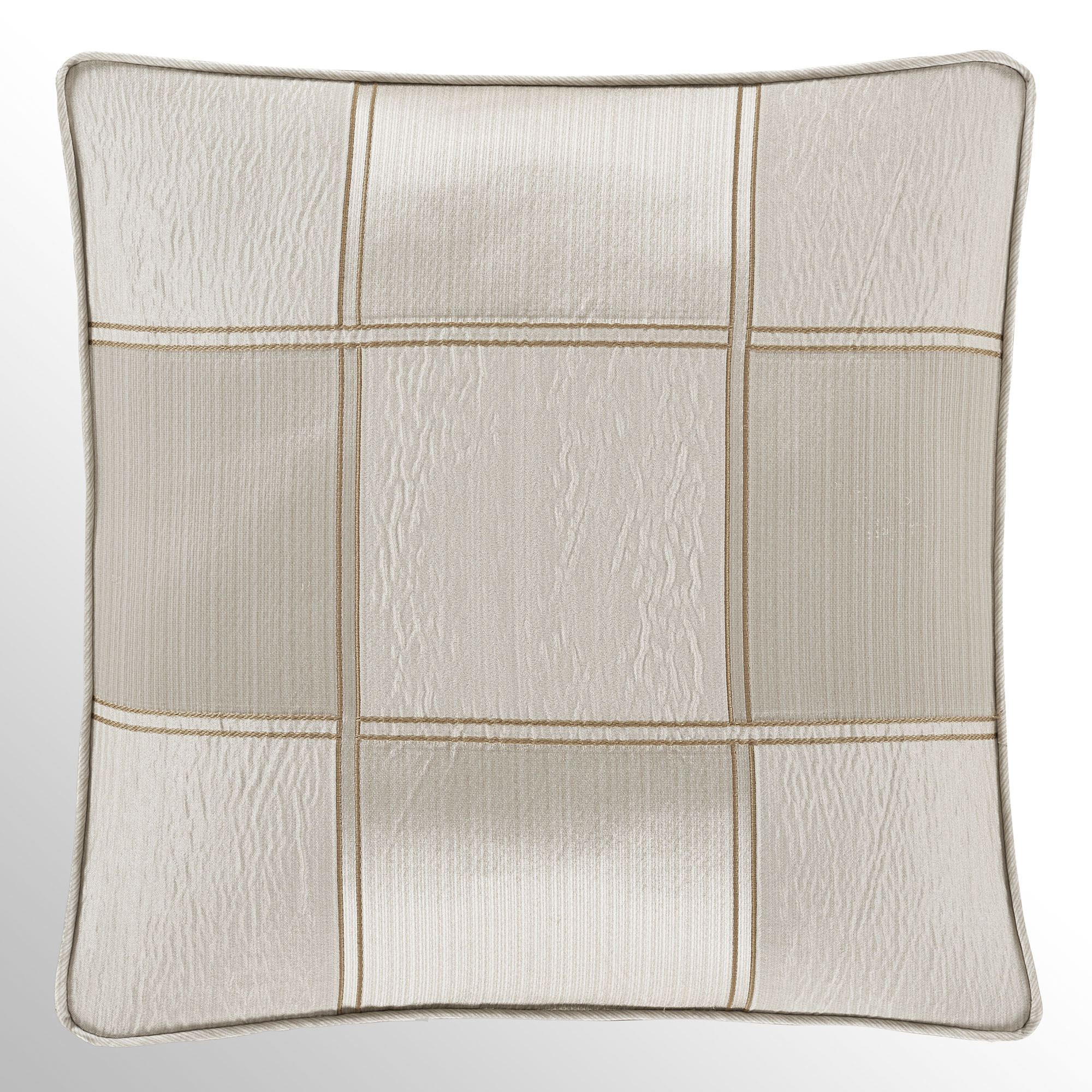 Distinct texture elevates the modern, bold style of the Brando II Decorative Pillow. From J. Queen New York, the polyester pillow features a checkered design crafted from striated and textured, warped blocks. Chic shades of metallic ivory, gold, and parchment highlight a monochromatic sophistication throughout the design. Reversible pillow has piped edges, a 2" gusset, and a checked reverse. Measures 18" sq. Fill is polyester. Spot clean. Imported.