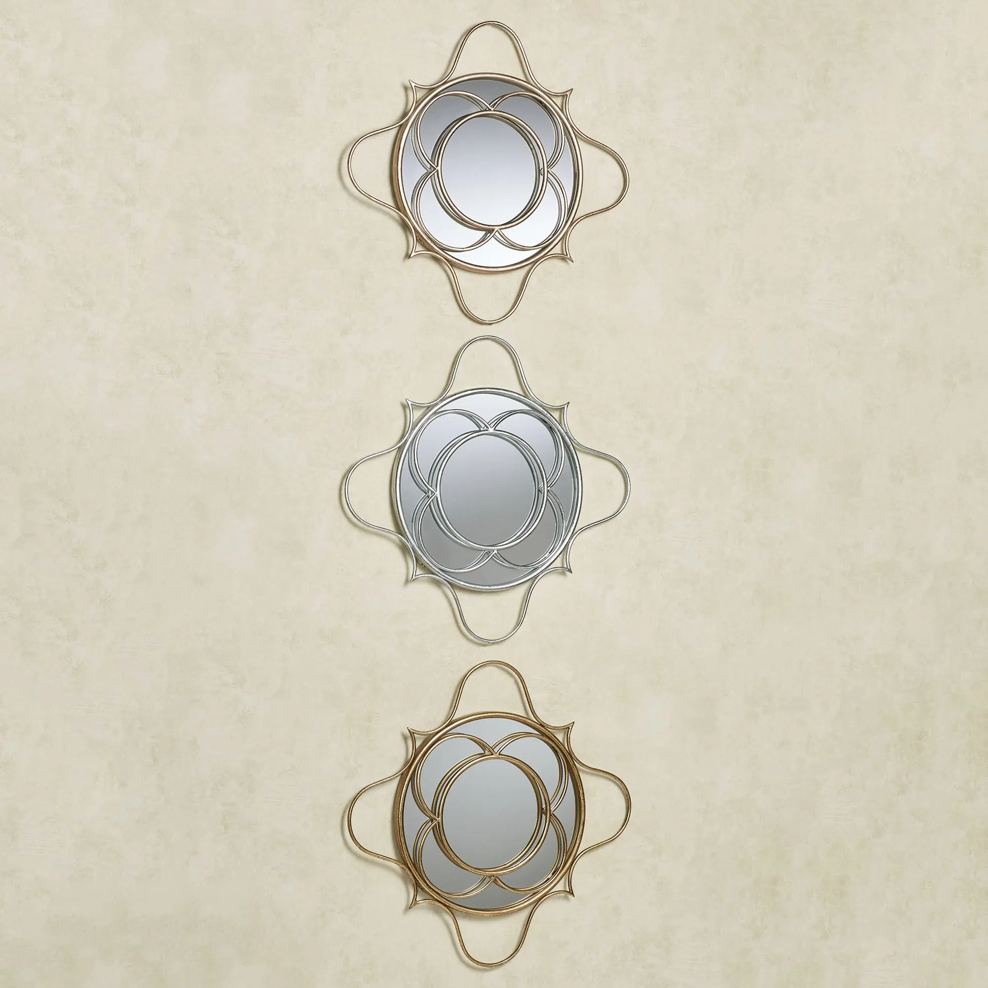 The Brawley Mirrored Wall Art Set graces your wall with intriguing motifs. Metal accents, with a glass mirror in the center, have an ornate overlay and swirling openwork frame. Each has a different finish including aged gold, Venetian gold, and nickel. Each measures 19"Wx1.5"Dx19"H.