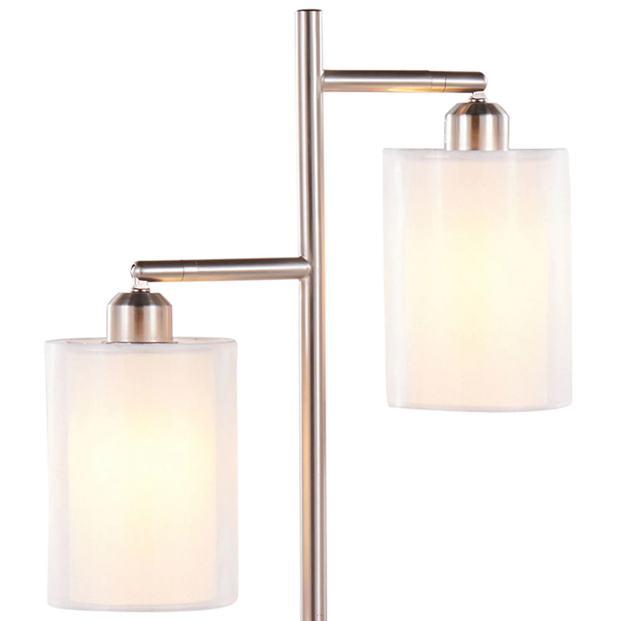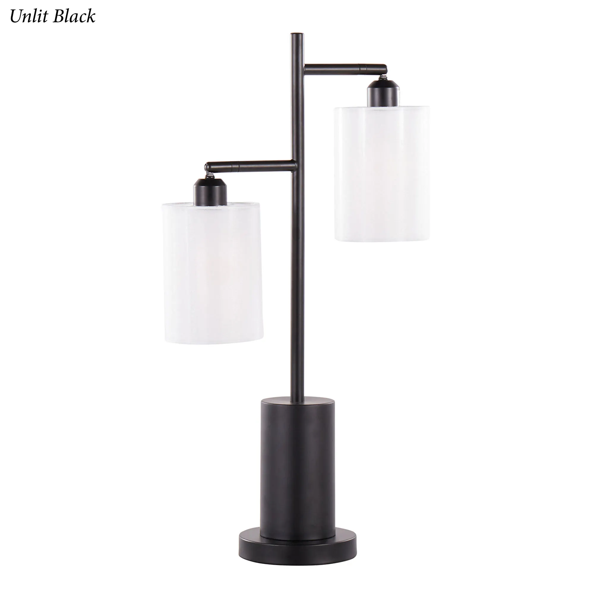 Brighten a desk, nightstand, side table, or accent table with the Brene Table Lamp. Finished in a classic hue, the metal lamp features a chic, simplistic look with a round pedestal base and candlestick font that leads to two adjustable can-style lights. With a multidirectional tilt to fit your space, each light has a double-layered off-white polypropylene shade for a crisp, intriguing design. UL listed. Requires two 40W max. bulbs that operate via an on/off switch on the base. Overall, the table lamp measures 15"Wx7"Dx27"H.