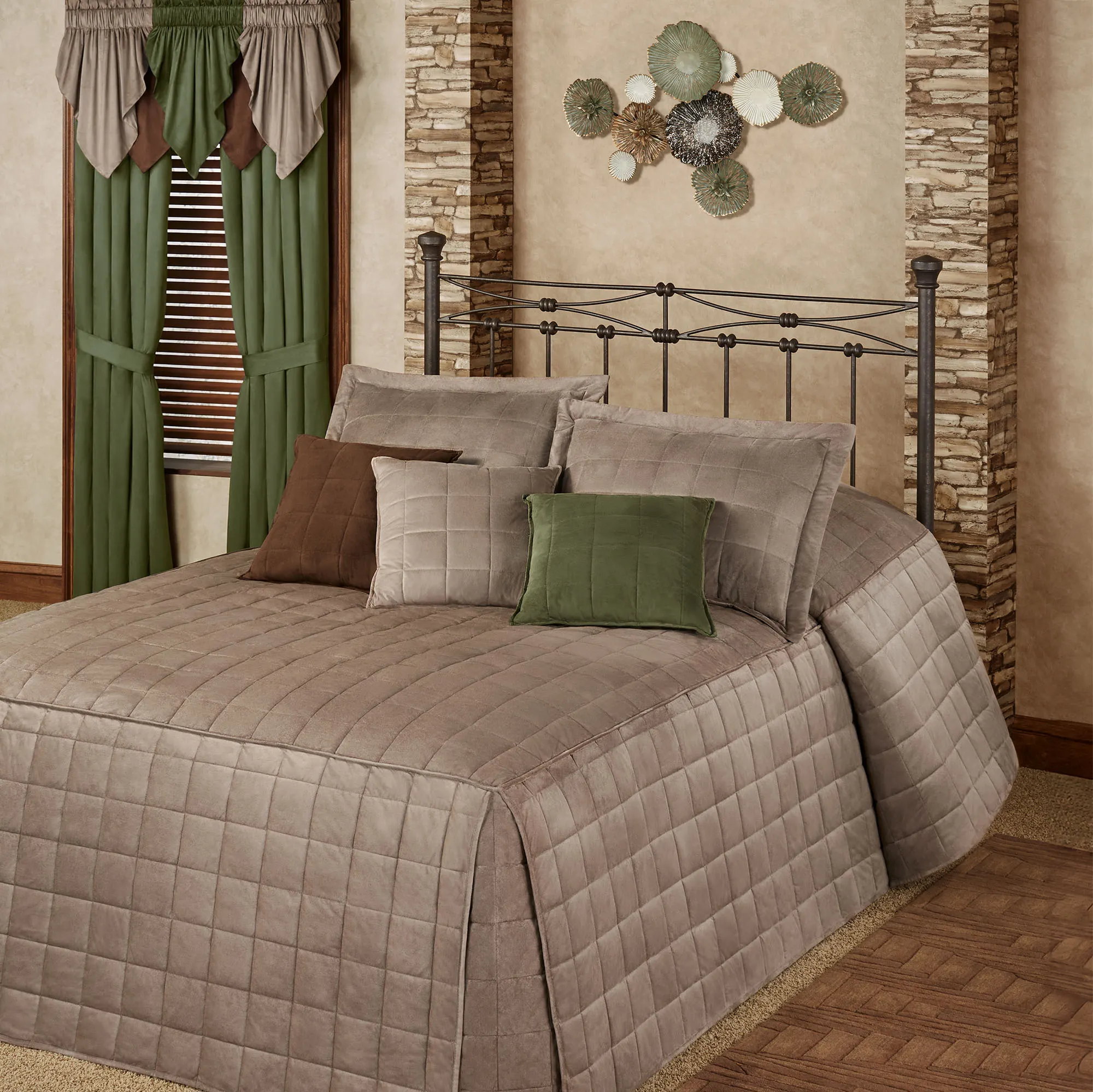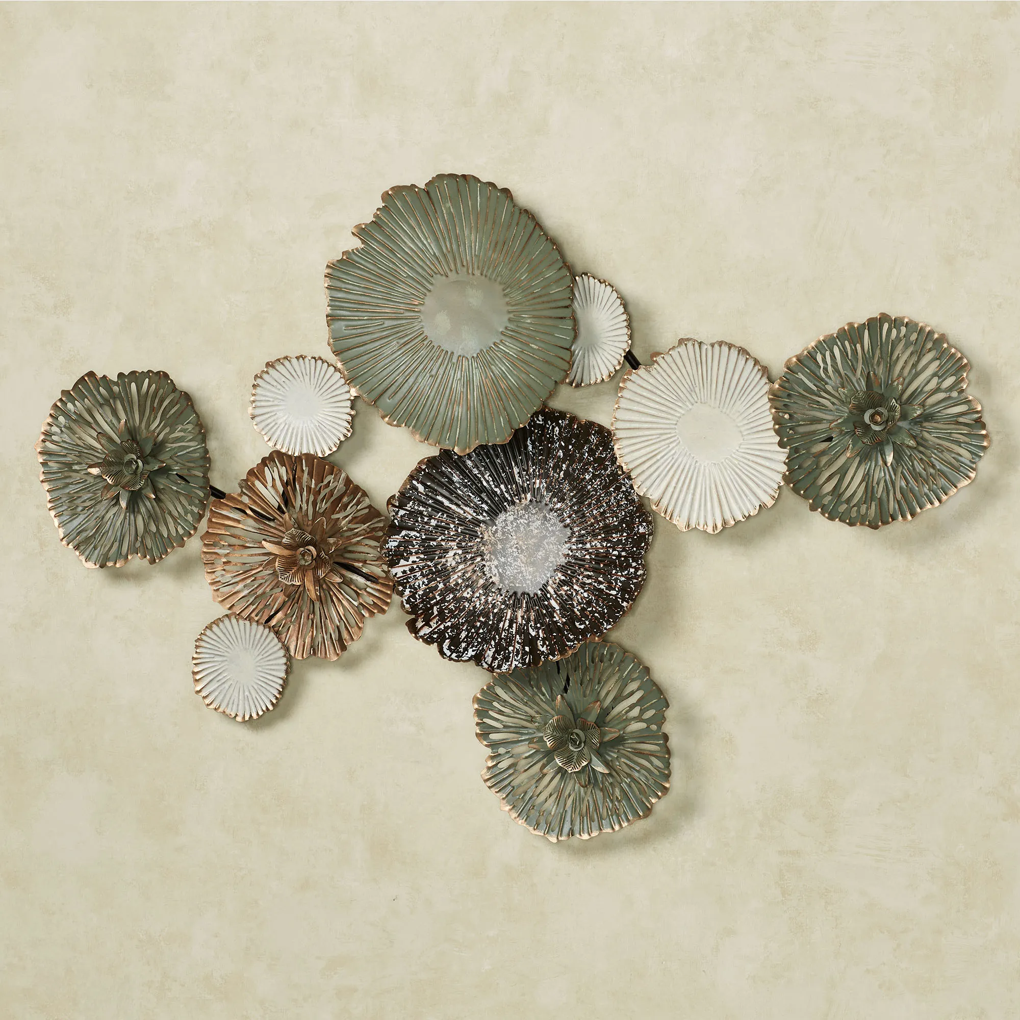 The Brennan Wall Art is a vision of abstract beauty. With a dimensional layered design, the metal wall sculpture features openwork and textured discs that resemble beautiful flowers. Shades of green, dark brown, white, and gold fill the shapes. Artwork may hang in various directions. Measures 34"Wx2.5"Dx24"H.