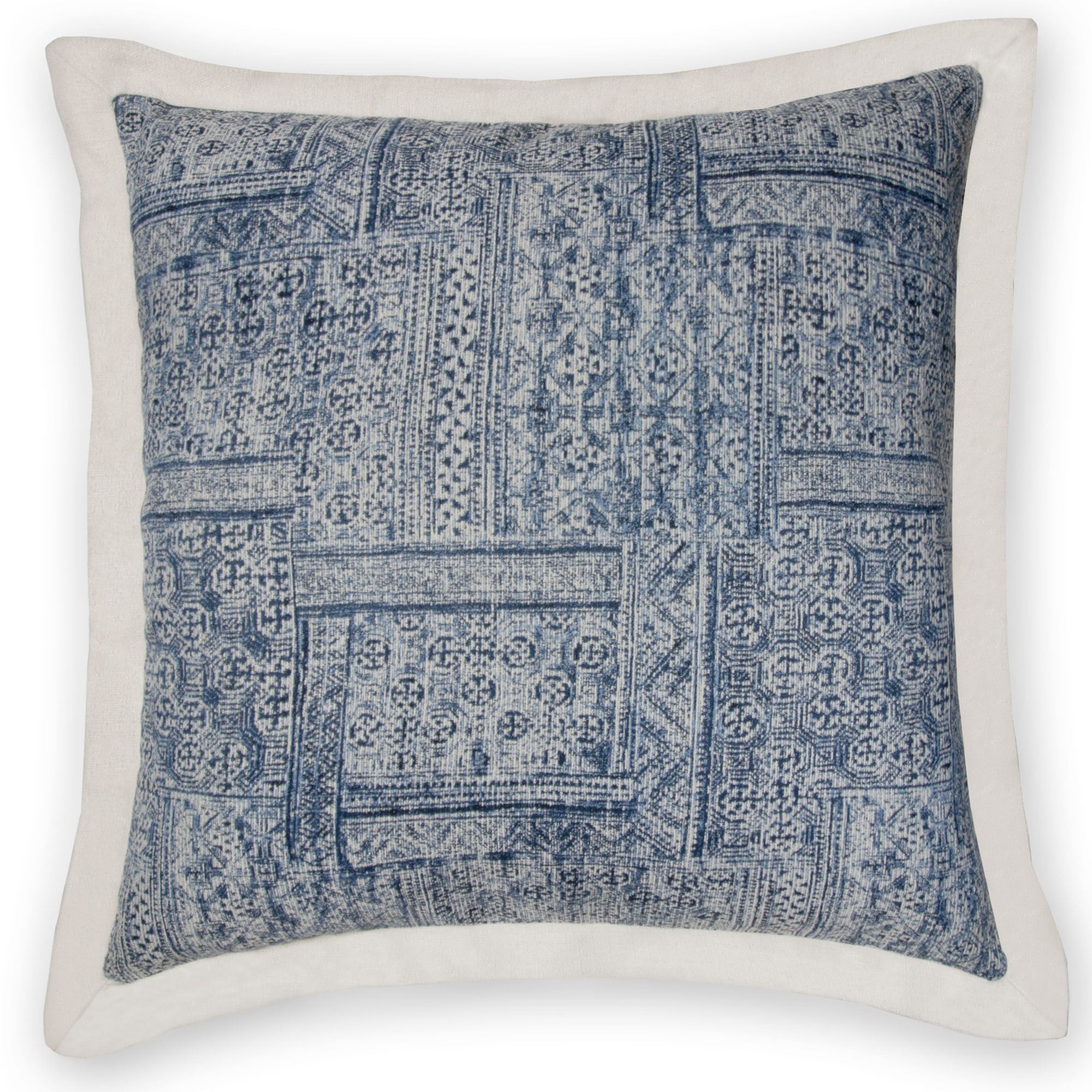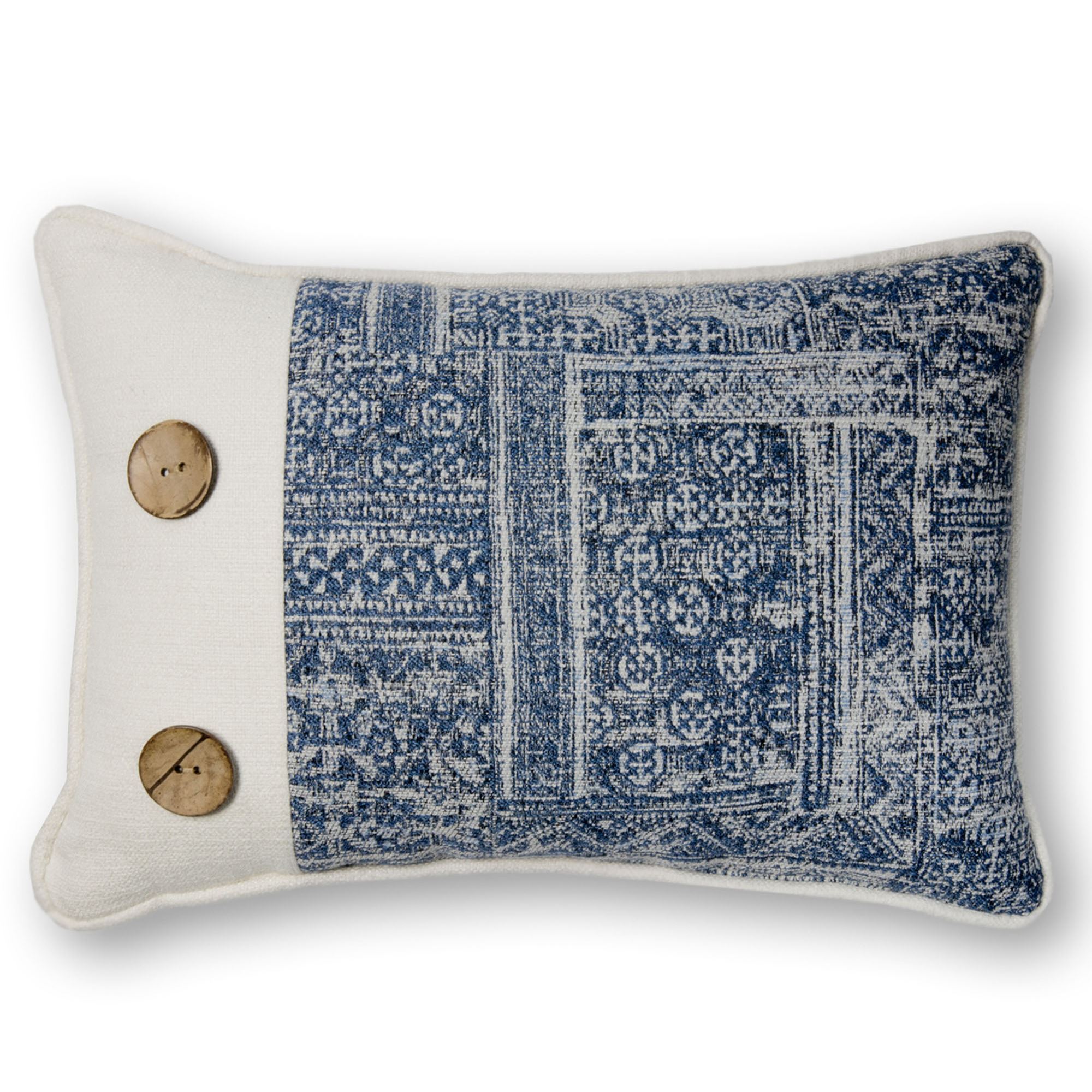 Pillows: Spot clean. The piped Rectangle mimics the comforter and has a solid woven ivory section with wooden buttons. The woven Square is dark blue with flanged ends and is reversible.