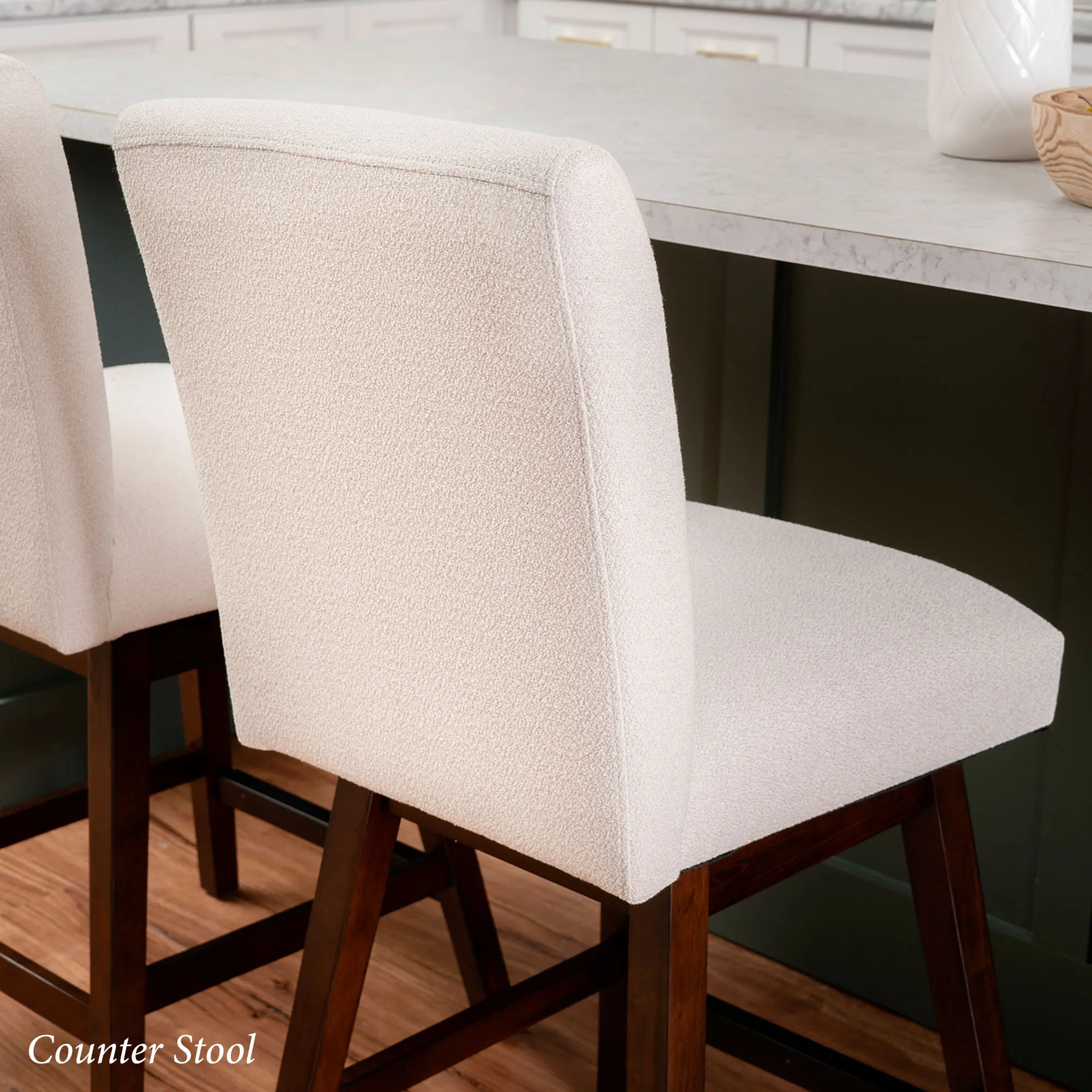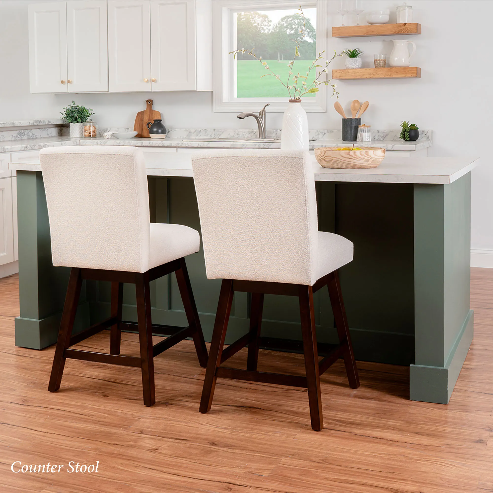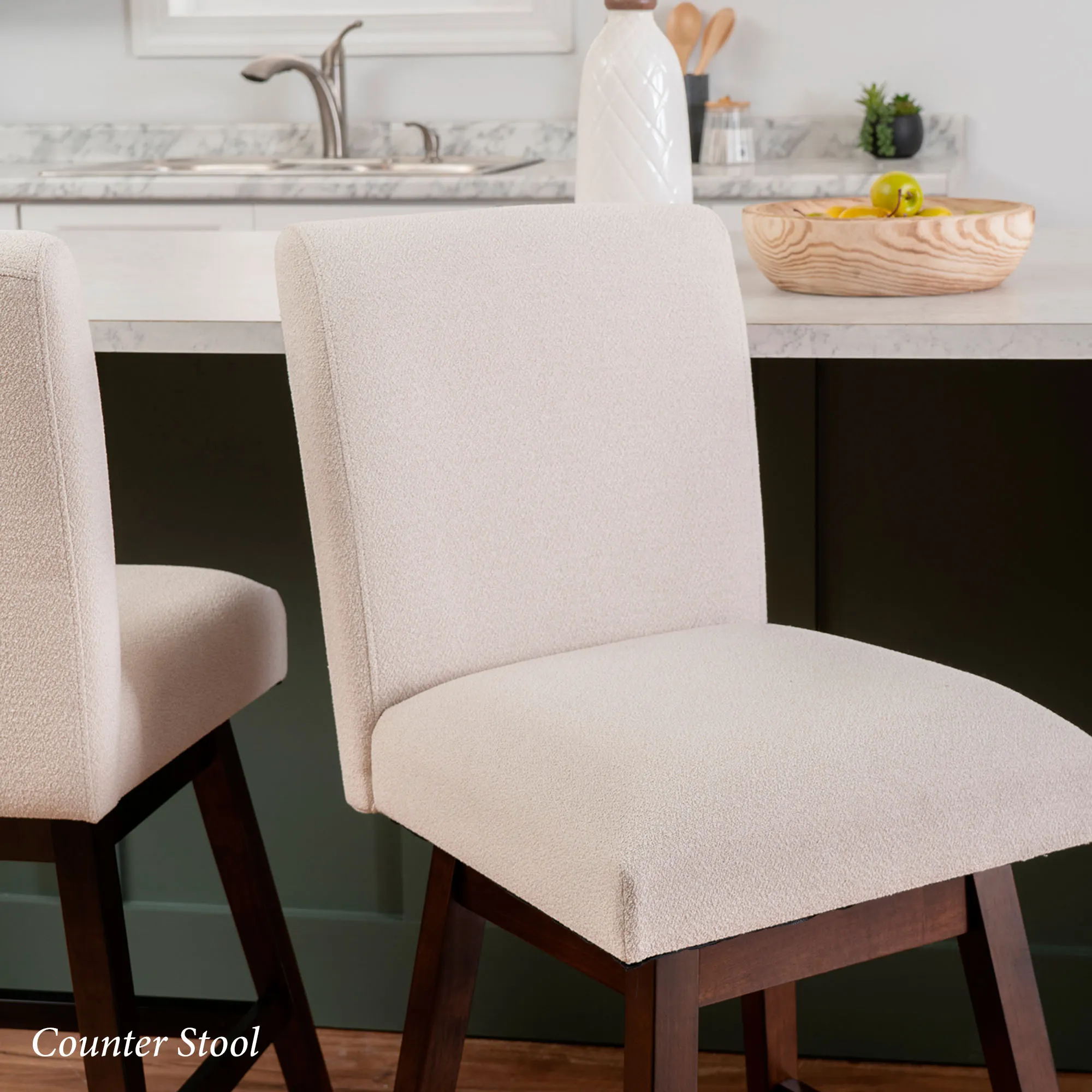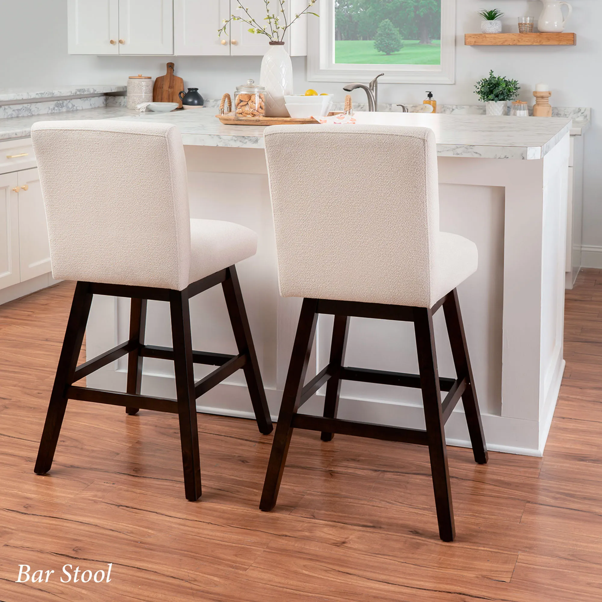 Get comfortable at lunch or snack time with the Bri Swivel Stool Set. These armless stools are covered in ivory woven polyester upholstered fabric, swivel 180 degrees, feature a solid backrest, and have a built-in footrest. The solid wood frame has a rich brown lacquered finish with a protective coating. The Bar Stools are perfect for counters or bars that are 40"-44" high; seat-to-floor height is 30". The Counter Stools are perfect for counters that are 35"-39" high; seat-to-floor height is 26". Each seat is 18.75"Wx16.25"D and has a maximum recommended weight of 275 lbs. Cushion fill is foam. Spot clean the fabric.