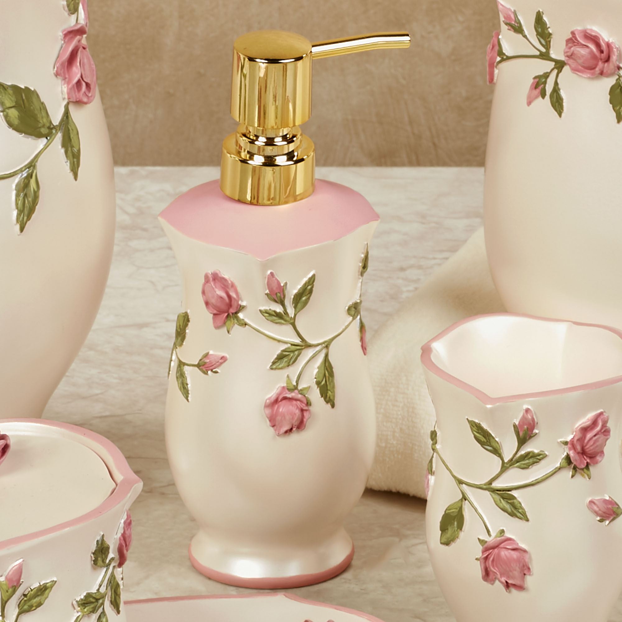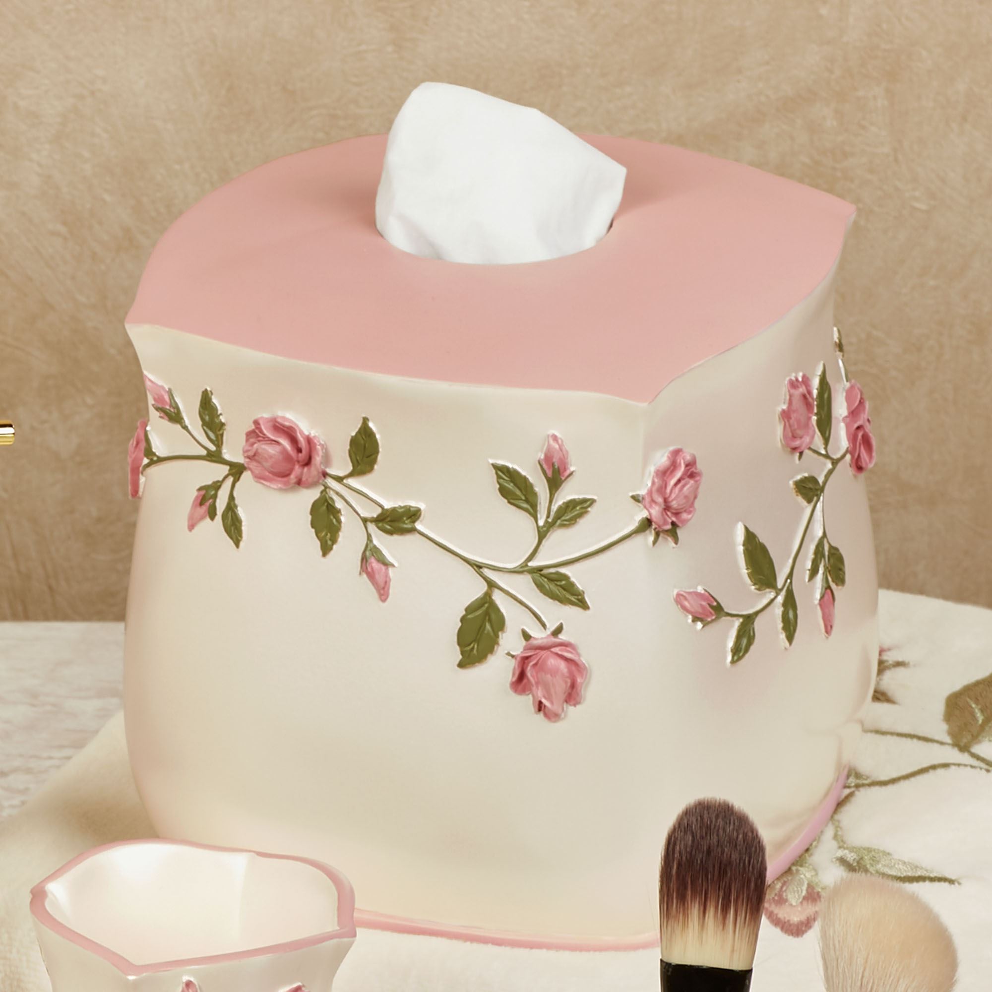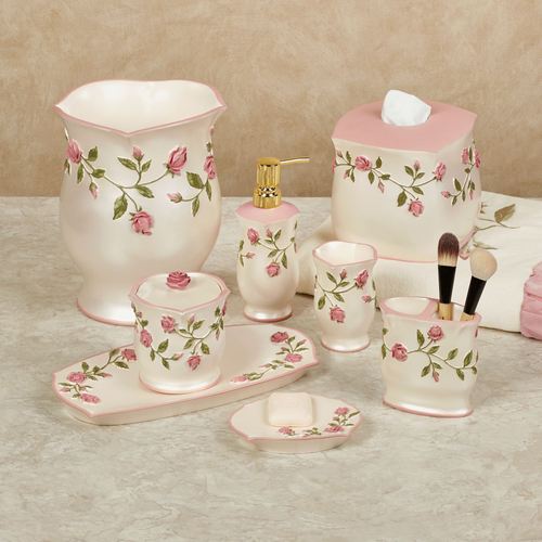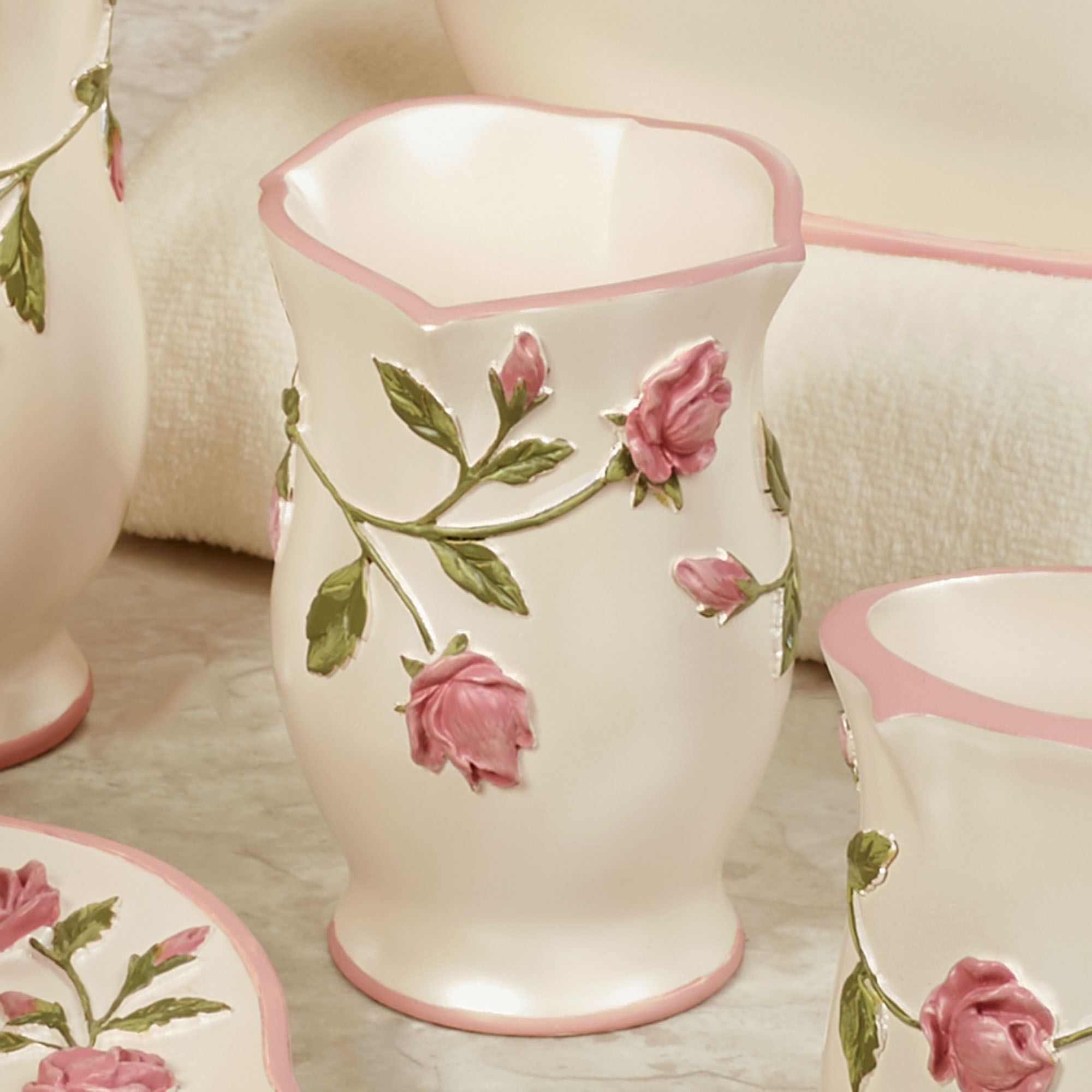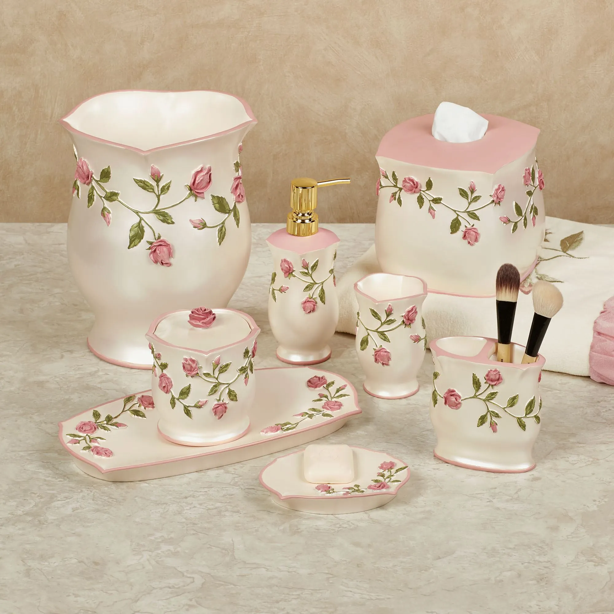 A Bridal Rose blossoms like a sweet promise to decorate your space with charm and grace. Accented with blush trim, these pearlescent resin floral bath accessories feature handpainted dimensional rose blooms and trailing vines across the stylized shape. The Brush Holder can be used to hold your toothbrushes or makeup brushes. The Covered Jar has a rose handle on the removable lid. Specify Wastebasket, Tissue Cover, Tray, Lotion/Soap Dispenser, Covered Jar, Brush Holder, Tumbler, or Soap Dish.