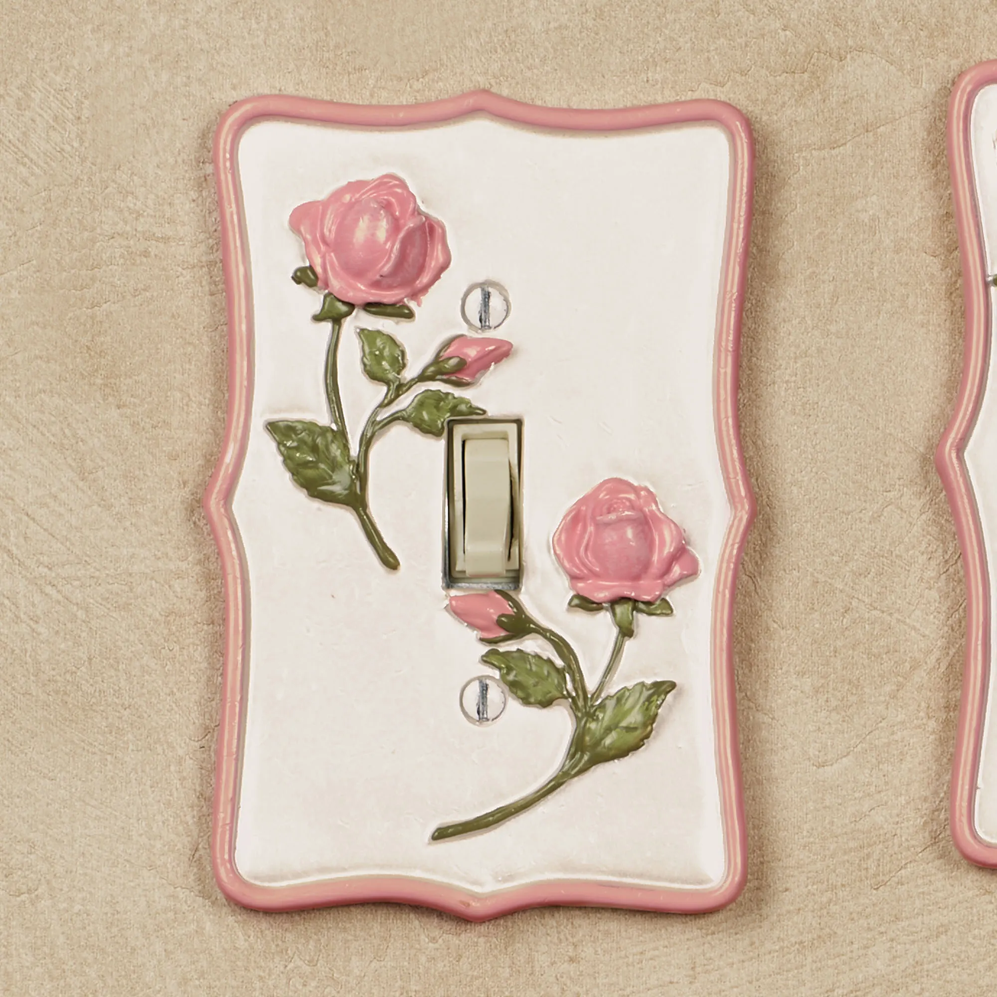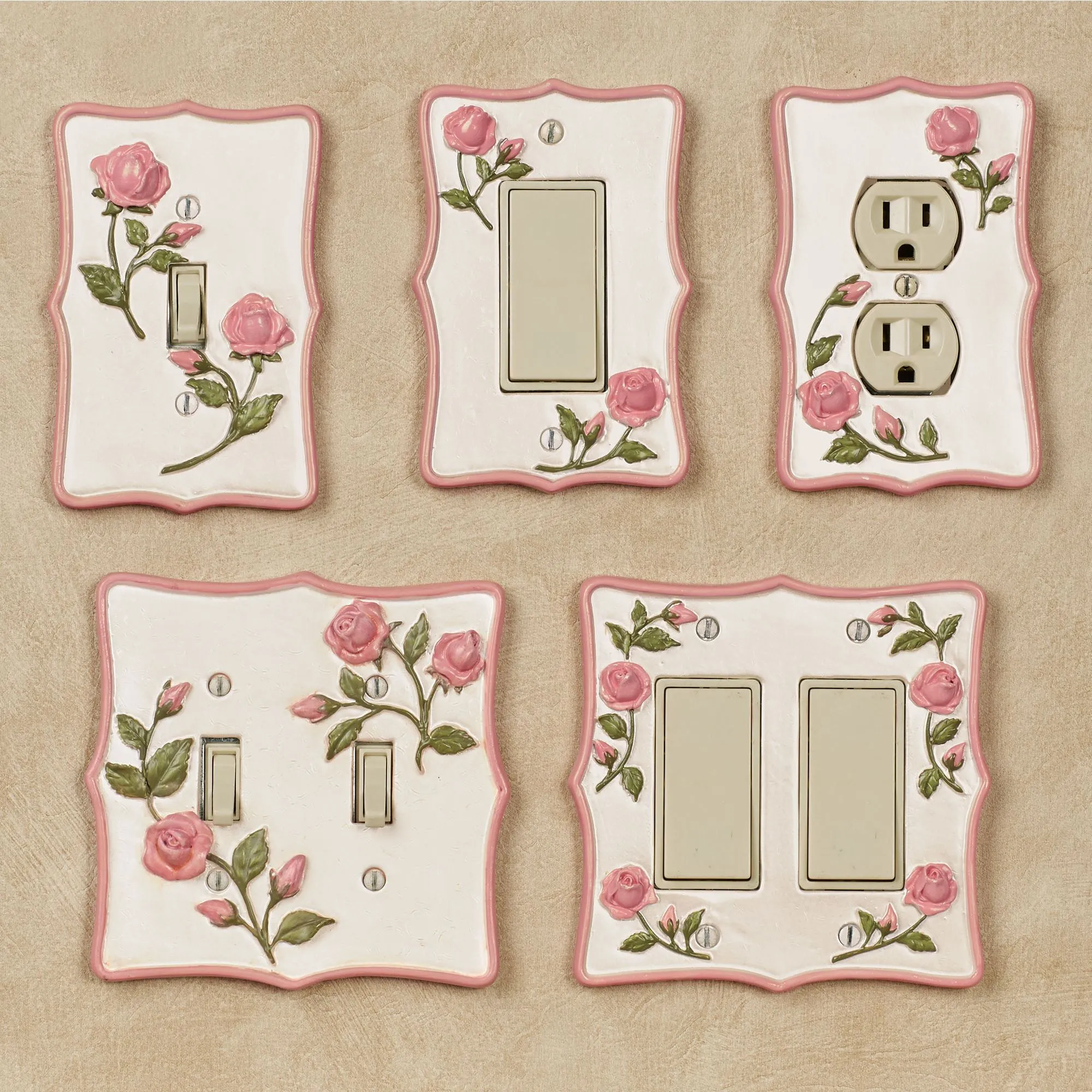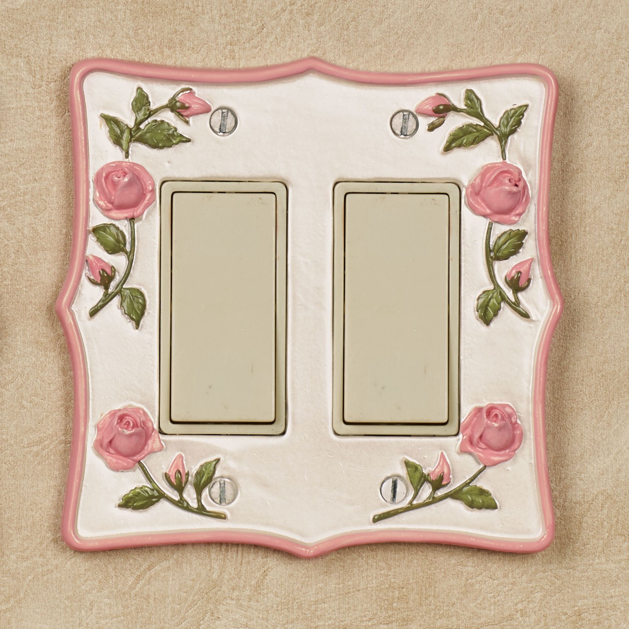 A Bridal Rose blossoms like a sweet promise to decorate your space with charm and grace. Accented with blush trim, each stylized resin floral switchplate features handpainted dimensional blush rose blooms and trailing green vines on a pearlescent background. Each measures 5.25"H. Single Switch, Single Dimmer/Rocker, and Single Outlet measure 3.5"W each. Double Switch and Double Dimmer/Rocker are 5.25"W each. Single Outlet has two sockets. Specify Single Switch, Double Switch, Single Outlet, Single Dimmer/Rocker, or Double Dimmer/Rocker. Do not over-tighten screws.
