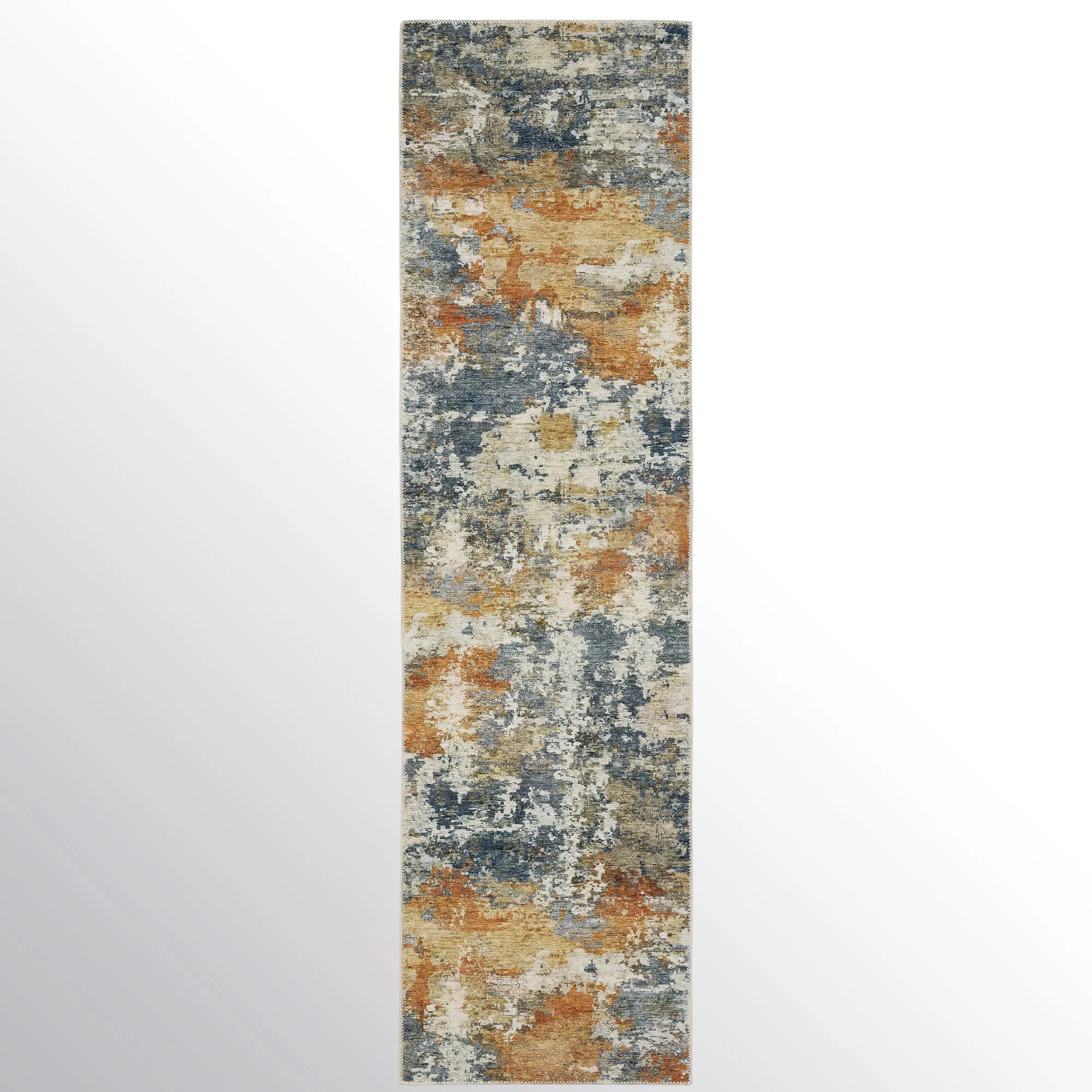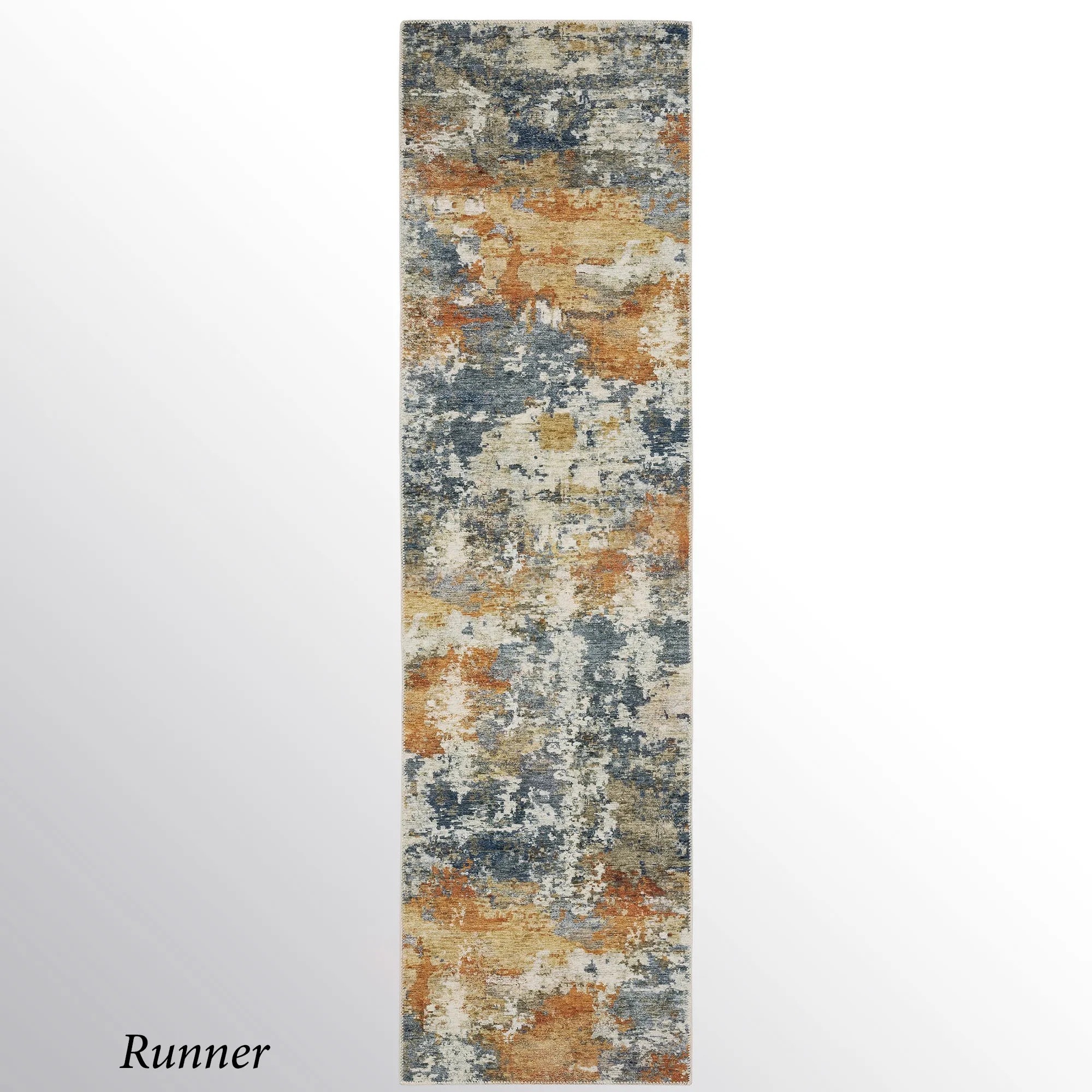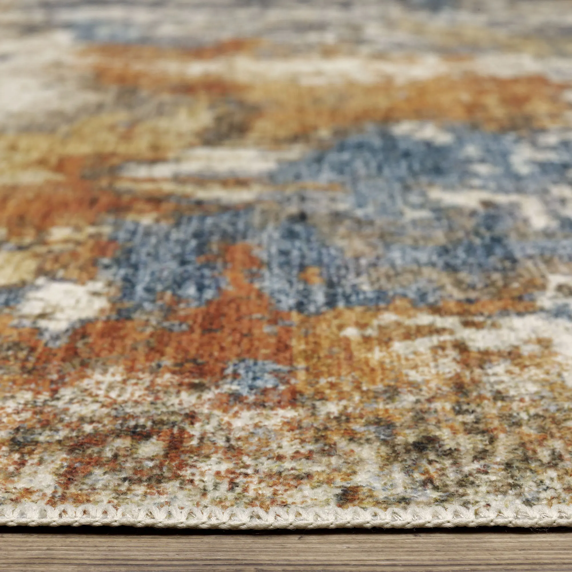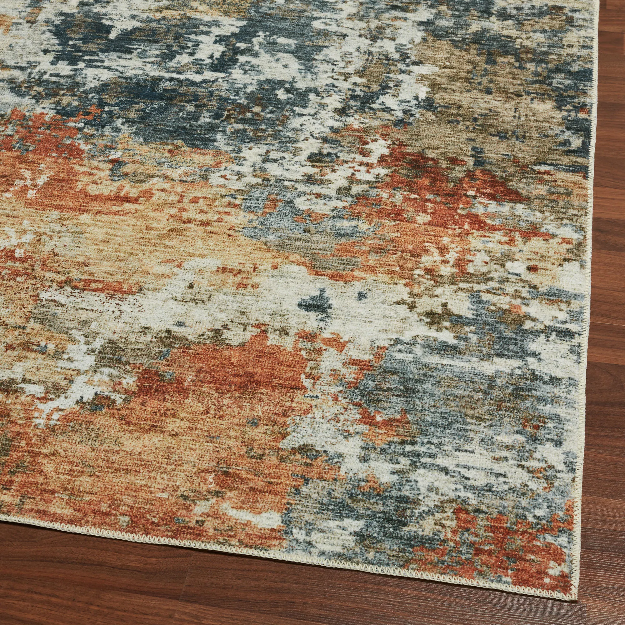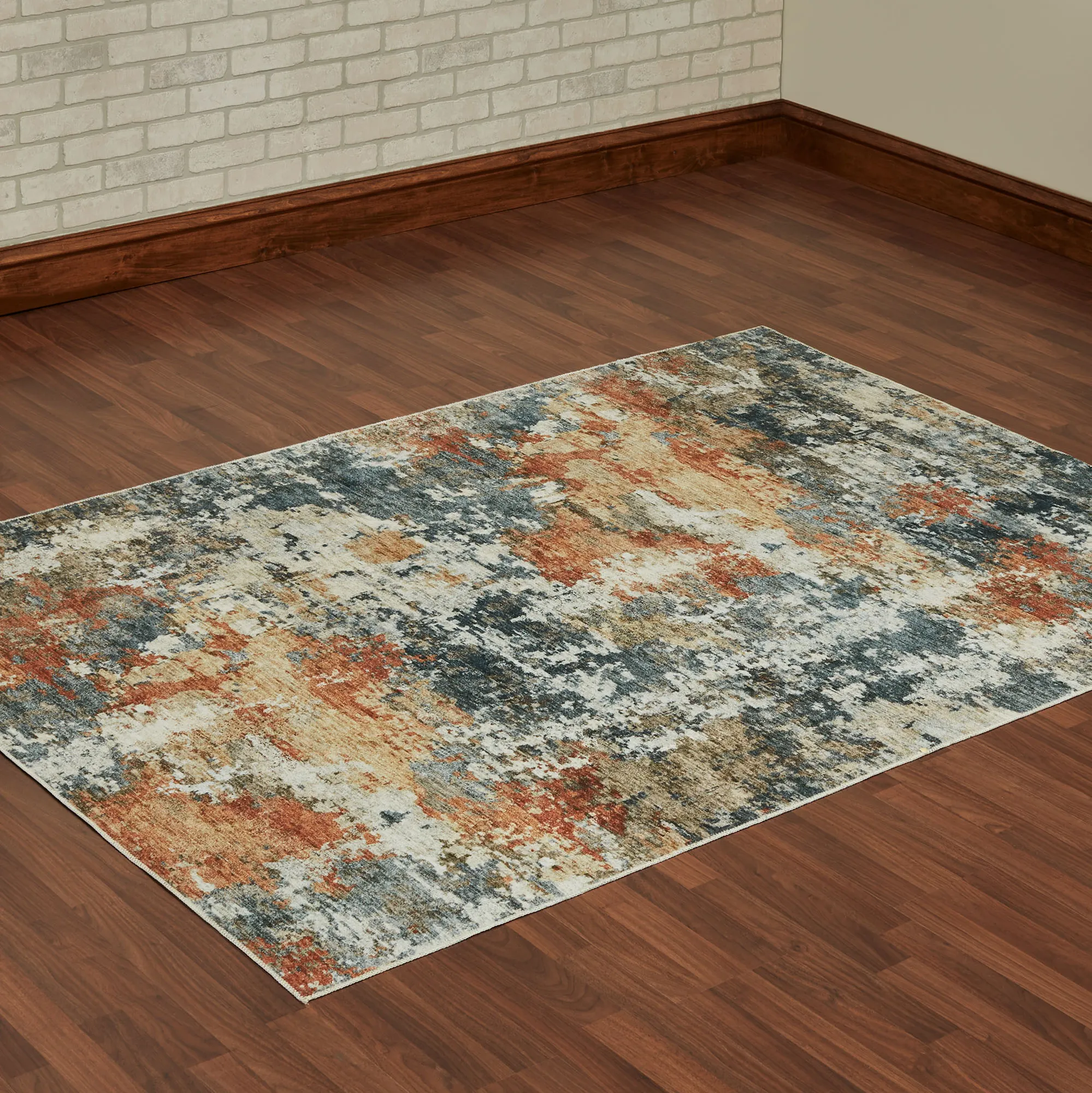 Earthy shades of navy, charcoal, rust, gold, and ivory mingle together to create the abstract design on the Brielle Rug. Power-loomed polyester area rug, .12" thick, has a nonskid backing. Machine washable; follow the manufacturer's instructions. Imported.