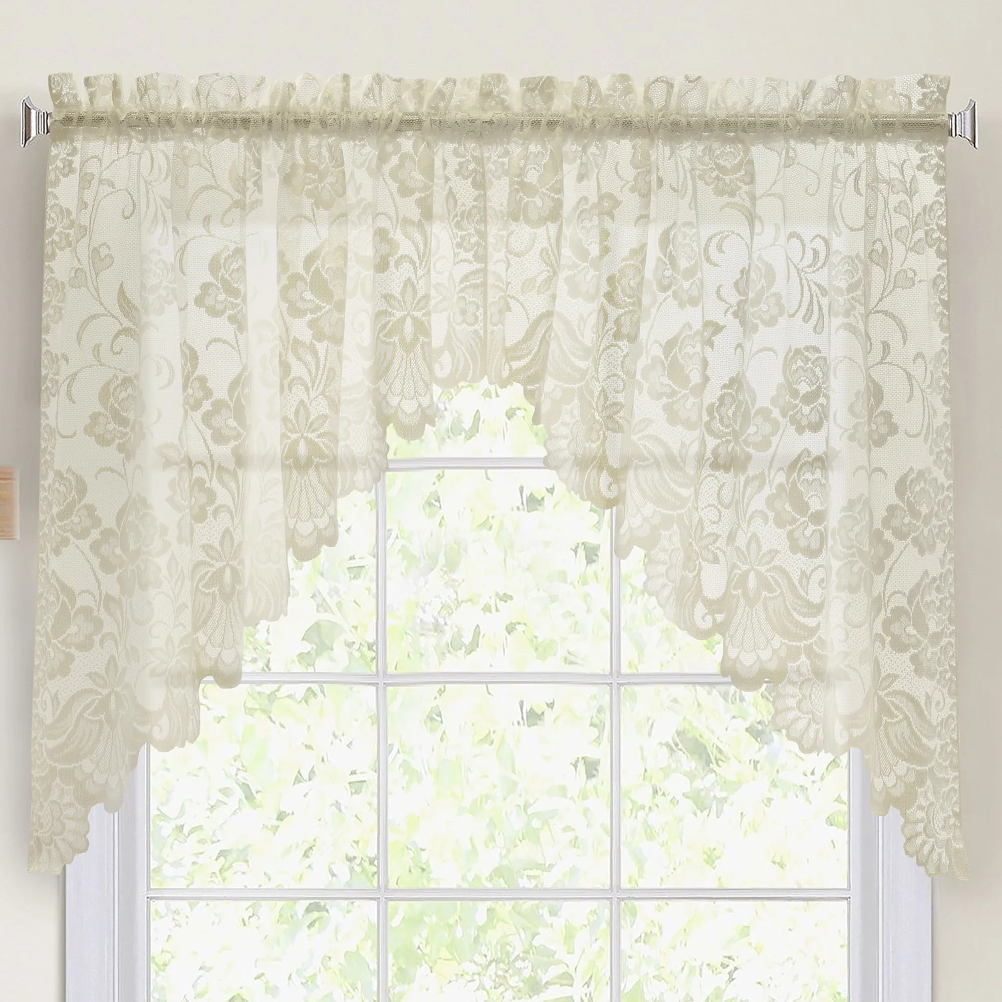 The scrolling leaf and floral pattern on the Brierley Lace Window Treatment is classy and elegant. The polyester jacquard lace window treatment has a scalloped bottom and selvedge sides. Single Curtain Panel is still available; sorry, the Swag Valance Pair, Tailored Valance, Balloon Shade, and Tier Pair are no longer available. Rod pocket is 1.5". Machine washable. Imported.