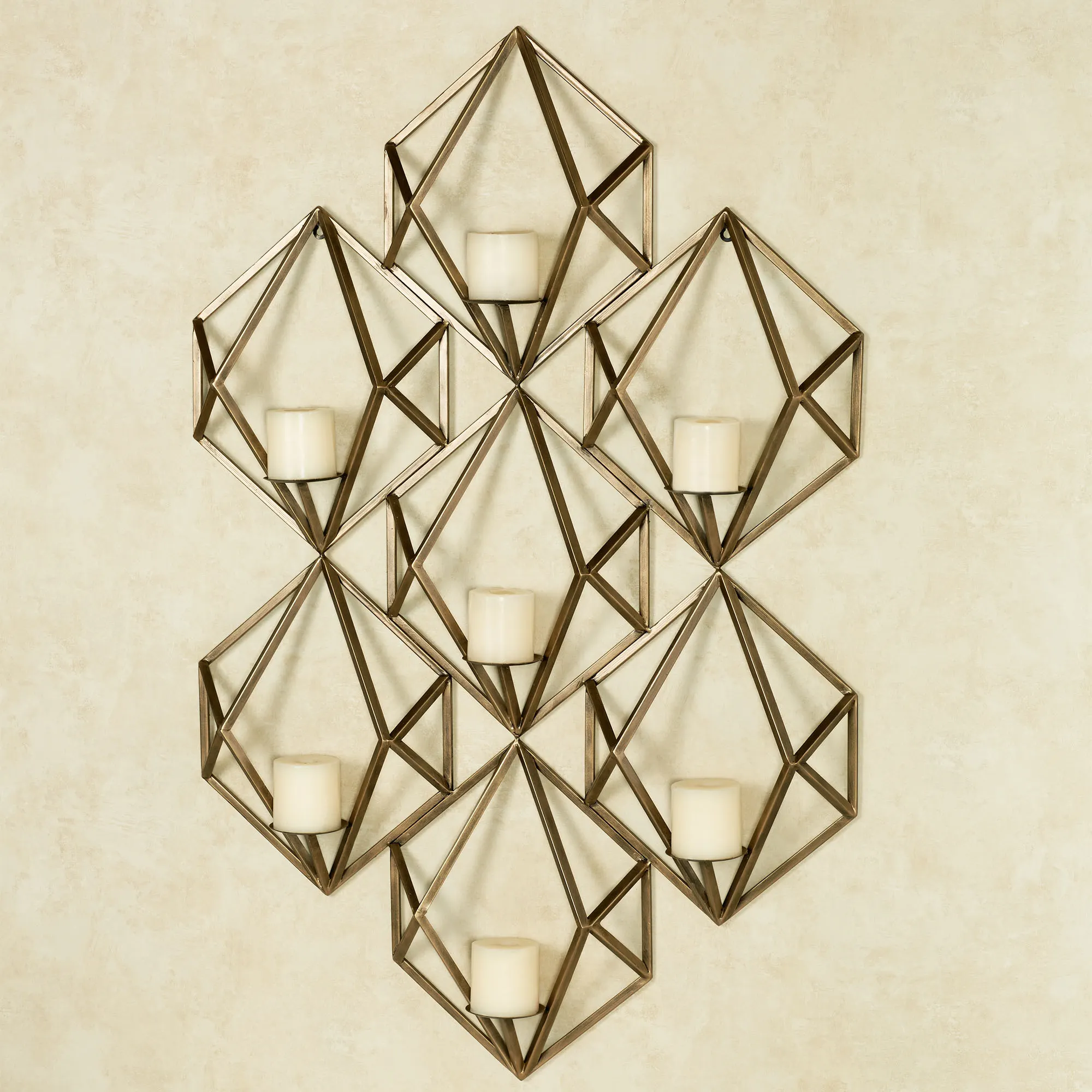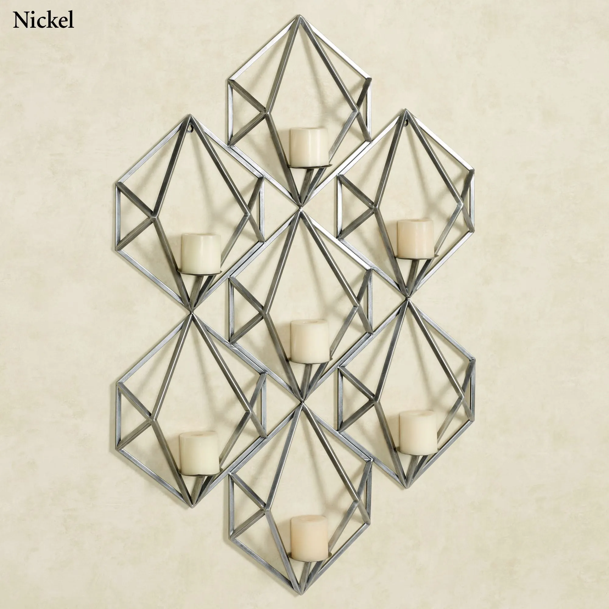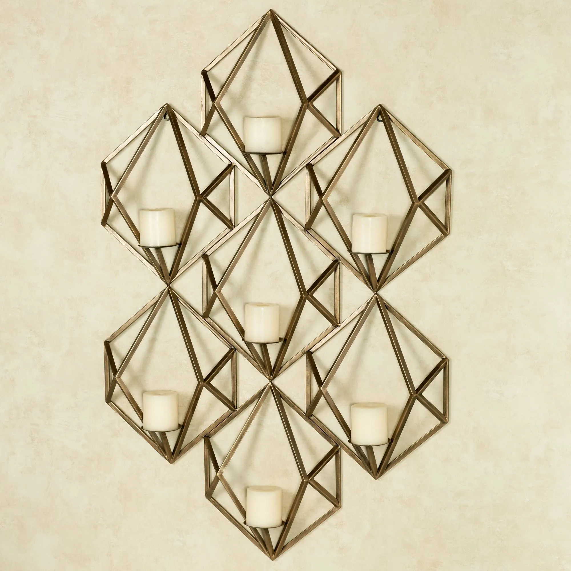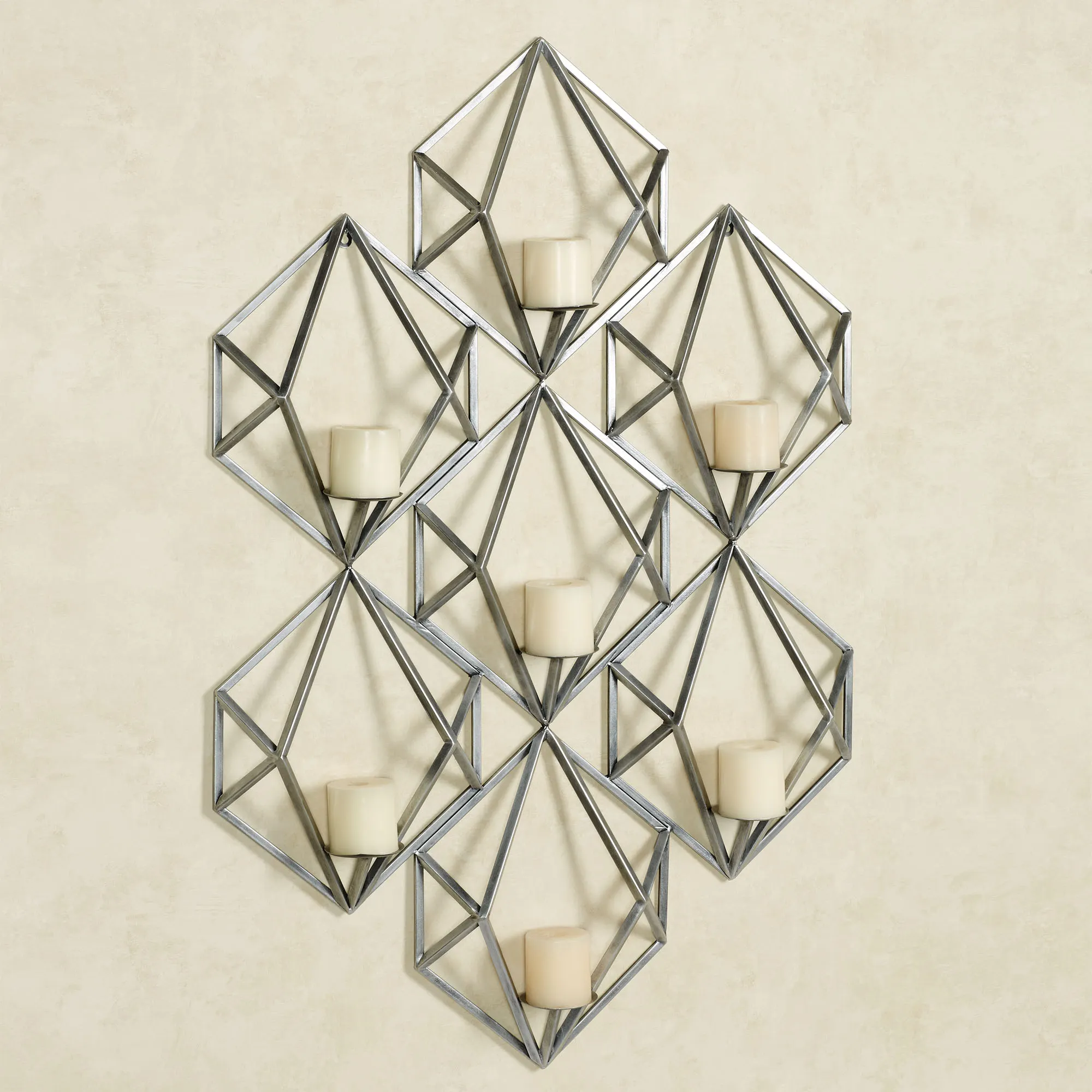 The simple geometric lines from the Bright Stars Candelabra Wall Art will add volume and depth to a wall of your home. With a metallic glint, the metal wall candelabra brings contemporary abstract beauty to your space as it holds your seven 3" dia. candles within openwork prisms. Measures 31"Wx3.5"Dx46"H.