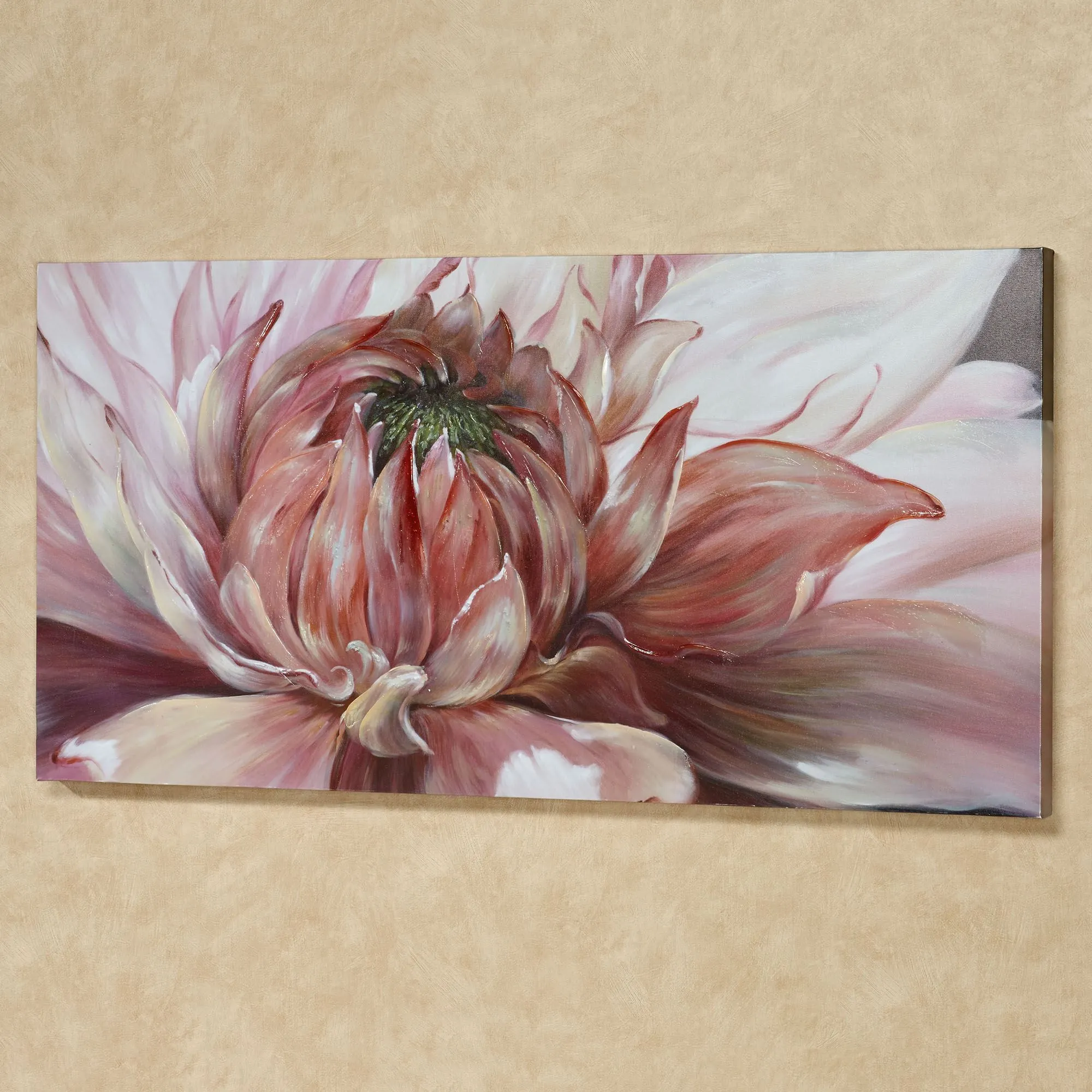 This Brilliant Bloom unfurls thin layered petals and unveils its true beauty within this floral wall art. Gallery-wrapped over a wood frame, the giclee canvas wall art features a blossoming pink chrysanthemum accented with neutral shades in a sunlight effect. A loden green center and handpainted colored gel embellishments on each petal tip complete the lush design. Floral wall art measures 47"Wx2"Dx24"H.