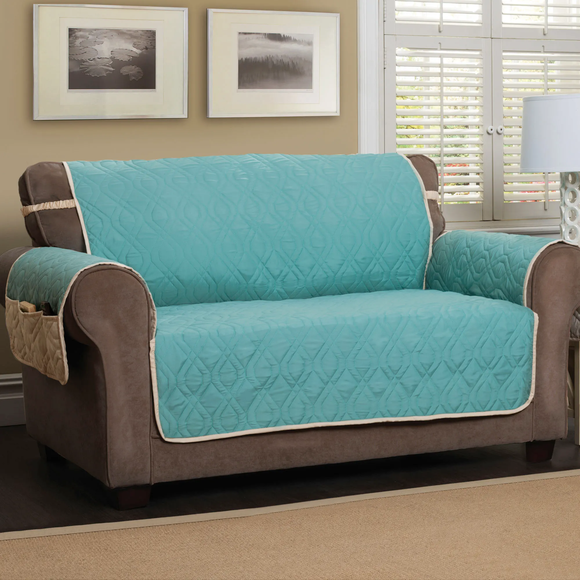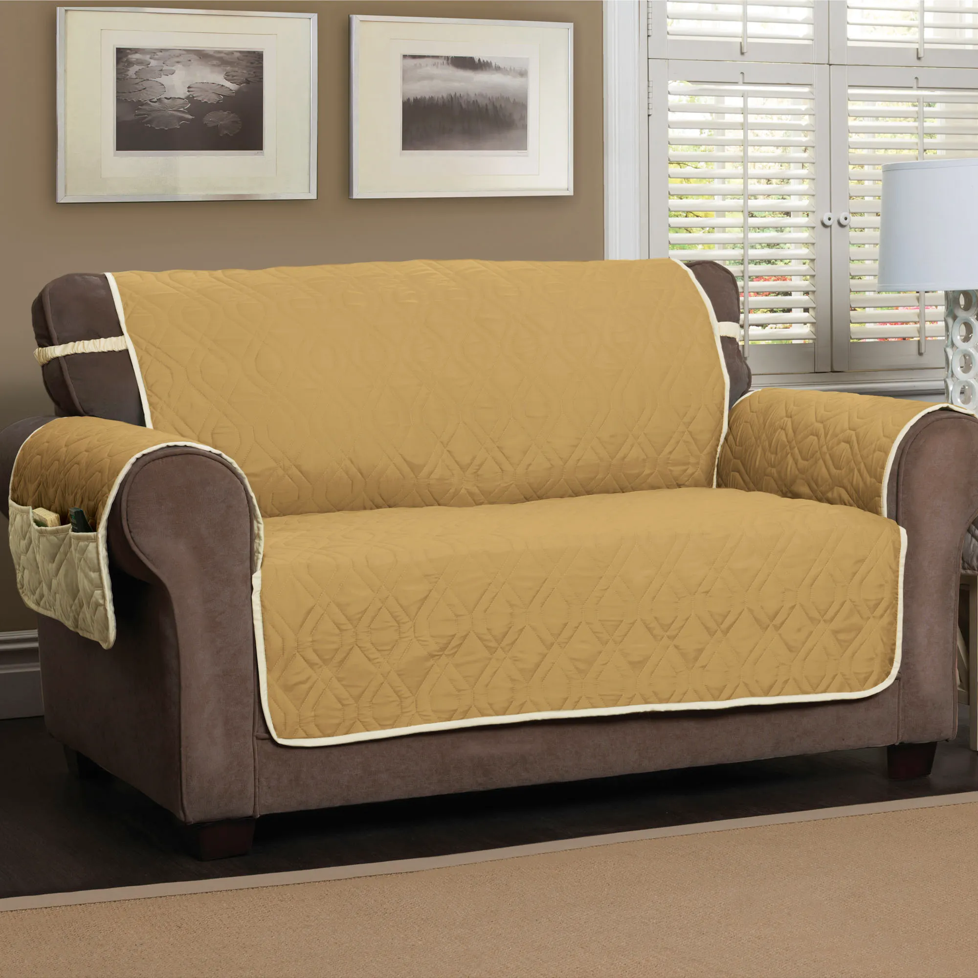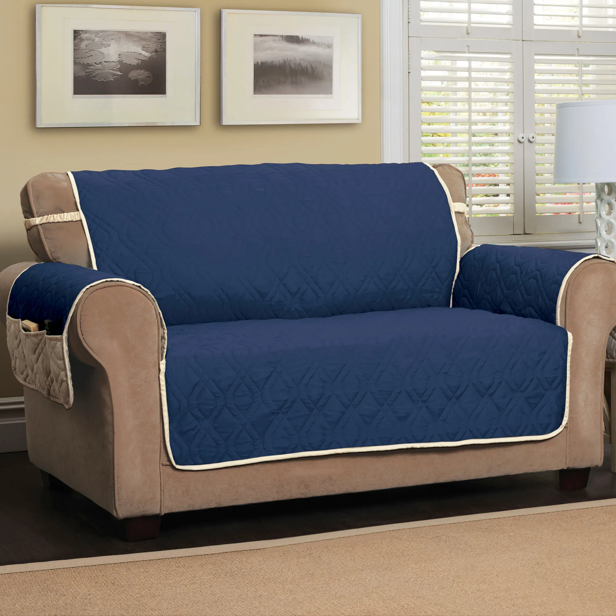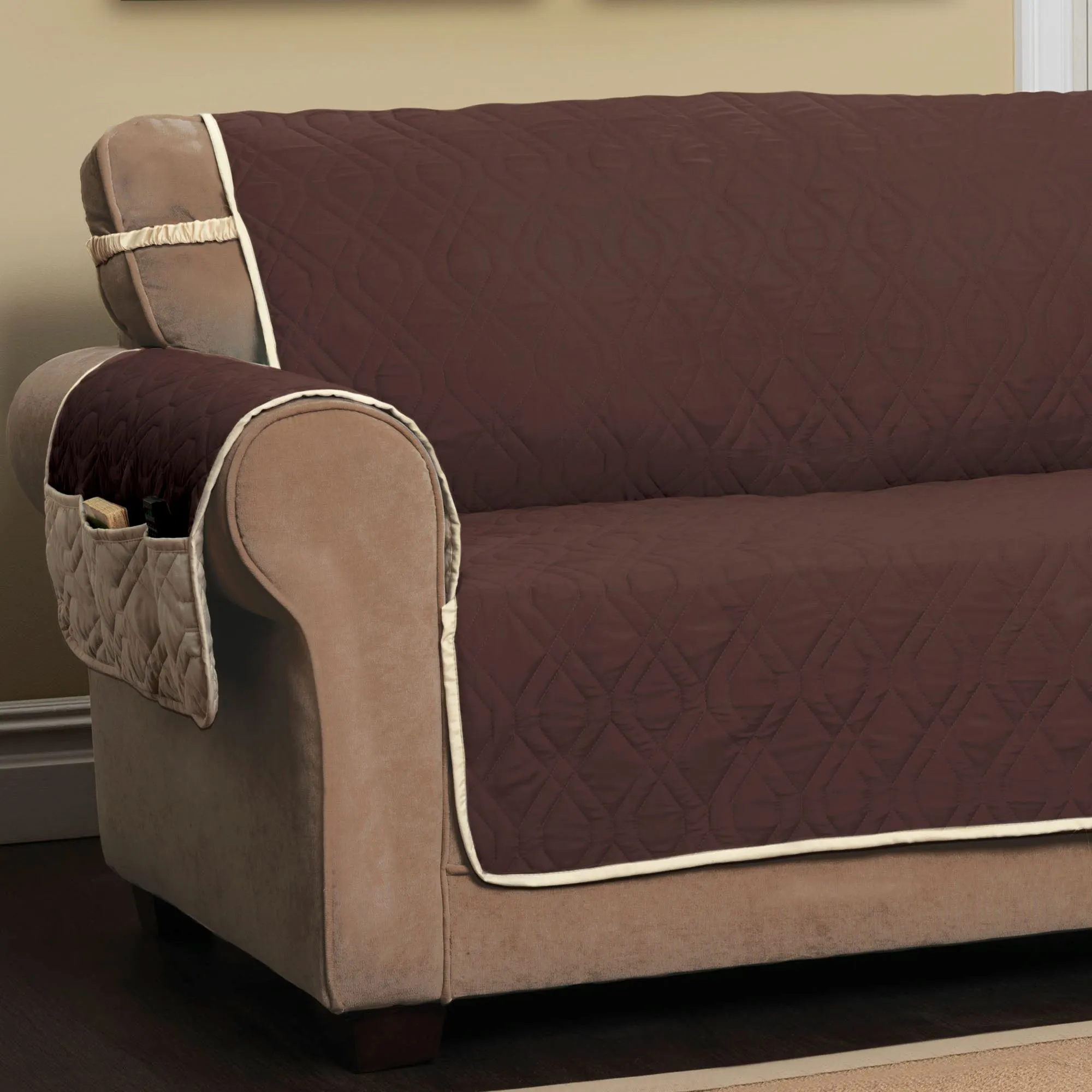 The Brilliant Furniture Protector adds a touch of color to your living area. This water-resistant, polyester microfiber cover has diamond quilting; a divided storage pocket for remotes, tablets, or magazines; longer arm coverage; and covered elastic straps. Cover is reversible to solid ivory. Back is polyester microfiber. Specify Loveseat Cover, Sofa Cover, or Extra-Long Sofa Cover. Choose Harvest Gold, Navy, Peridot, Sunset, or Teal; sorry, some color/size combinations are no longer available. Fill is polyester fiberfill. Machine washable. Imported.
