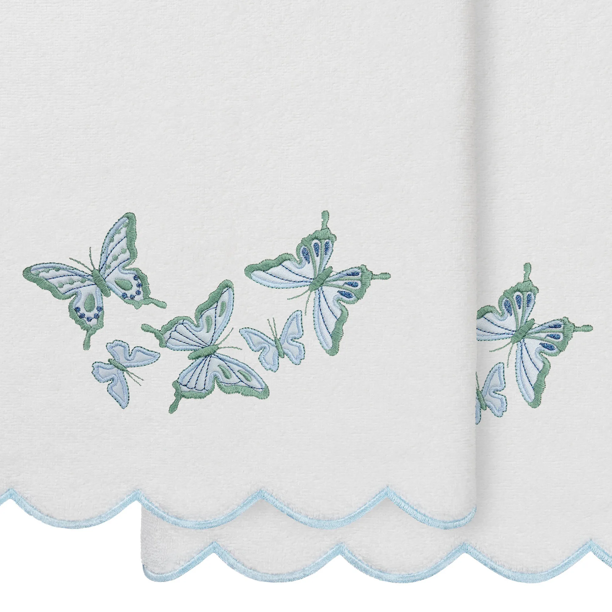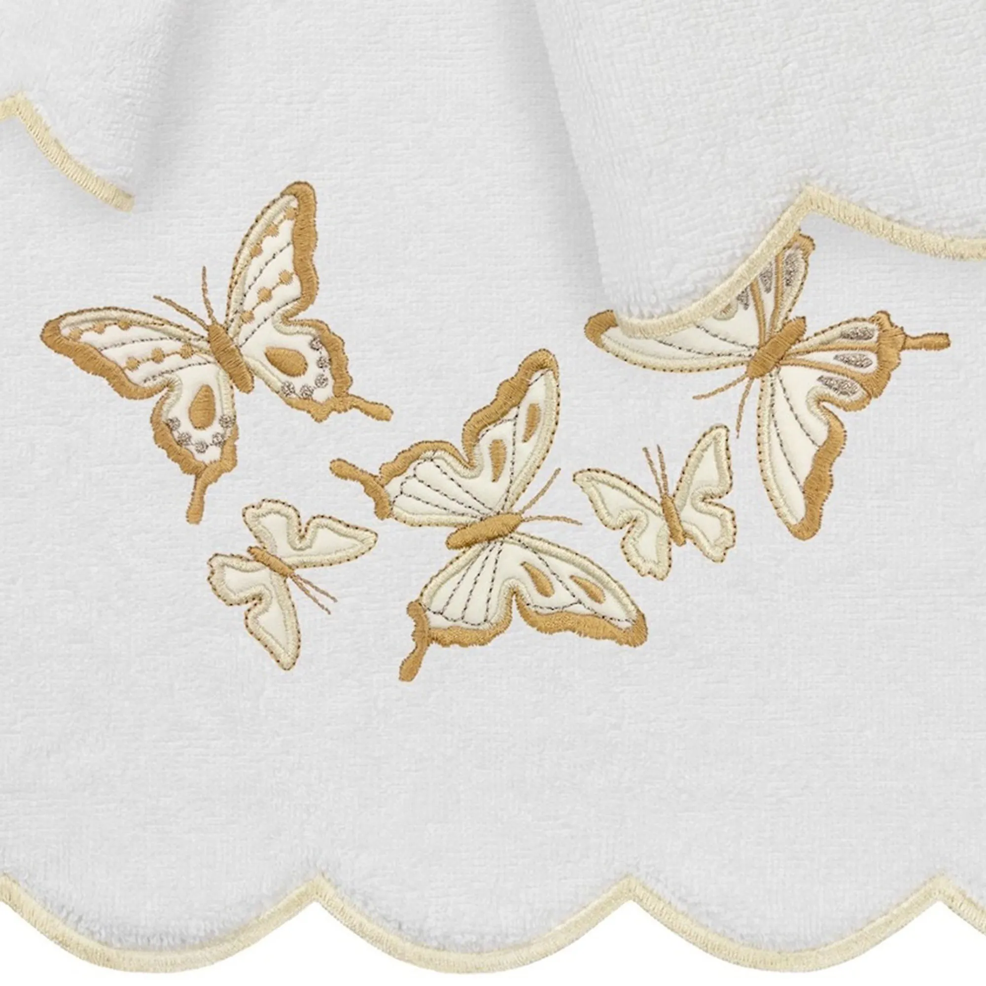 Charming butterflies flutter about on the Britney Bath Towel Set. These super-absorbent and quick-drying towels are made from premium Turkish cotton and have 500 GSM. Towels feature applique embroidered butterfly motifs on white and have scalloped edging with embroidery. These super-soft towels are durable and keep their plush appearance after washing. Gold has gold and cream butterflies and cream edges. Blue has blue and green butterflies and blue edges. Green has green and blue butterflies and green edges. Pink has pink and purple butterflies and pink edges. The three-piece towel set includes one bath towel, 27"x54"; one hand towel, 16"x30"; and one fingertip towel, 11"x18". Machine washable. Imported/USA.