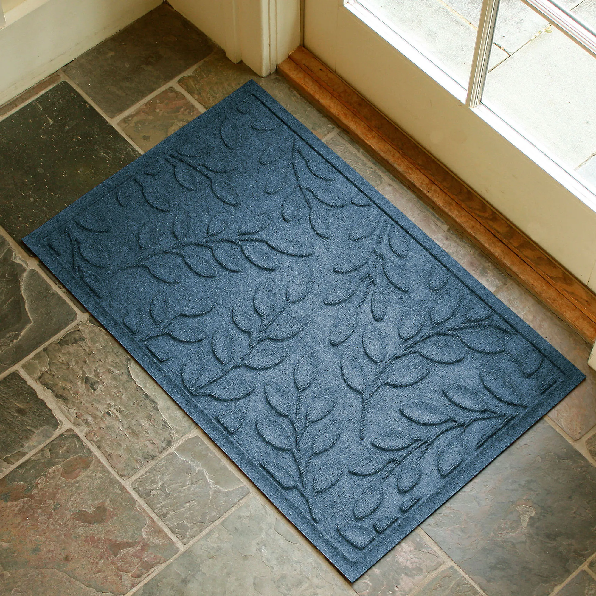 Timeless charm vines from the Brittney Leaf Indoor/Outdoor Doormat. Proudly made in the USA, the .5" thick, molded design features scattered leafy vines for a classic, natural appeal. The antistatic PET polyester floor mat has a skid-resistant SBR rubber backing that is slip-resistant and certified by the National Floor Safety Institute. The WaterHog(R) exclusive Water Dam border keeps dirt and water on the mat and not your floor. The design is mildew-, mold-, and rot-resistant to withstand indoor or outdoor year-round use. Specify Khaki, Burgundy, Charcoal, Dark Brown, Dark Green, Gray, Navy, or Slate Blue. Doormat is 35"x23". Shake to remove dirt; hose off to clean.