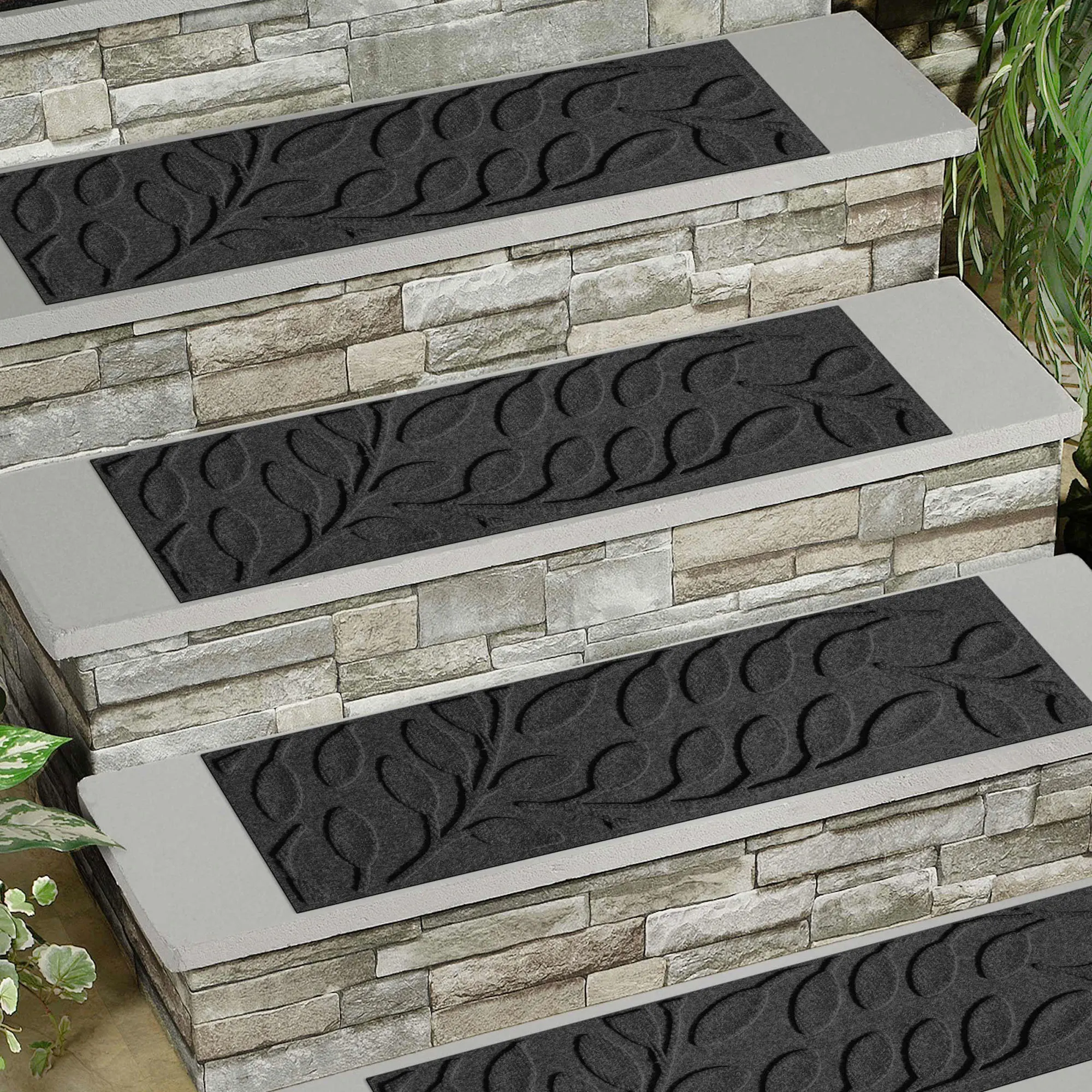Timeless charm vines from the Brittney Leaf Indoor/Outdoor Stair Tread Set. Proudly made in the USA, the .5" thick, molded design features scattered leafy vines for a classic, natural appeal. The antistatic PET polyester stair treads have a skid-resistant SBR rubber backing that is slip-resistant and certified by the National Floor Safety Institute. The WaterHog(R) property keeps dirt and water on the treads and not your floor. The design is mildew-, mold-, and rot-resistant to withstand indoor or outdoor year-round use. Specify Dark Green, Burgundy, Charcoal, Dark Brown, Gray, Khaki, Navy, or Slate Blue. Stair treads are each 30"x8.5"; sold as a four-piece set. Shake to remove dirt; hose off to clean.