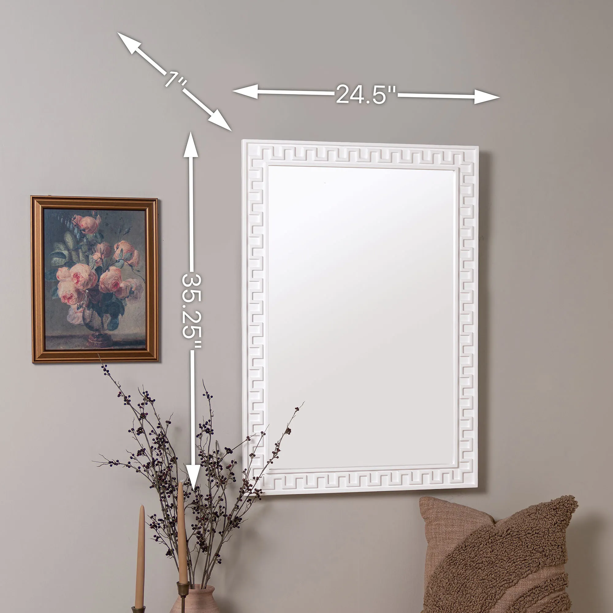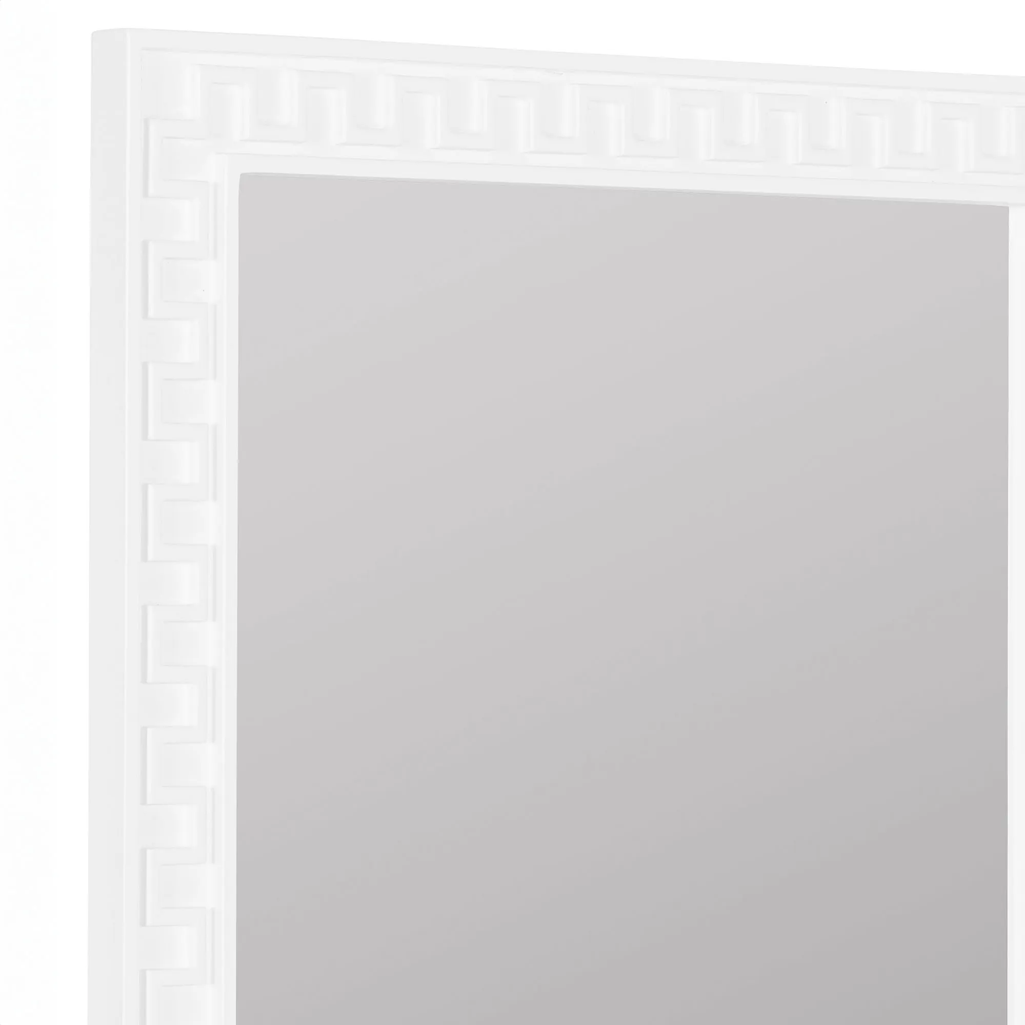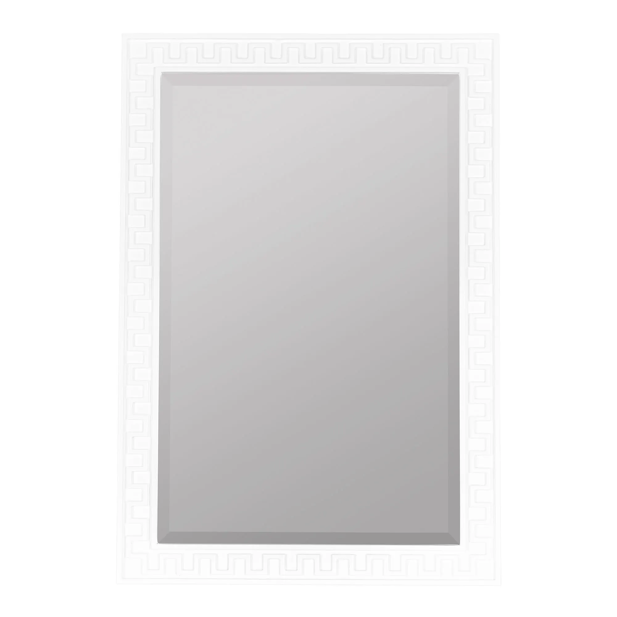 Chic geometric detailing styles the Brook Wall Mirror with a sleek simplicity. Designed by Erin Gates, the rectangular resin frame features a classic white finish, key-inspired motif, and dimensional appearance. Center glass mirror measures 19"Wx30"H. May hang vertically or horizontally. Overall, the wall mirror measures 25"Wx1"Dx35"H and weighs approx. 14 lbs.