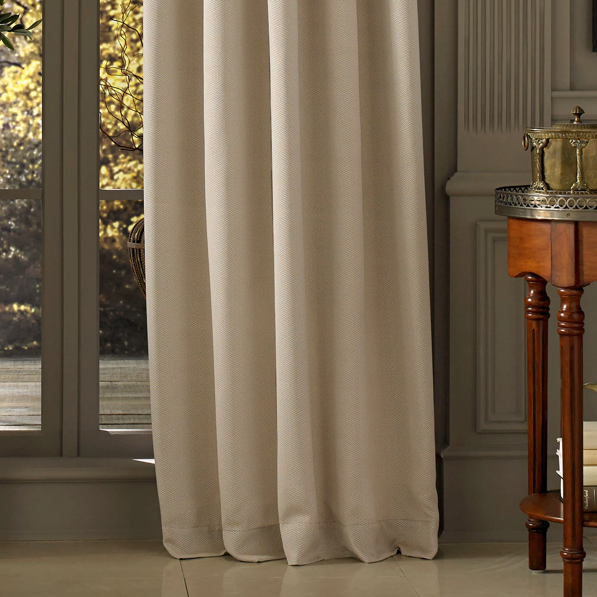 • Window treatment features a textured woven pattern