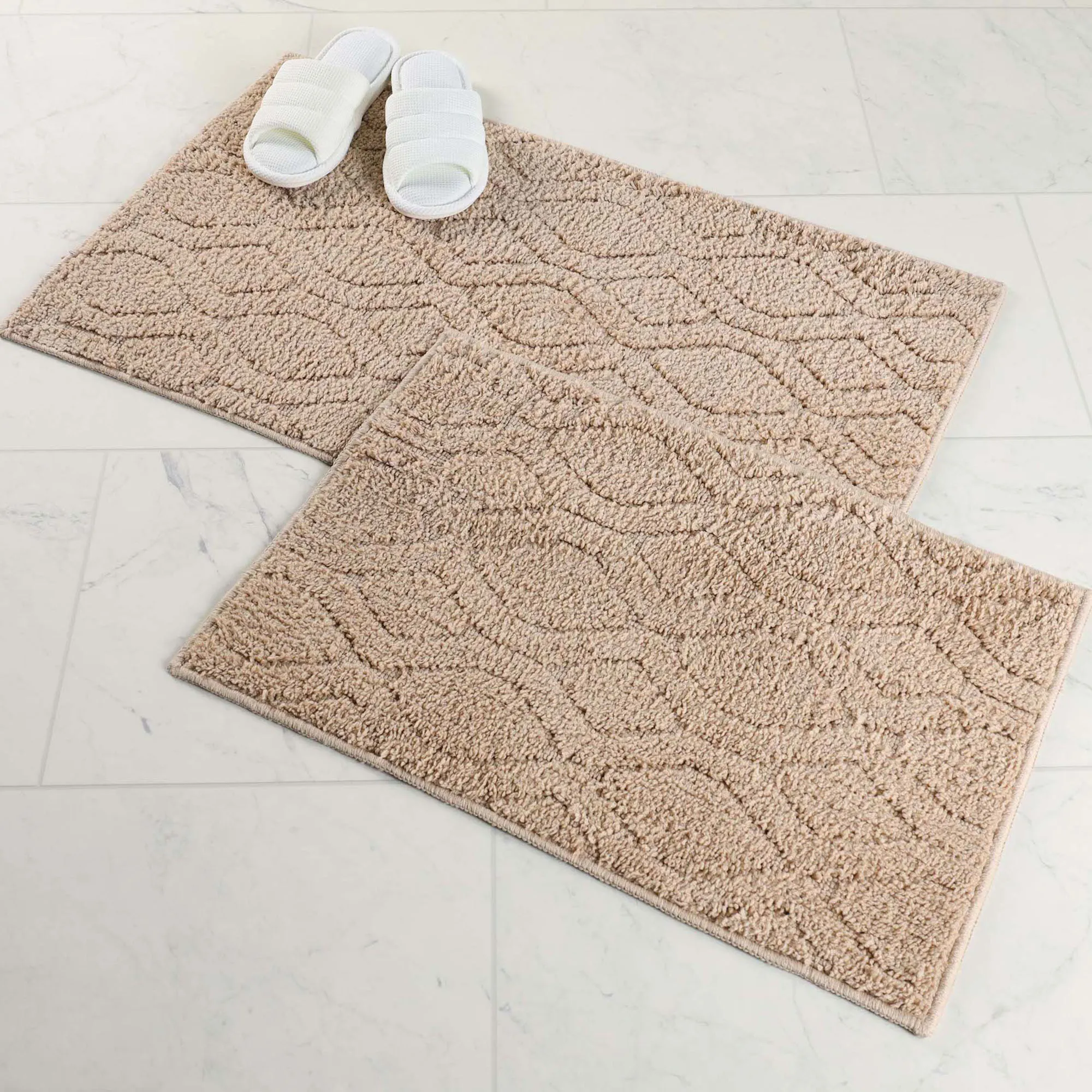 The Brou Bath Rug Set is a modern display of elegance. This polyester set of rugs is OEKO-TEX(R) Standard 100 certified and has been tested and verified free of harmful substances. Each soft and durable rug is .39" thick, features a hi-lo diamond lattice pattern, and has a nonslip rubber backing. The Medium bath rug set of two consists of one 17"x24" rug and one 20"x32" rug. The Large bath rug set of two includes one 20"x30" rug and one 24"x 36" rug. Machine washable. Imported.