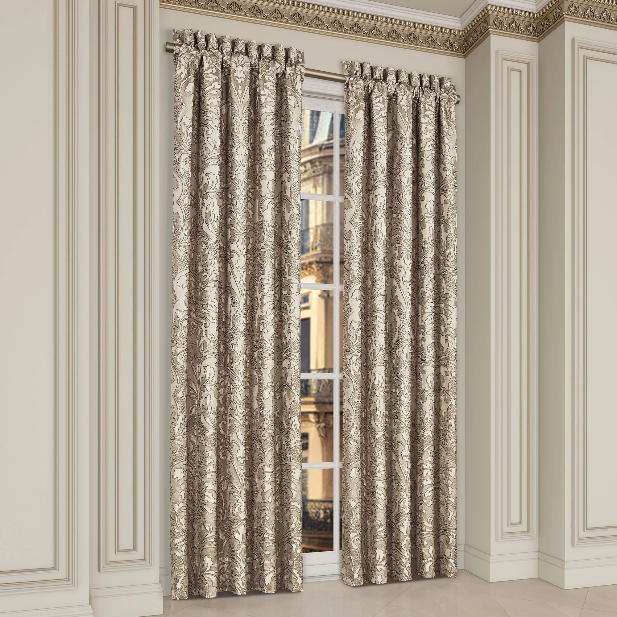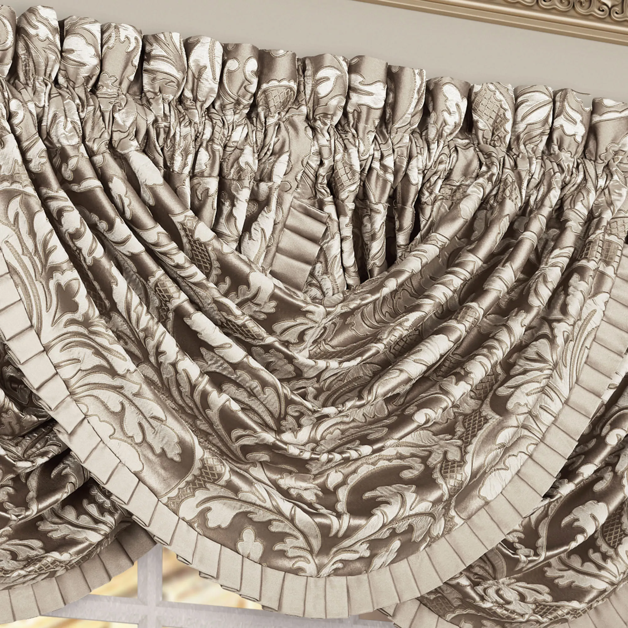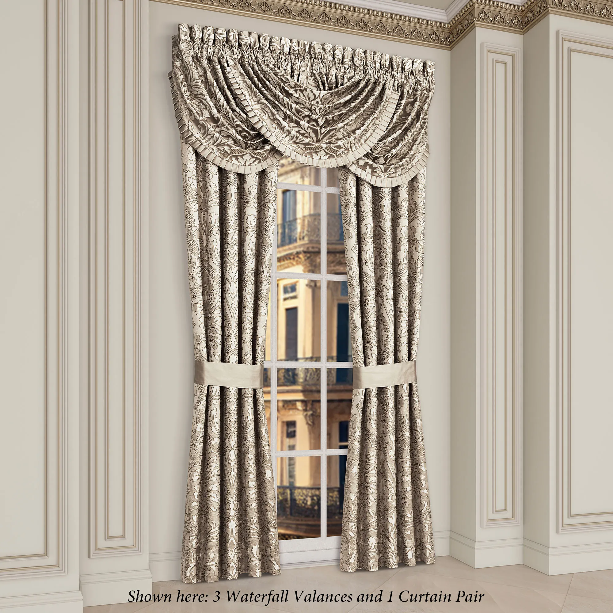 Window Treatments have leafy damask and 3" rod pockets. The lined Wide Curtain Pair has tailored edges and includes tiebacks. Each Waterfall Valance has pleated flange edges. We recommend one valance for every 12"-15" of window width.