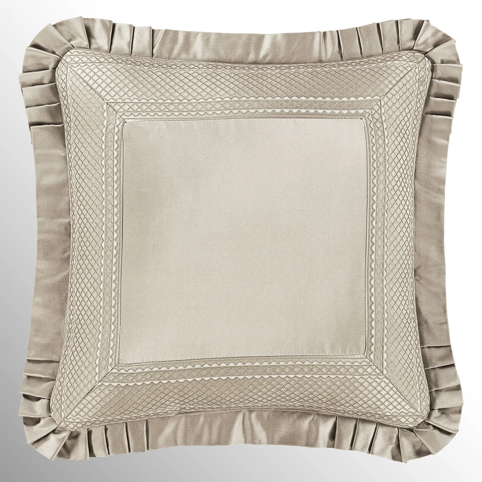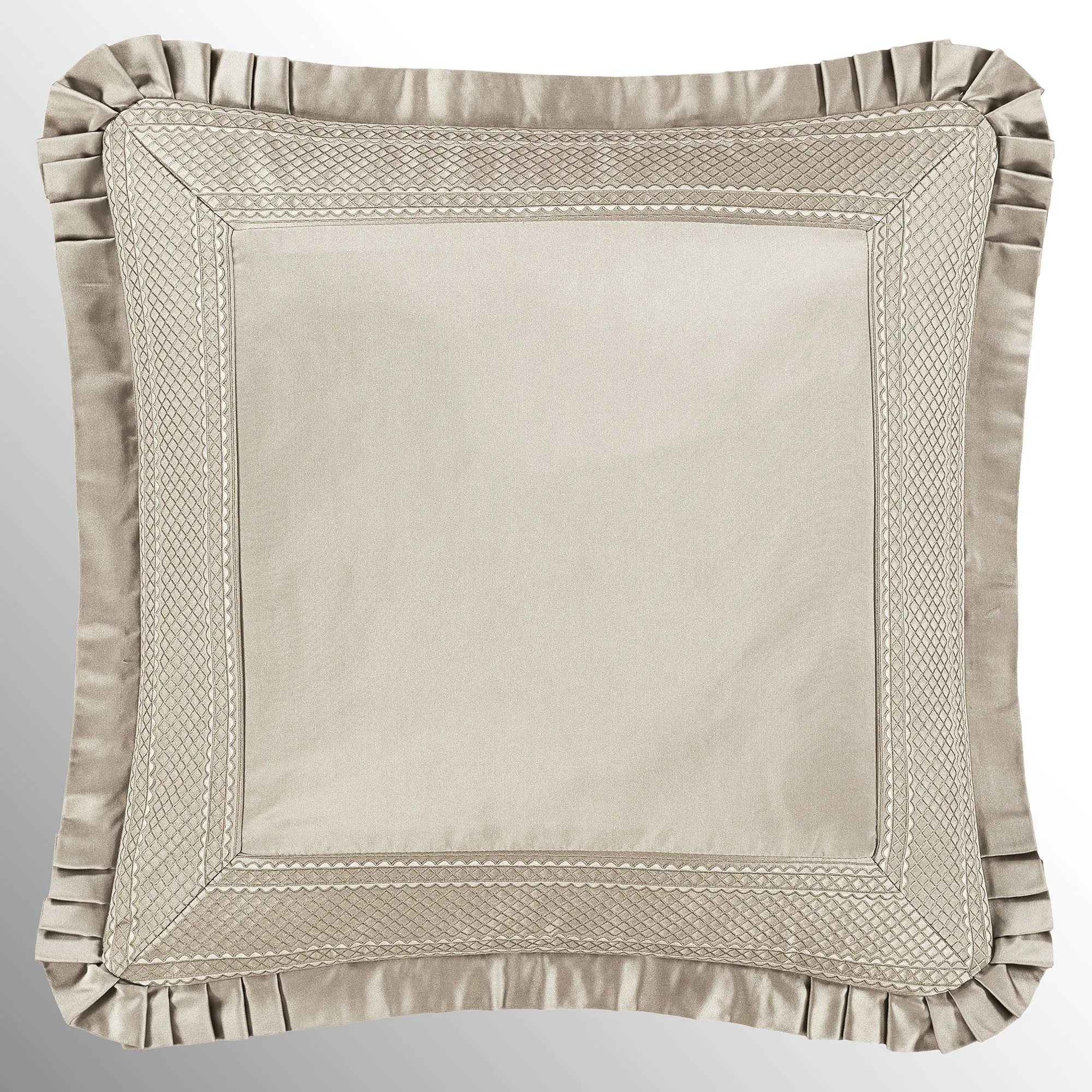 European Sham is polyester satin pieced with a mitred trim frame and pleated flange; zipper closure.