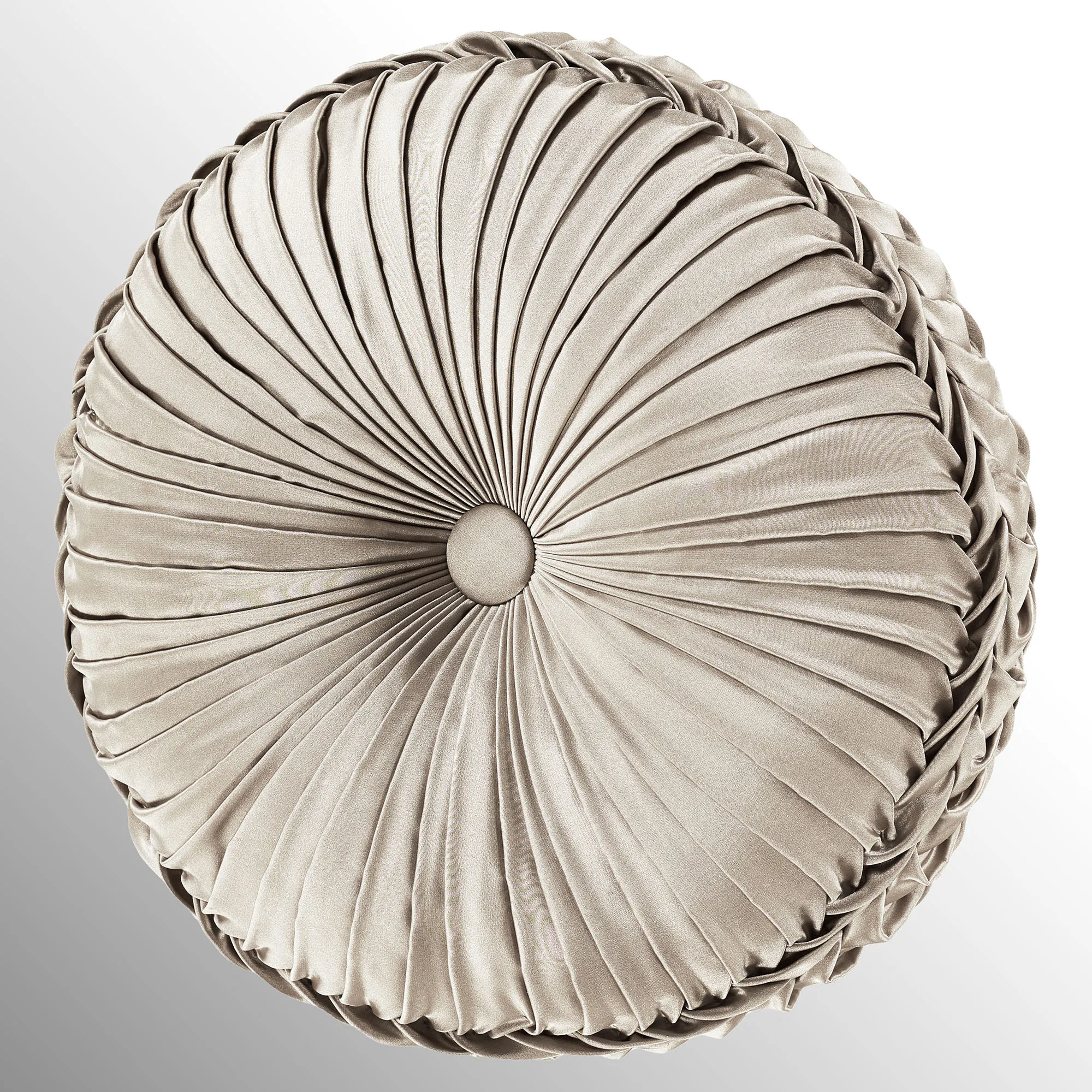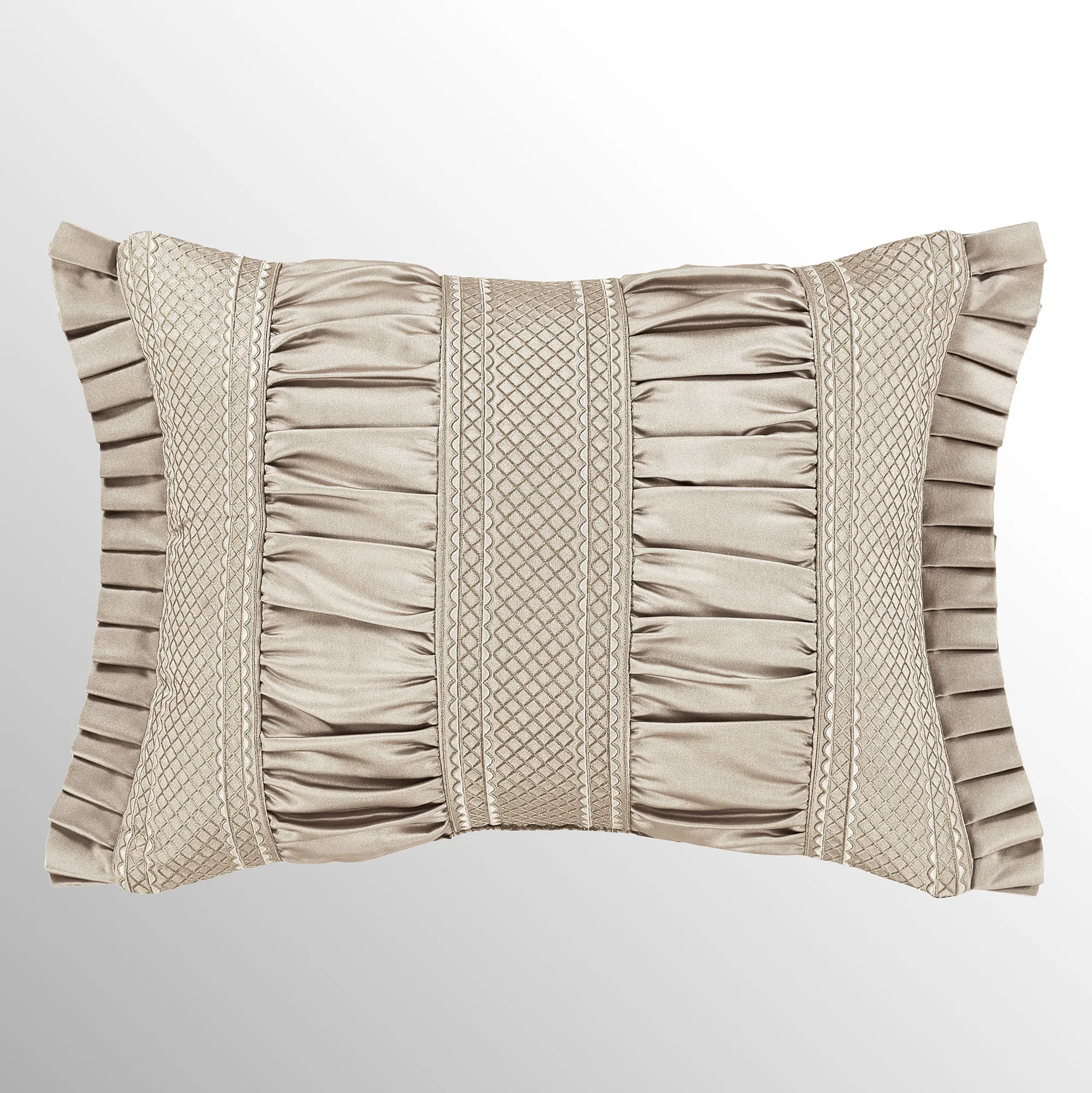 Pillows are polyester satin. Spot clean. Square is pieced with a mitred trim frame and pleated flanged edges. Rectangle has ruching, trim bands, and pleated flanged ends. The reversible, handmade Round has pleats, a center button tuft, and a 3" side gusset.