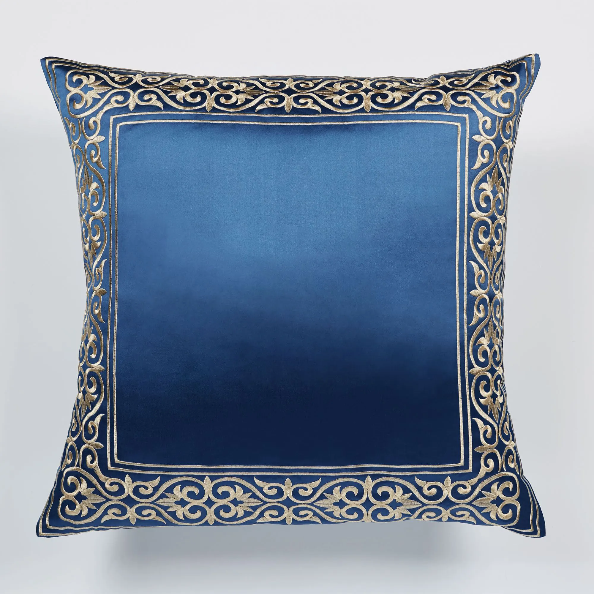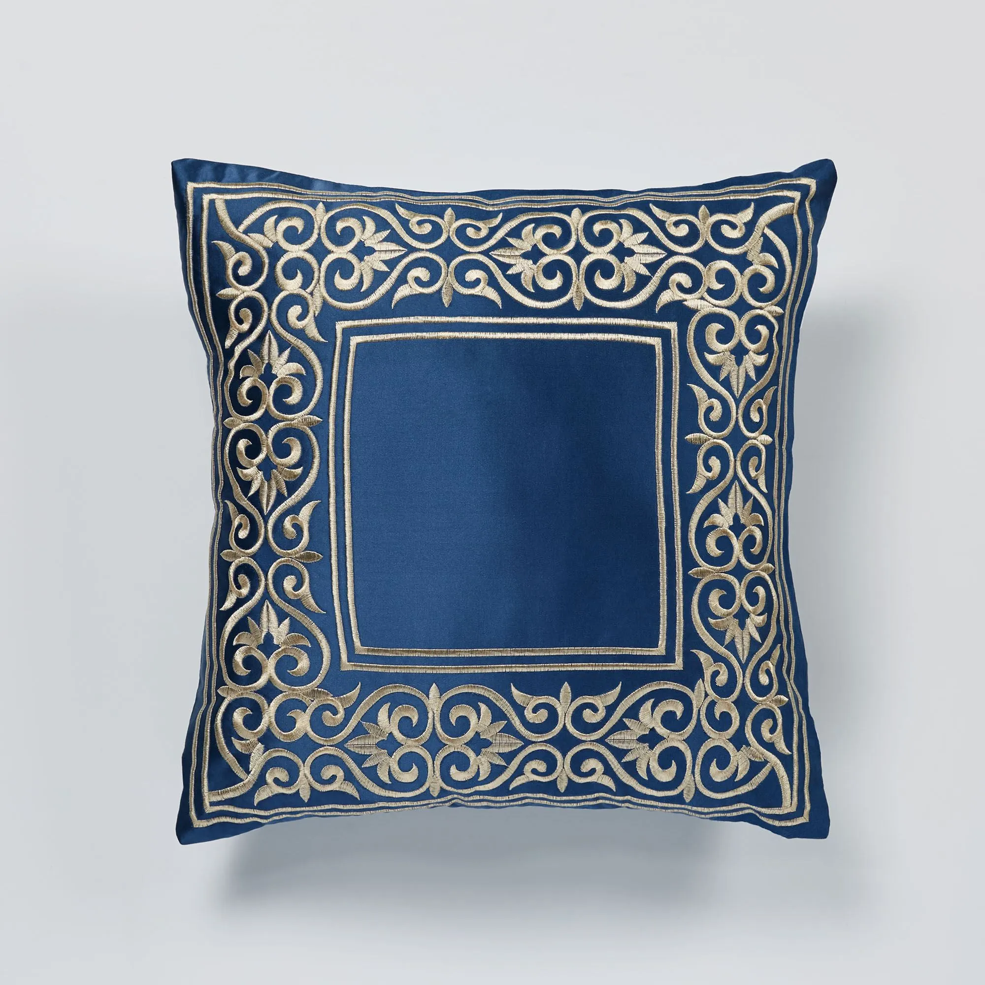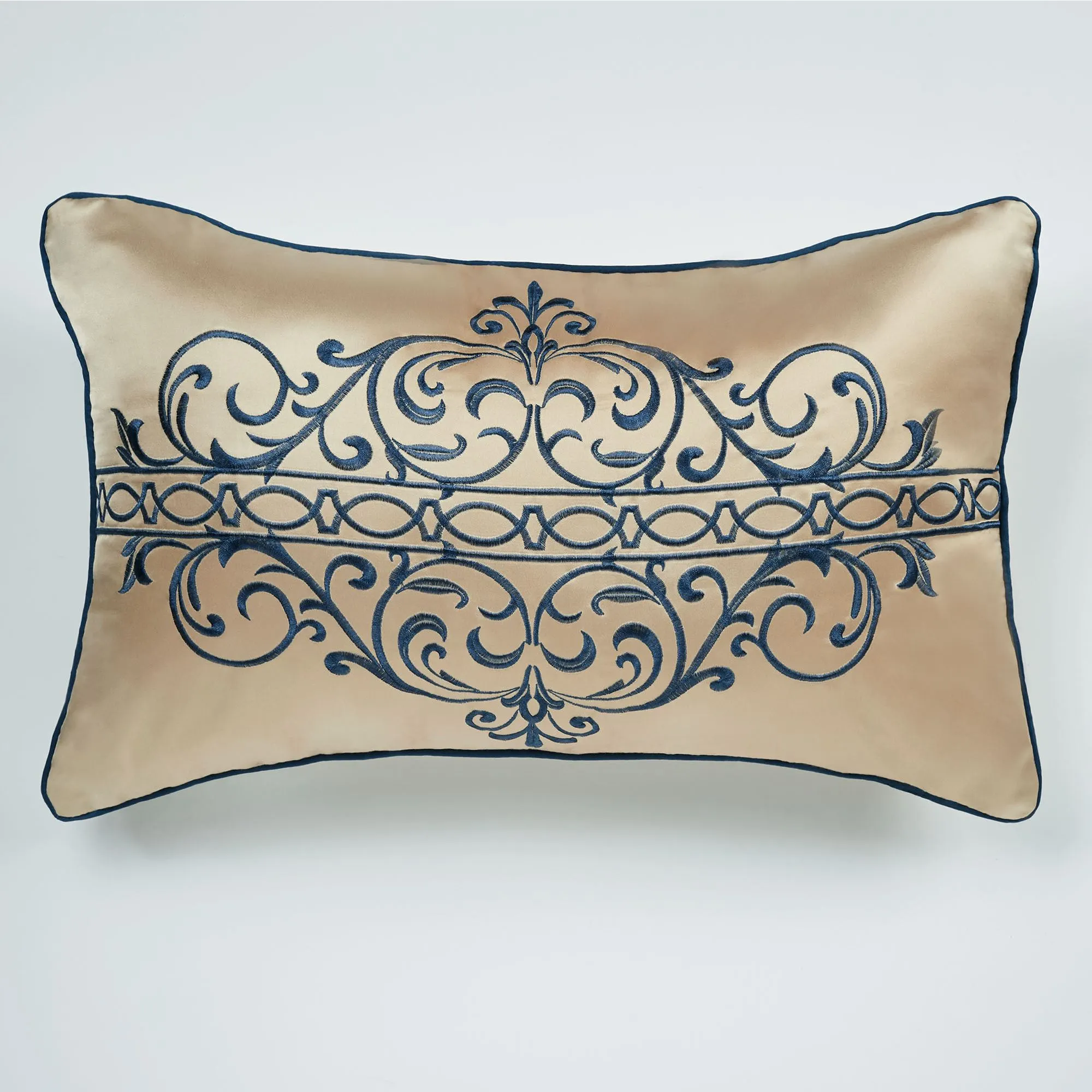 Pillows: Spot clean. Tailored Square has framing; zipper closure. Square pillow may be monogrammed for an extra charge. Monogramming is shown in the Almond thread color. Piped Rectangle is antique gold with a sapphire-colored embroidered band. Piped Round has a medallion and a framed 2" side gusset.