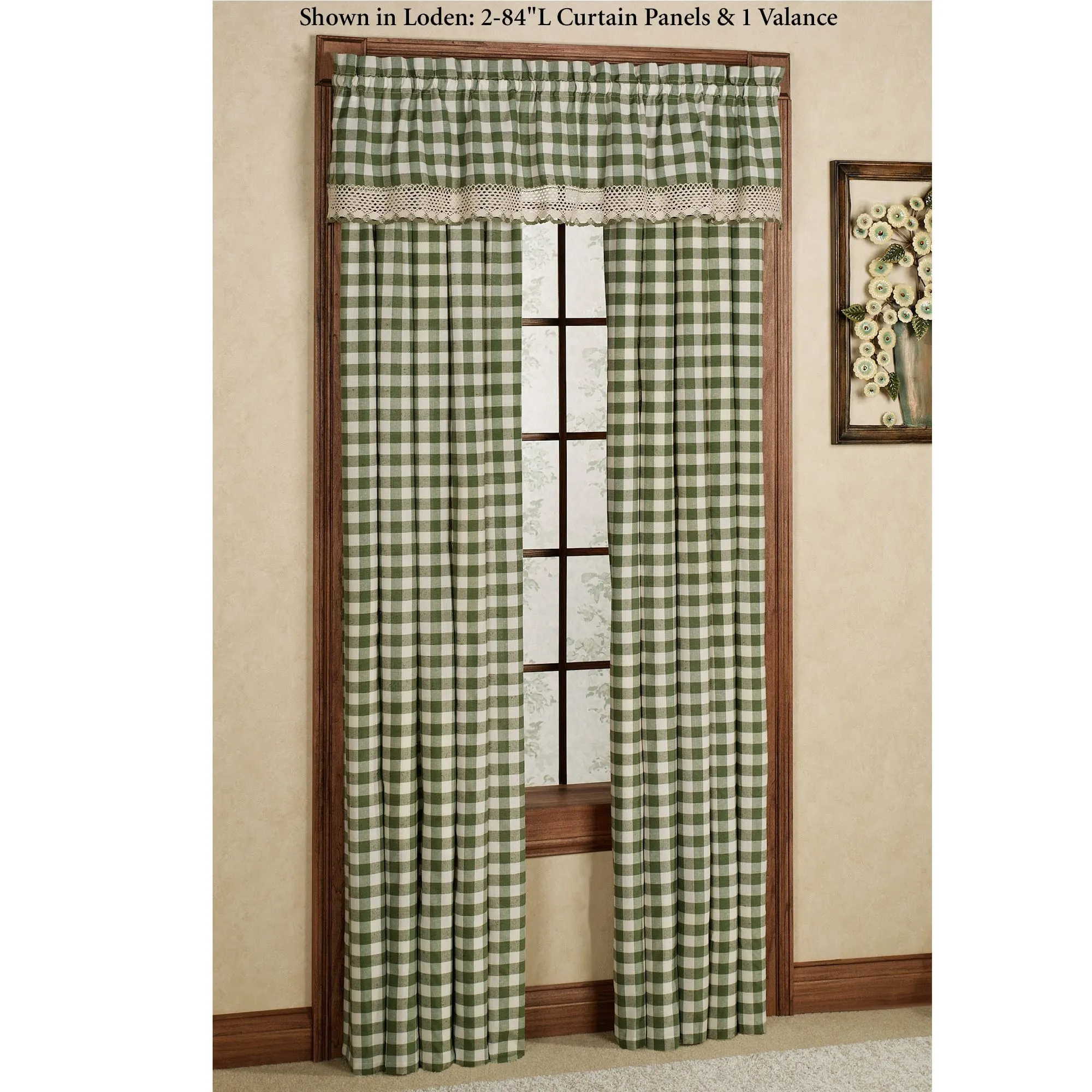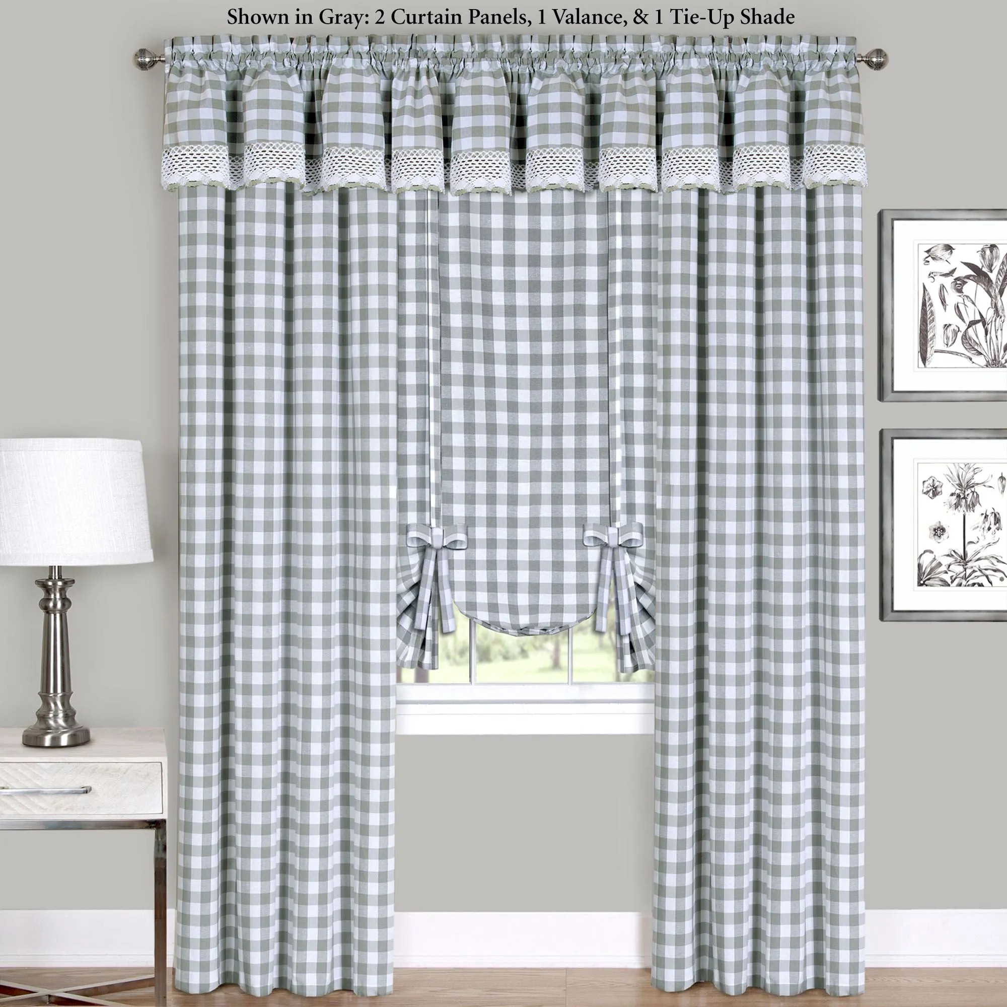 The Buffalo Check Window Treatment has a rustic look with a little bit of country charm. This polyester/cotton window treatment has an all-over check pattern. Specify Curtain Panel, Tailored Valance, or Tie-Up Shade. Curtain Panel is tailored. Tailored Valance has macrame trim. Tie-Up Shade has four attached ties. Treatments fit windows up to 36"W. Panel and valance have a 1.5" rod pocket; shade has a 2" rod pocket. All colors except Black and Gray have an off-white background with beige trim (on valance). Black and Gray have a white background and white trim (on valance). Machine wash. Imported.