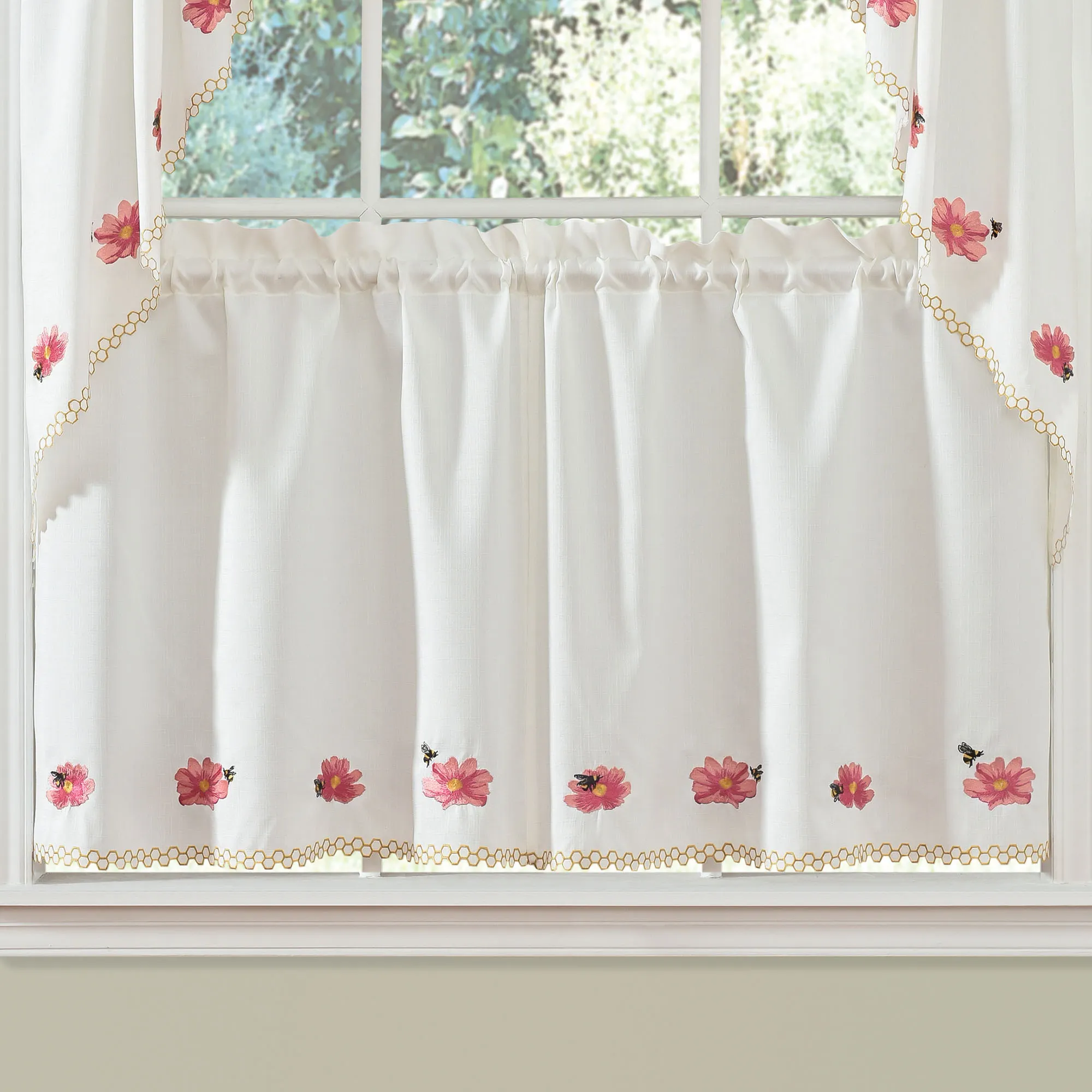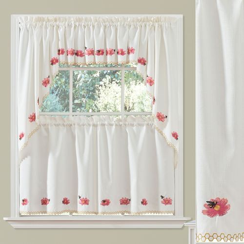 These sweet Bumble Bees buzz right into your hive. The slubbed, light cream polyester window treatment features embroidered flowers, bees, and honeycomb designs along with cutwork edging. Accent colors include blush, pink, yellow, gold, and black. Rod pockets are 2". Tier Pair is 56"W. Swag Valance Pair is 56"Wx38"L. Insert Valance (no longer available) is 58"Wx12"L. Machine washable. Imported.