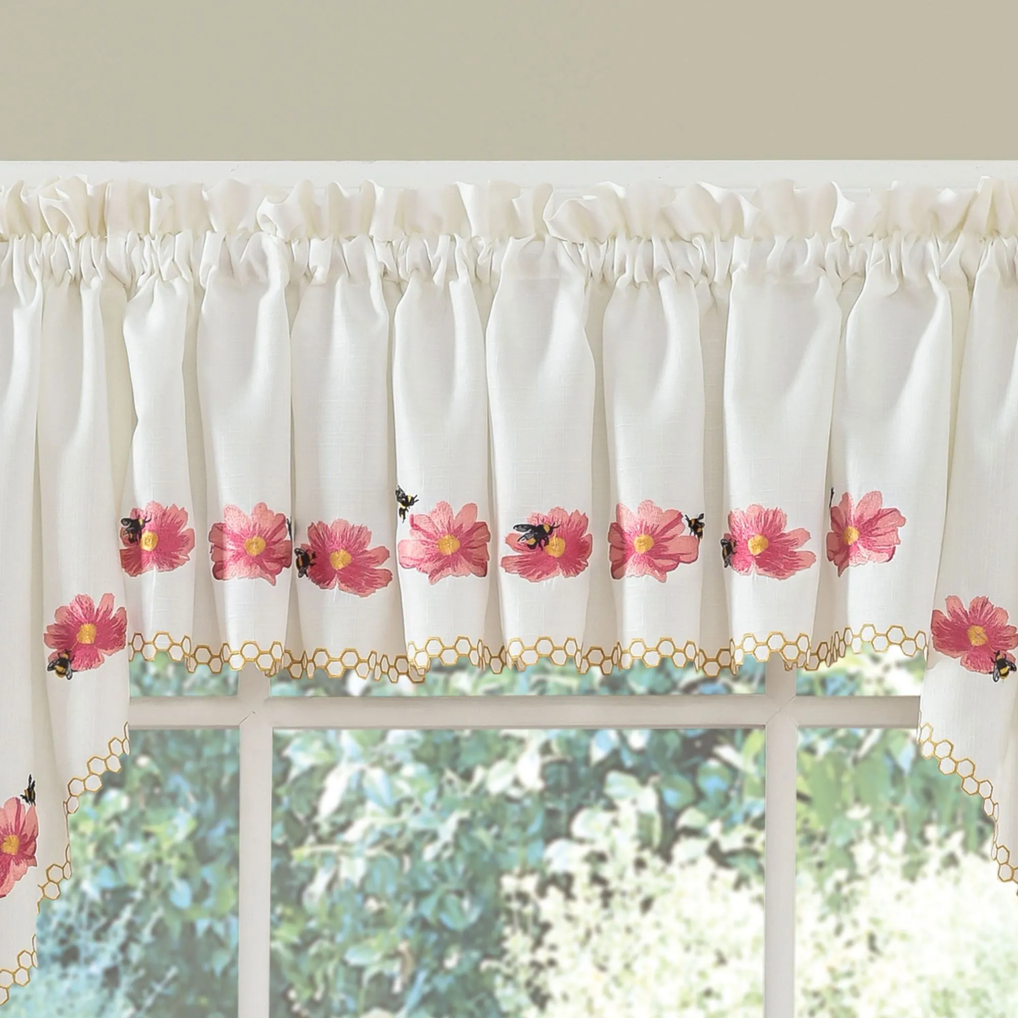 These sweet Bumble Bees buzz right into your hive. The slubbed, light cream polyester window treatment features embroidered flowers, bees, and honeycomb designs along with cutwork edging. Accent colors include blush, pink, yellow, gold, and black. Rod pockets are 2". Tier Pair is 56"W. Swag Valance Pair (no longer available) is 56"Wx38"L. Insert Valance (no longer available) is 58"Wx12"L. Machine washable. Imported.