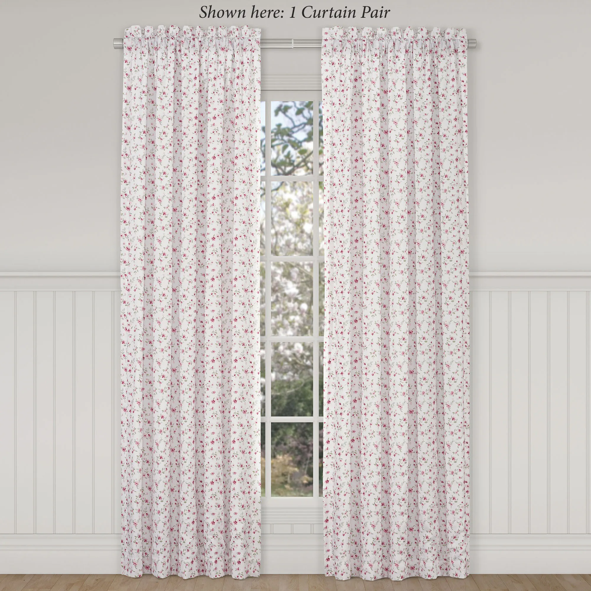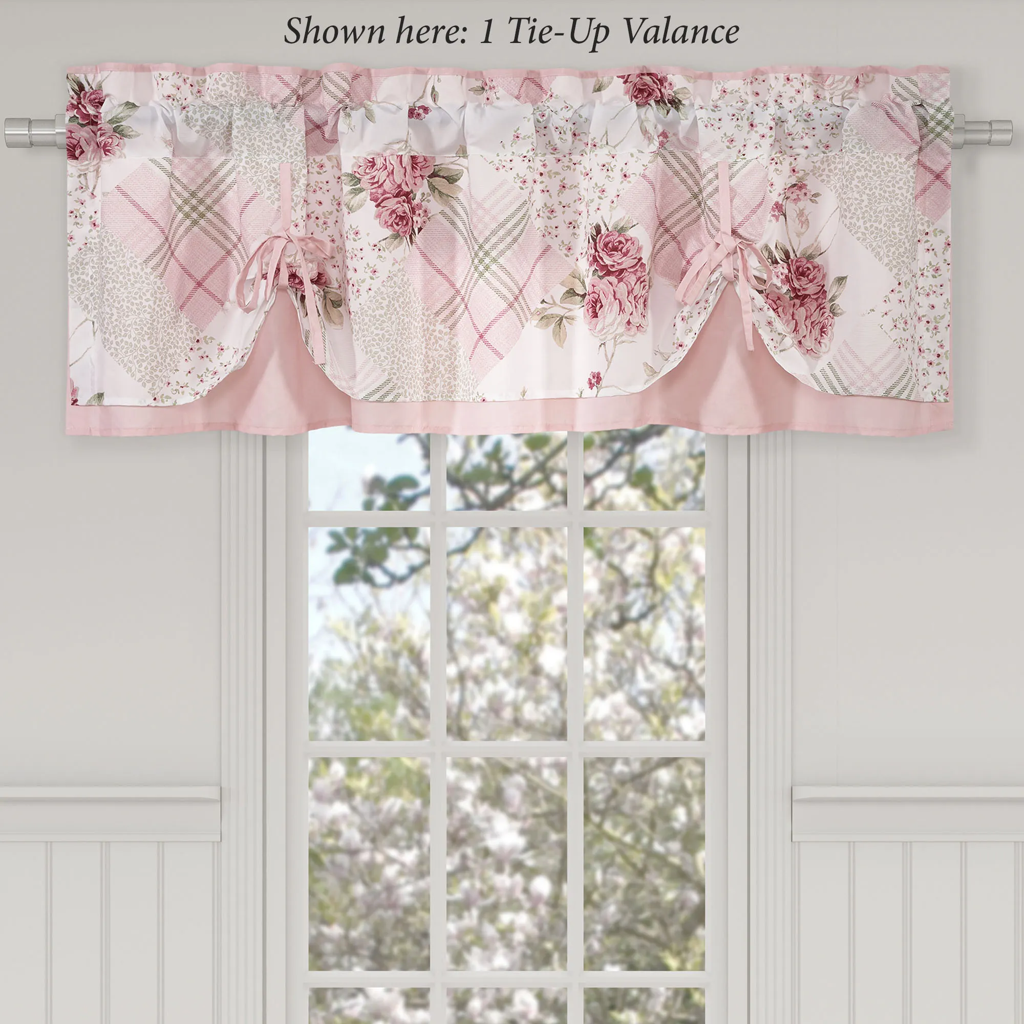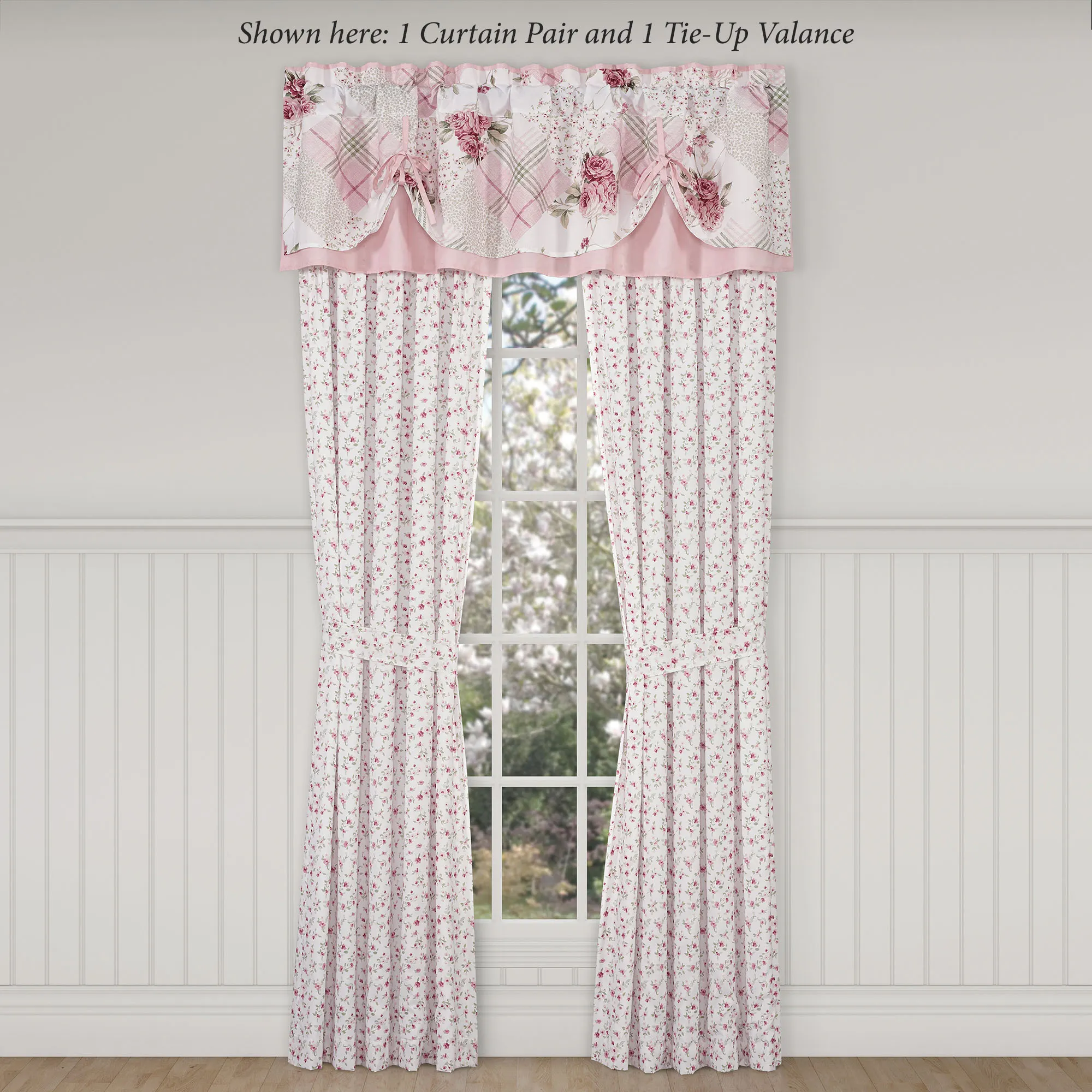 Lined Window Treatment has tailored edges and 3" rod pockets. Curtain Pair has mini ditsy florals and includes tiebacks. Tie-Up Valance has a patchwork-like top layer, pink bottom layer, and two tie accents.