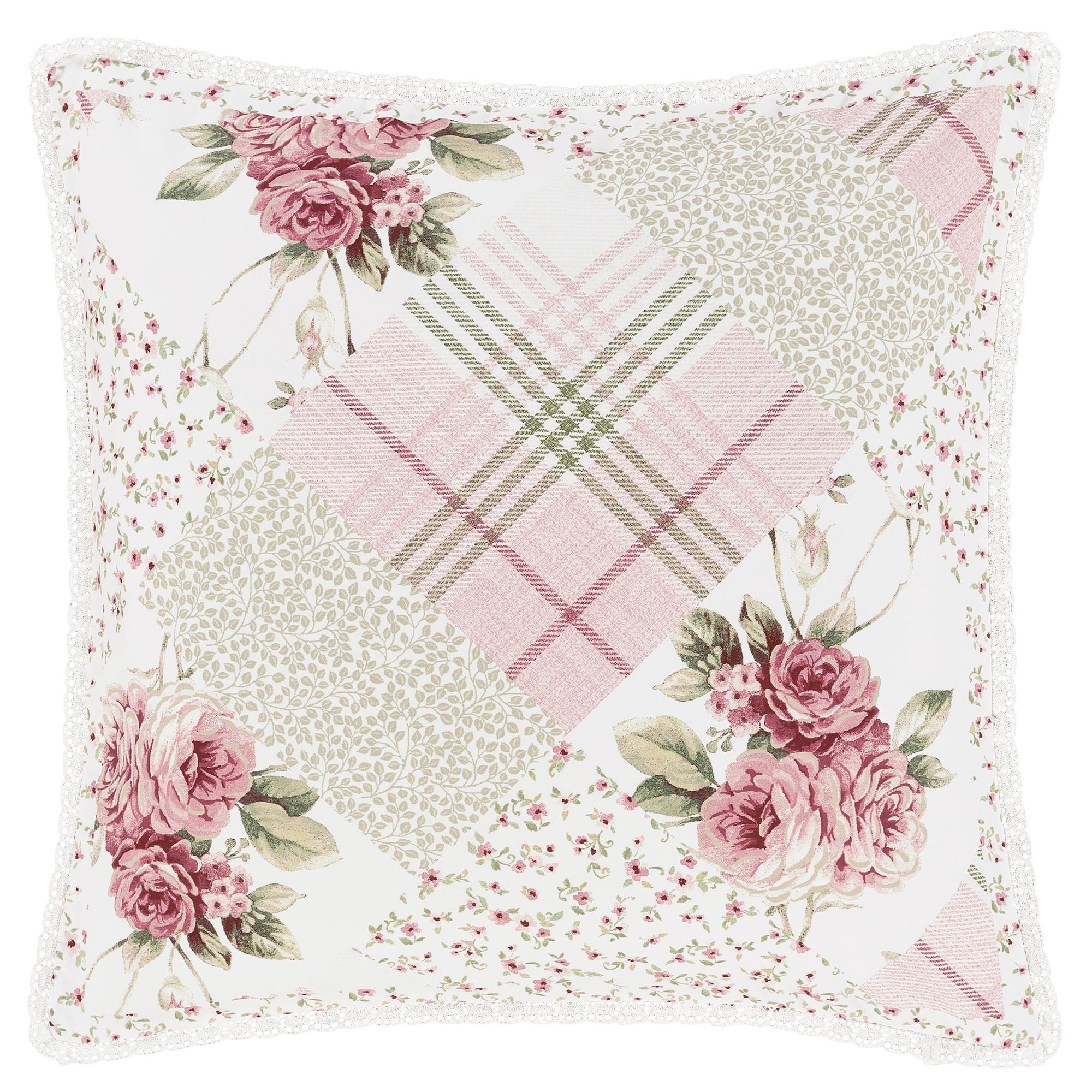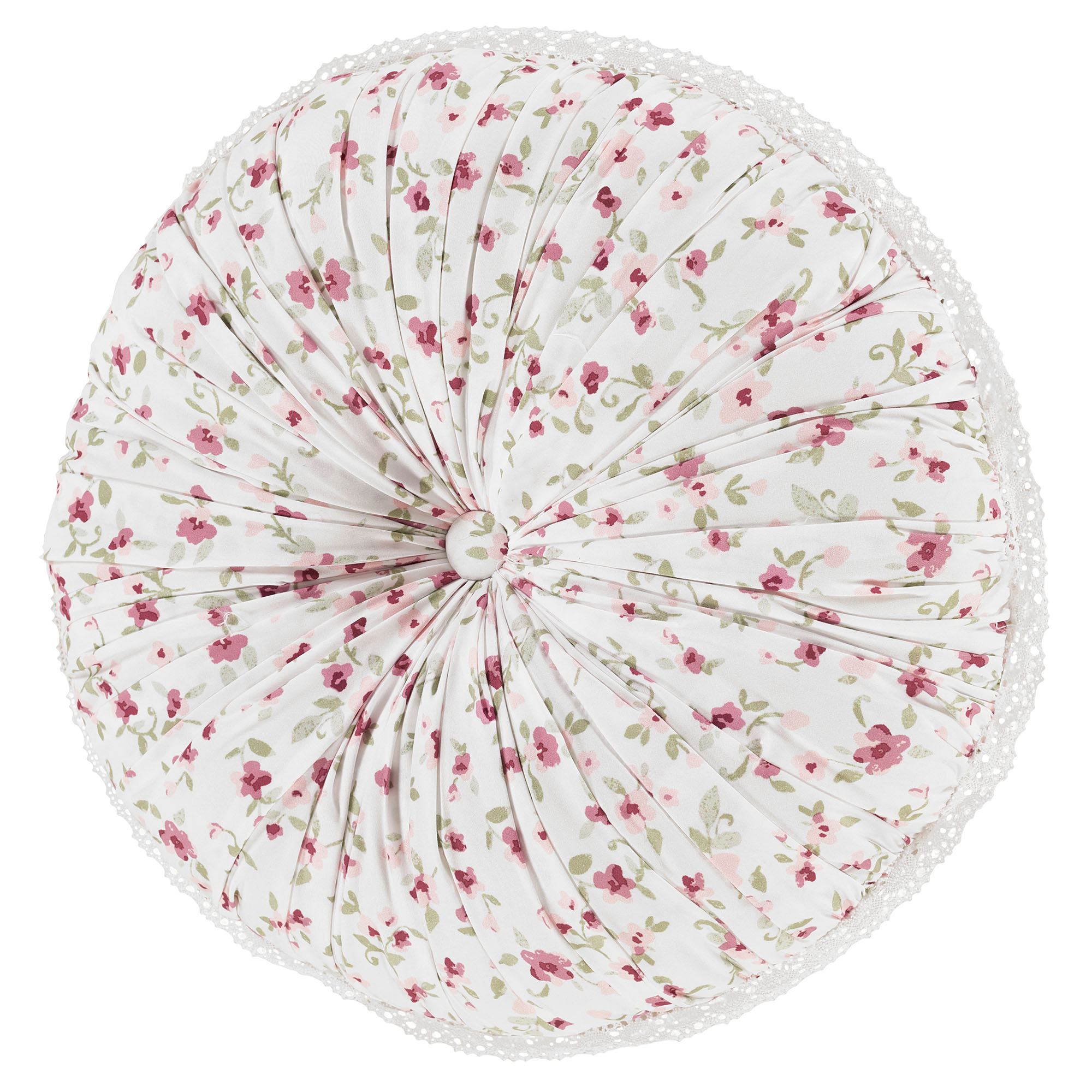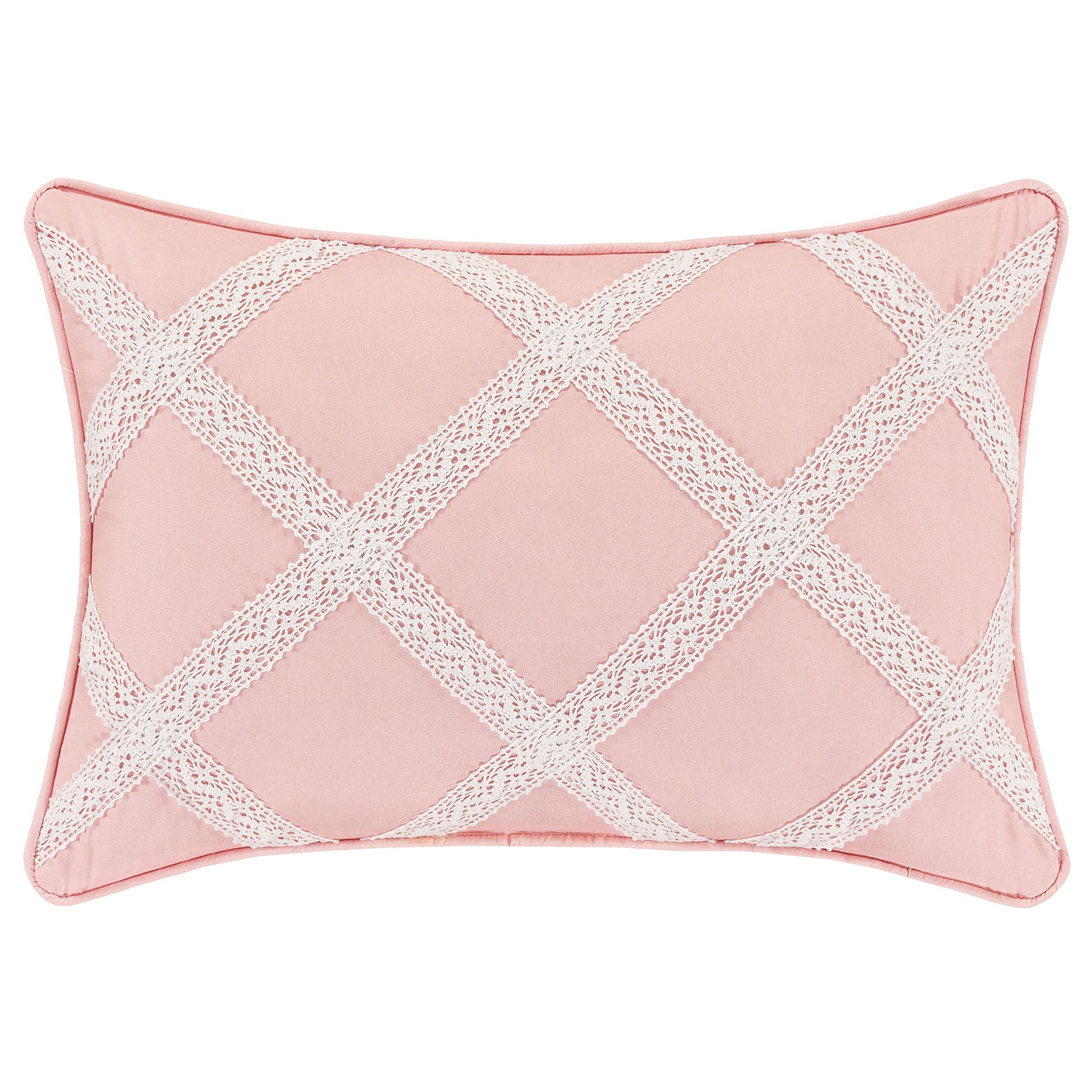 Pillows: Spot clean. Square has patchwork-like designs with cotton lace accents and flange; reverses to mini ditsy florals. Piped Rectangle is pink with crossing cotton lace bands. Reversible, handmade Round has shirred mini ditsy florals, a button-tuft center, and cotton lace flange.
