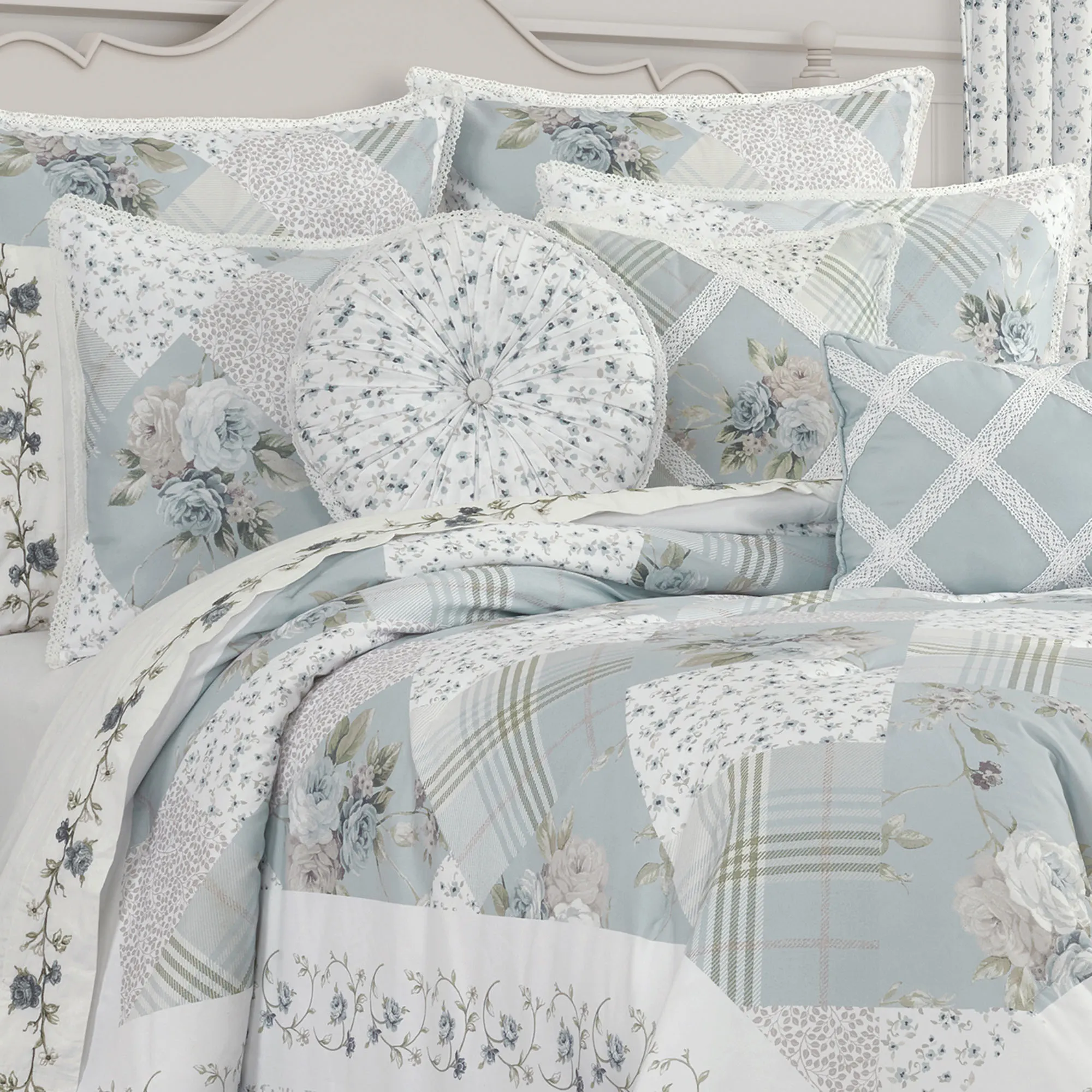 Flirty florals and plaid patterns charm the Bungalow II Bedding with sweet grace. This printed, polyester ensemble, from Royal Court, has a patchwork look and features quaint designs including roses, leaves, plaid, and mini ditsy florals. Colors include shades of spa blue, white, silver gray, light gray, and green.