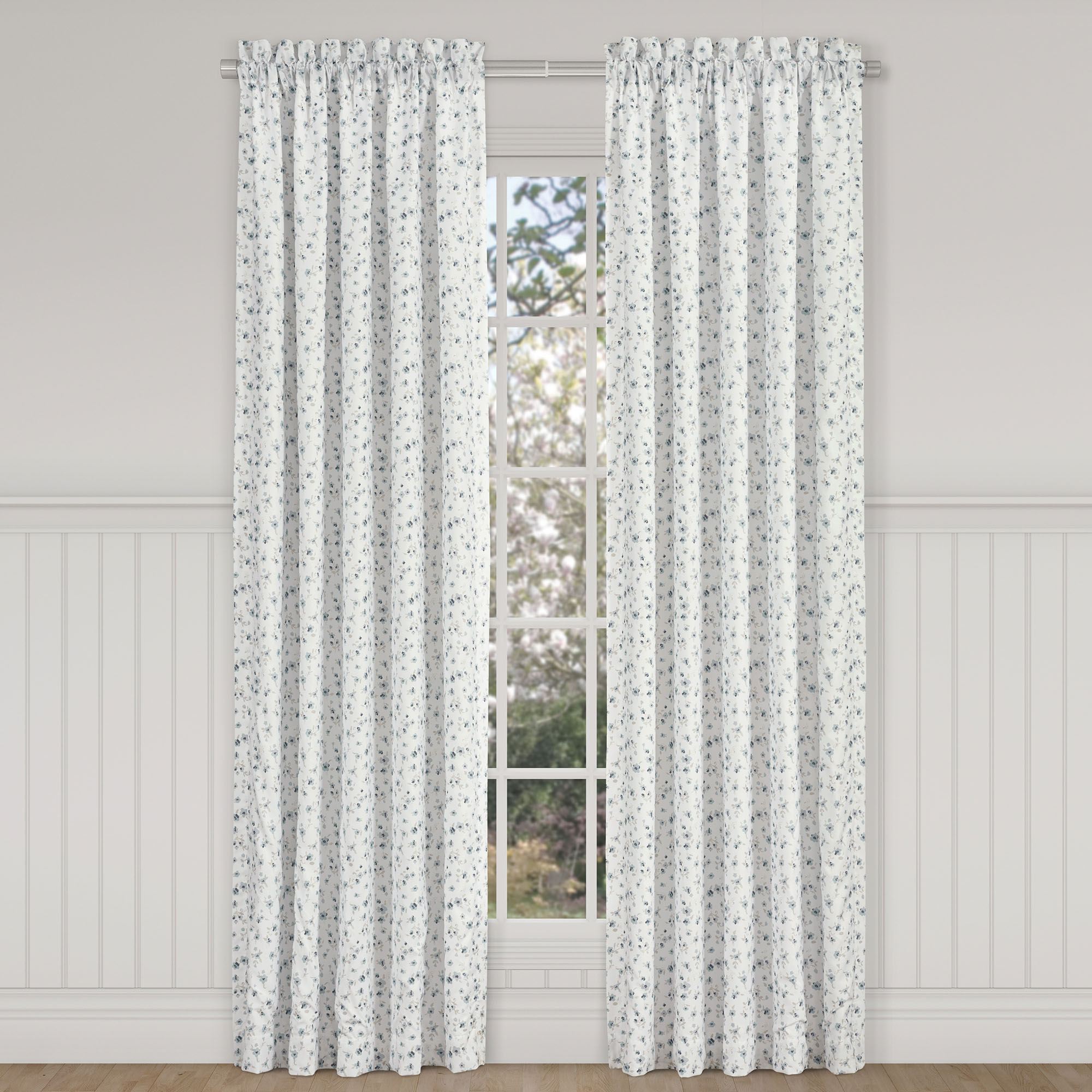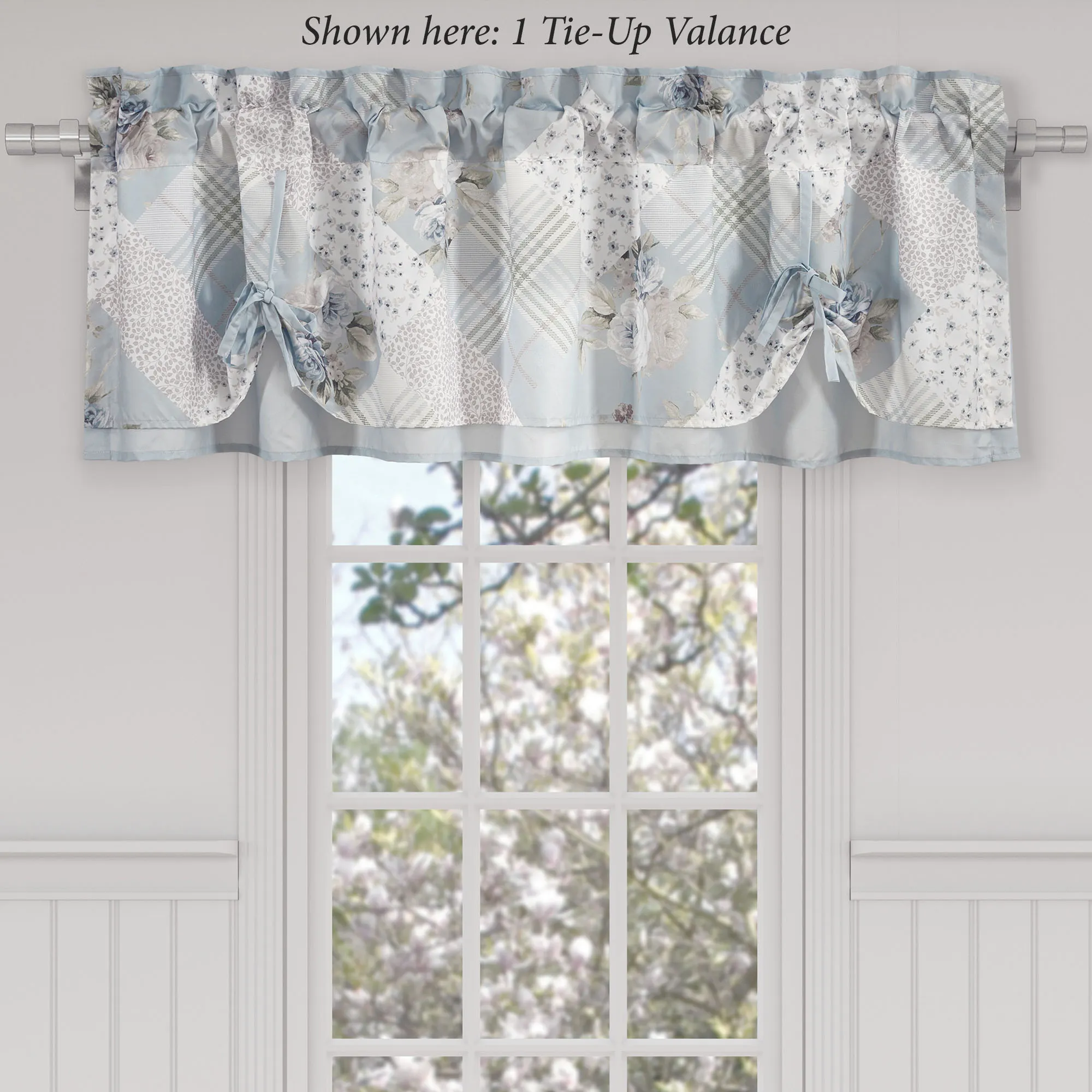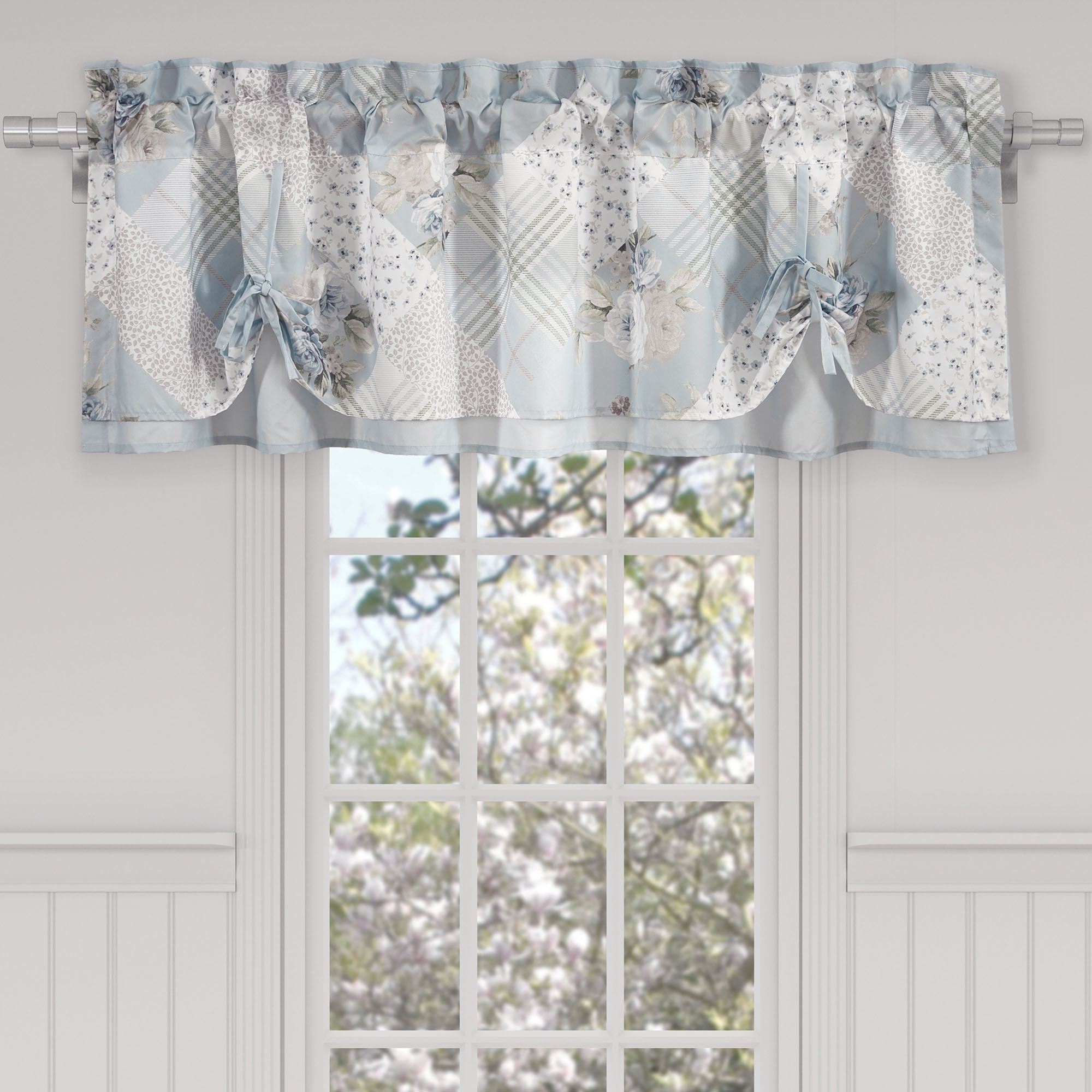 Lined Window Treatment has 3" rod pockets. Tailored Curtain Pair has a ditsy floral print and includes tiebacks. Tie-Up Valance has two ties, a patchwork-look design on the top, and spa blue on the bottom.