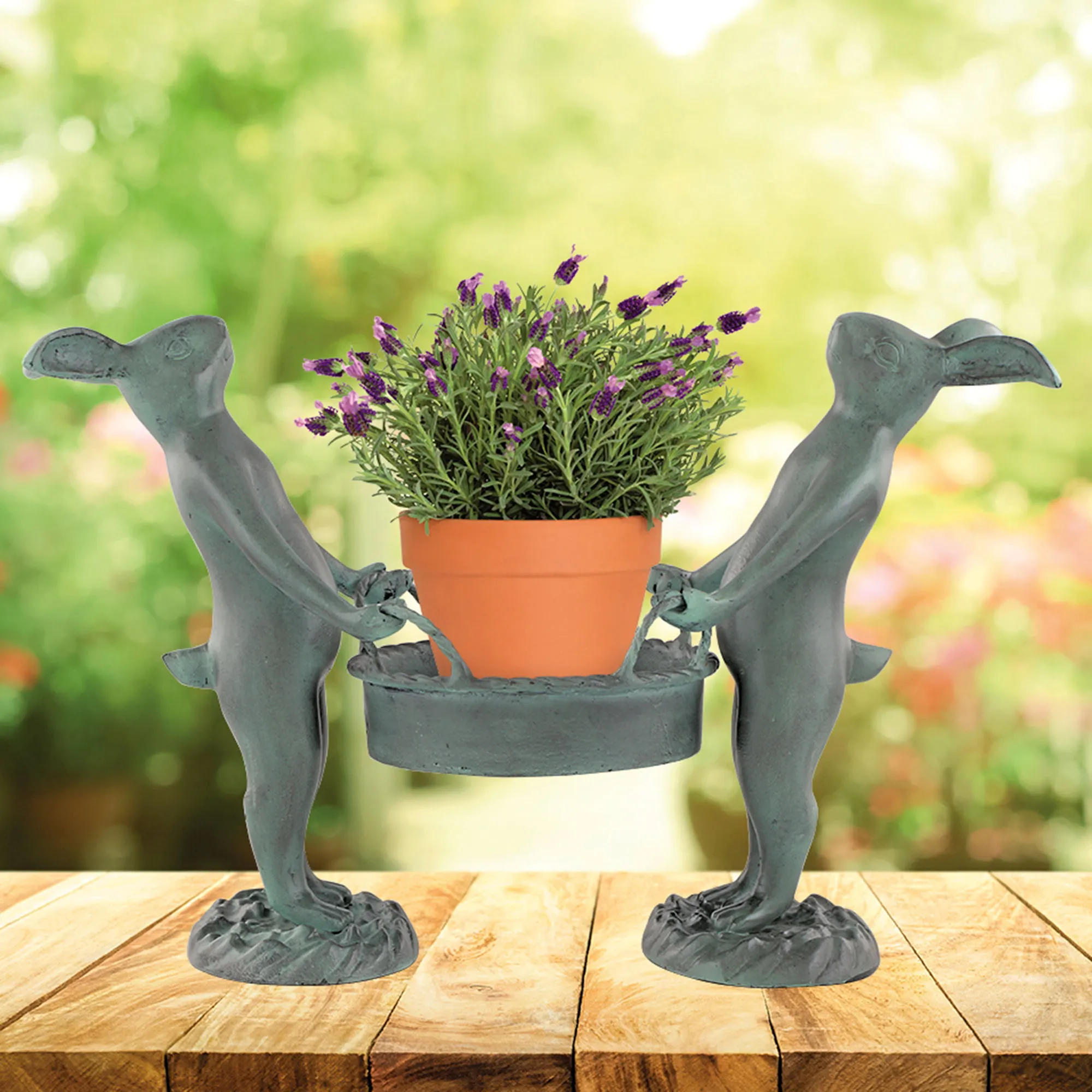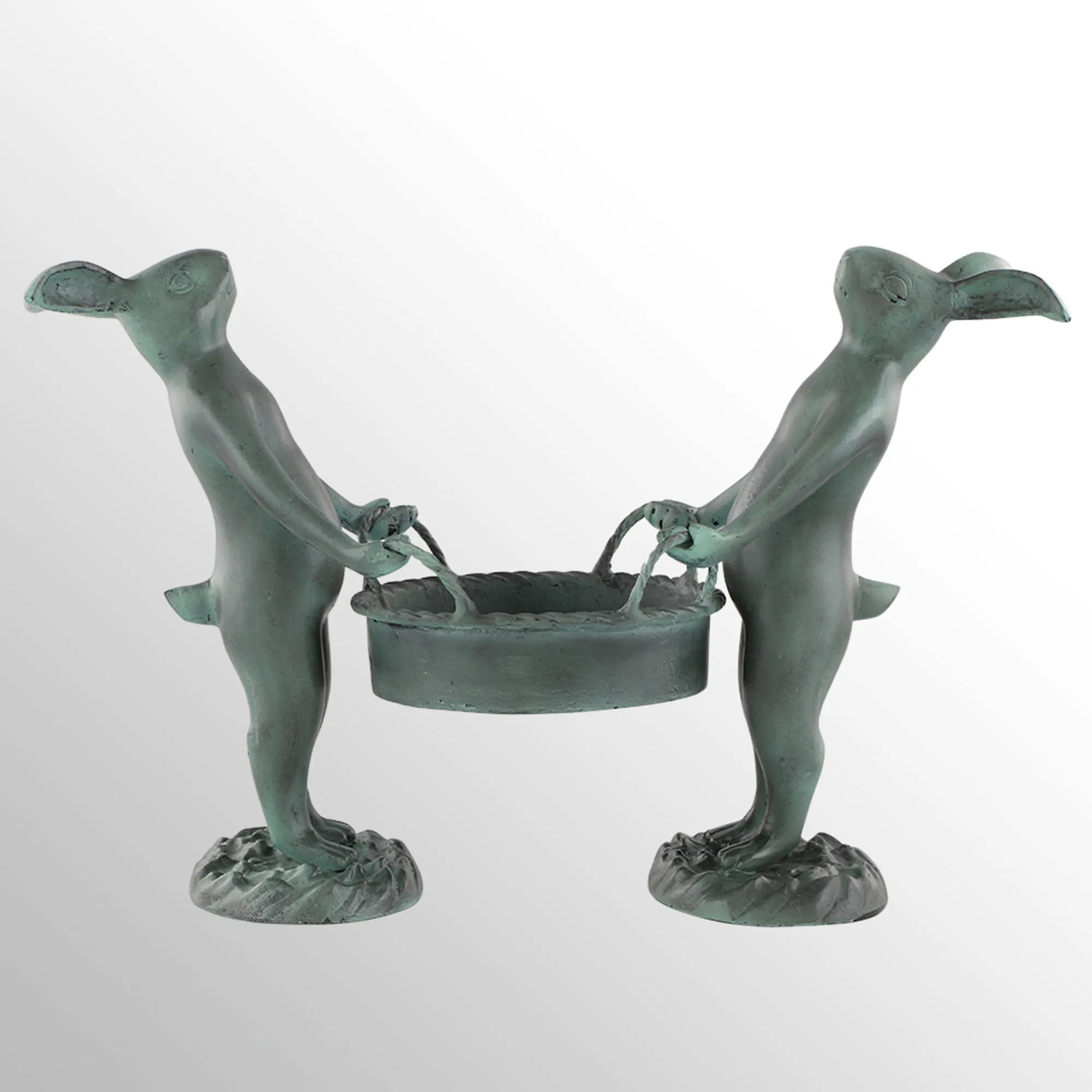 The Bunny Gardeners think your plant might look better right over here. Hand-cast from aluminum and iron, the two adorable rabbits are carrying a basket to hold your planter. A hand-rubbed verdi and gray patina finish colors the design. Perfect for indoor or outdoor year-round use, the bunny rabbit planter holder measures 18"Wx8.5"Dx15.5"H and weighs 10 lbs.