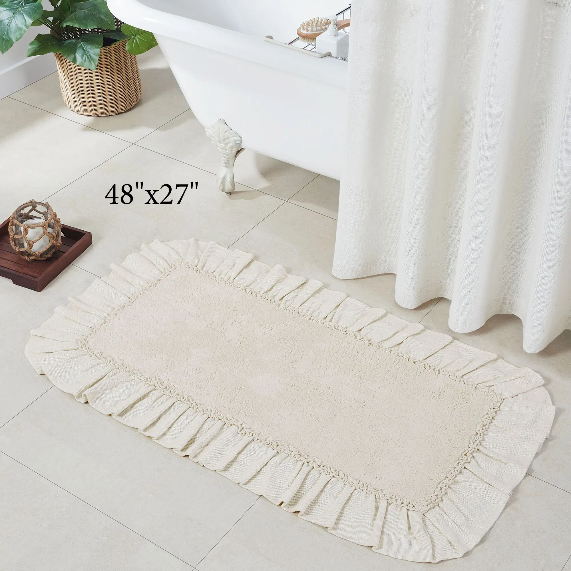 The Burlap Antique White Bath Mat makes your space look charming. This solid color, cotton bath mat, by April & Olive, has a tufted center, a ruffled edge, and a nonslip rubber backing. Machine washable. Imported.