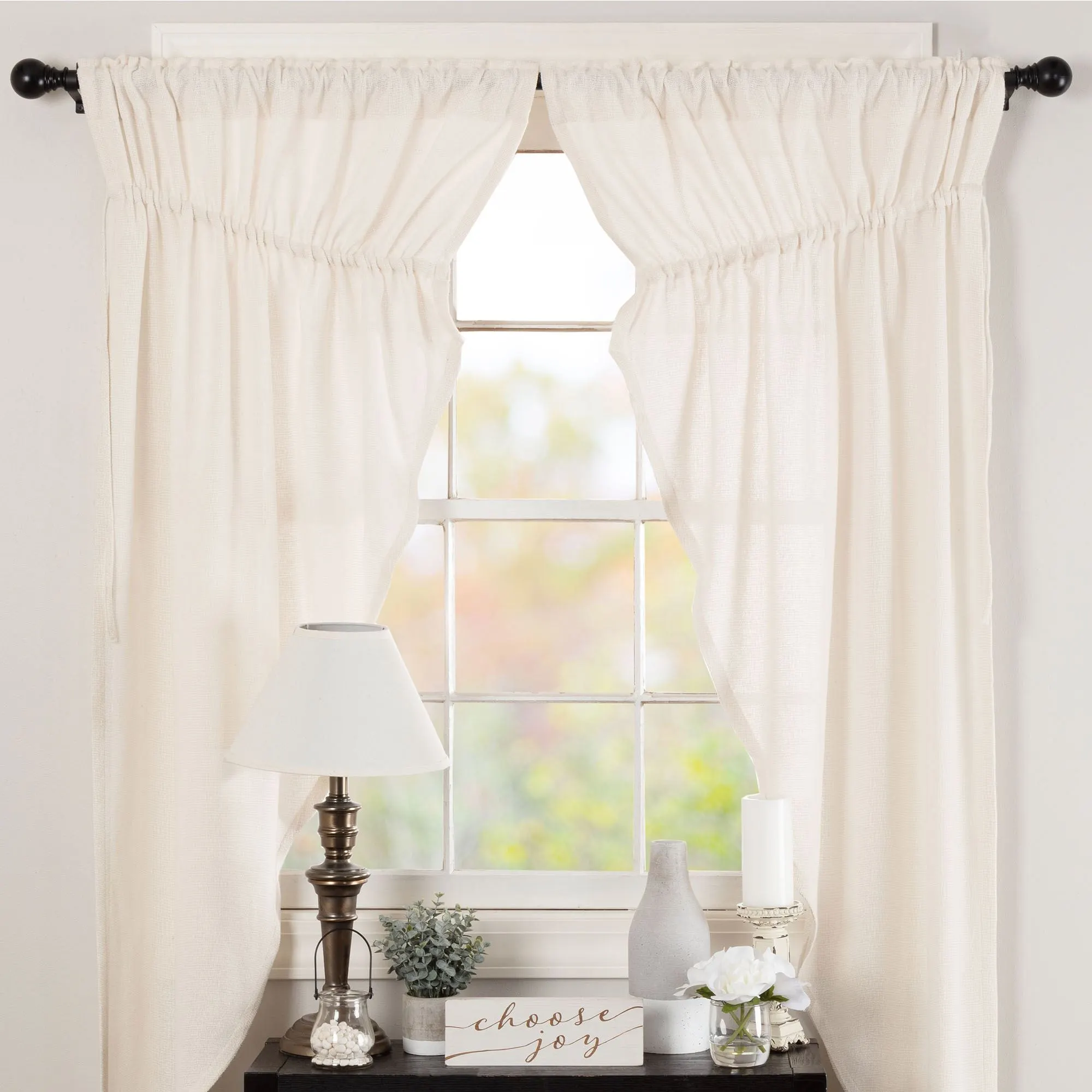 With a feeling reminiscent of Grandma's soft handmade afghans, the antique white Burlap Prairie Curtains bring unique rustic charm to any space. Made of 100% cotton, the fabric has a loose weave that resembles exquisitely soft, antique white burlap with minor natural variations. Rod pocket size is 3.5". Curtains are sold as a pair; the prairie curtain pair is 72"Wx63"L. Machine washable. Imported. The curtain pair width is the total width of two panels together.