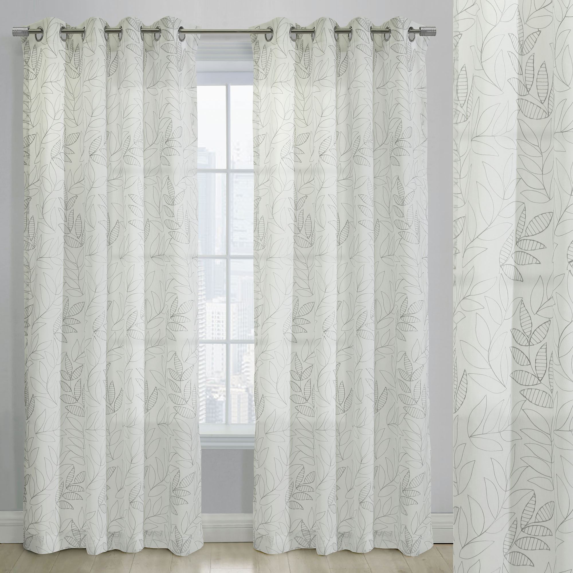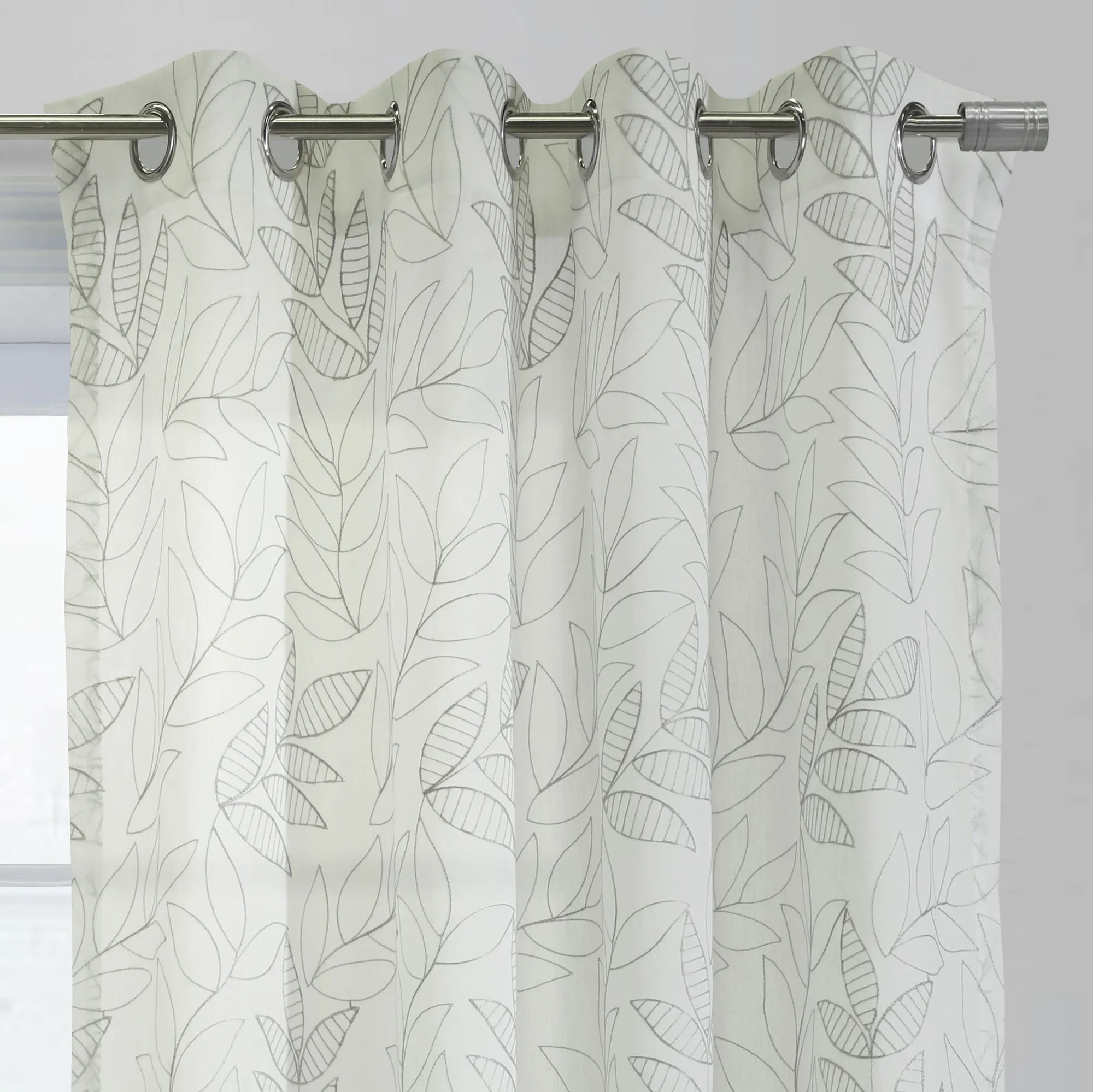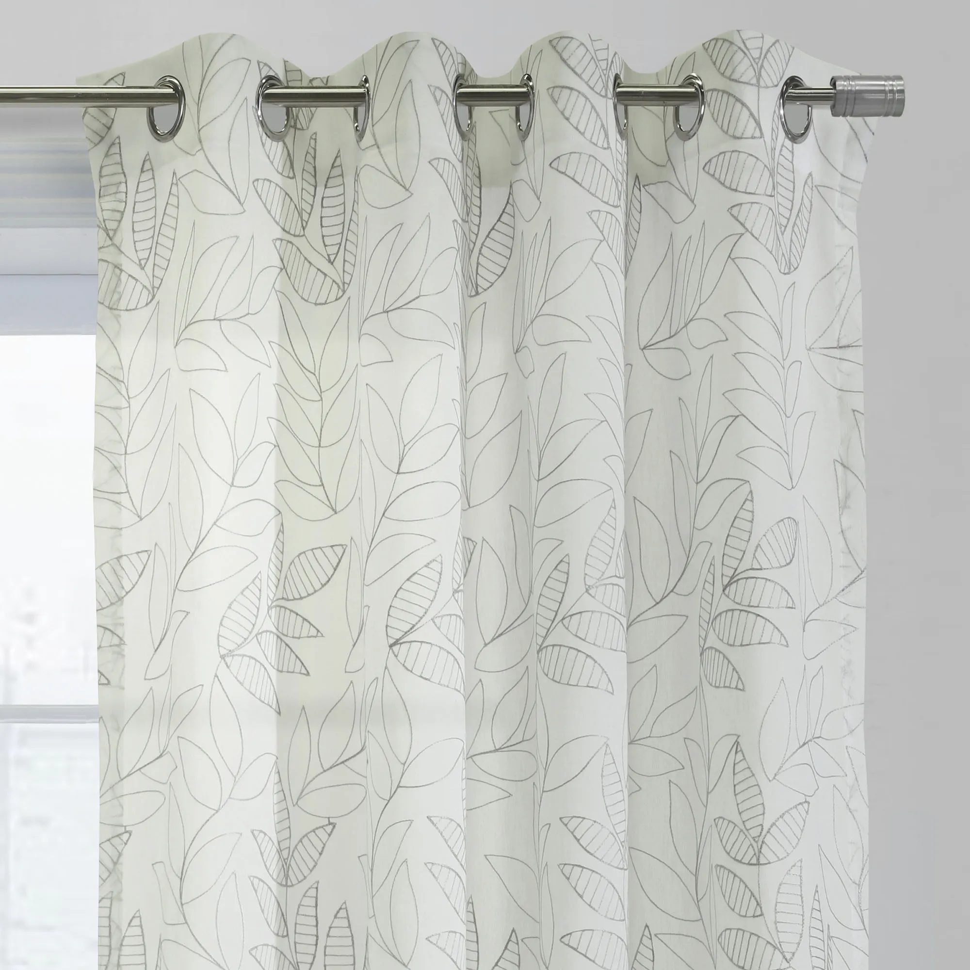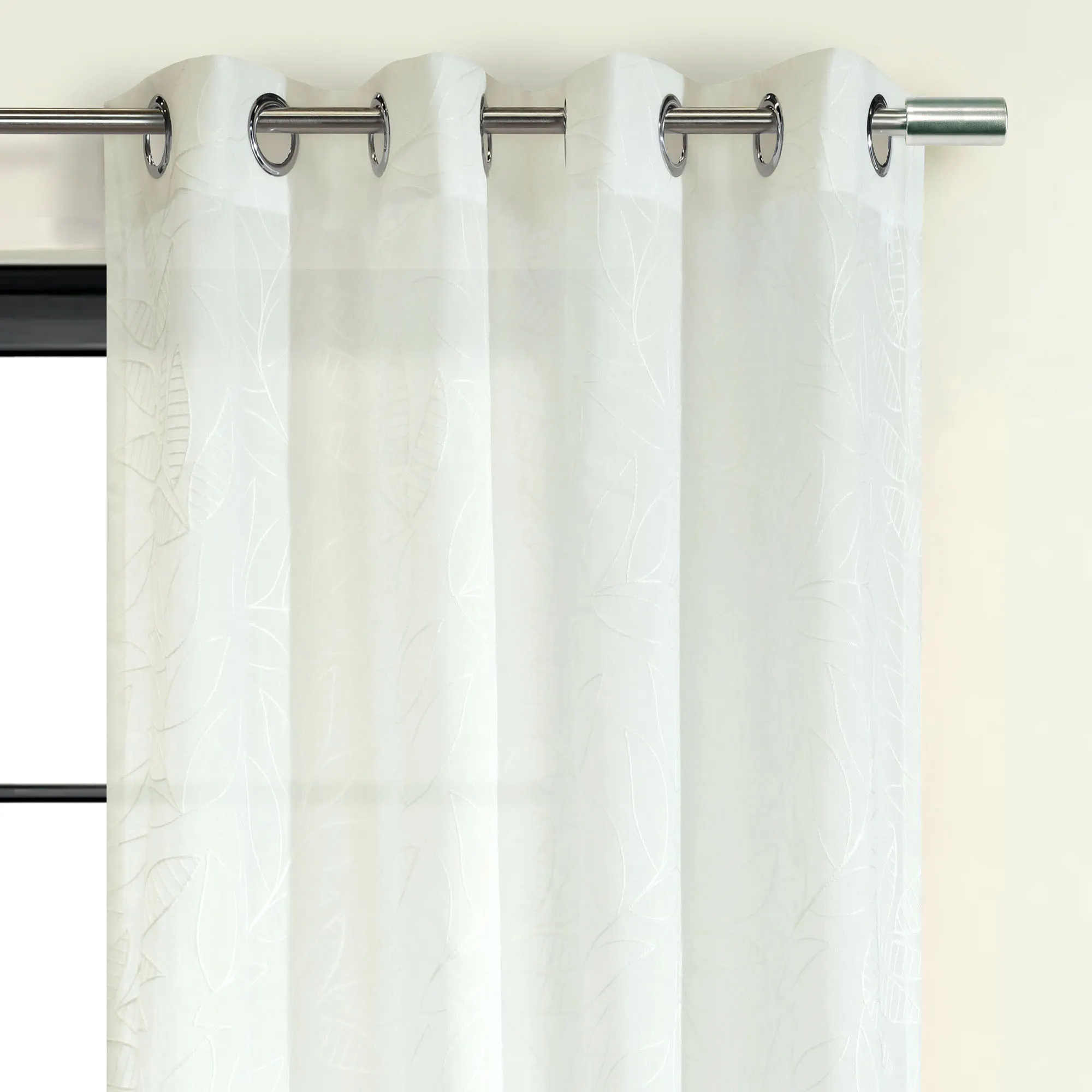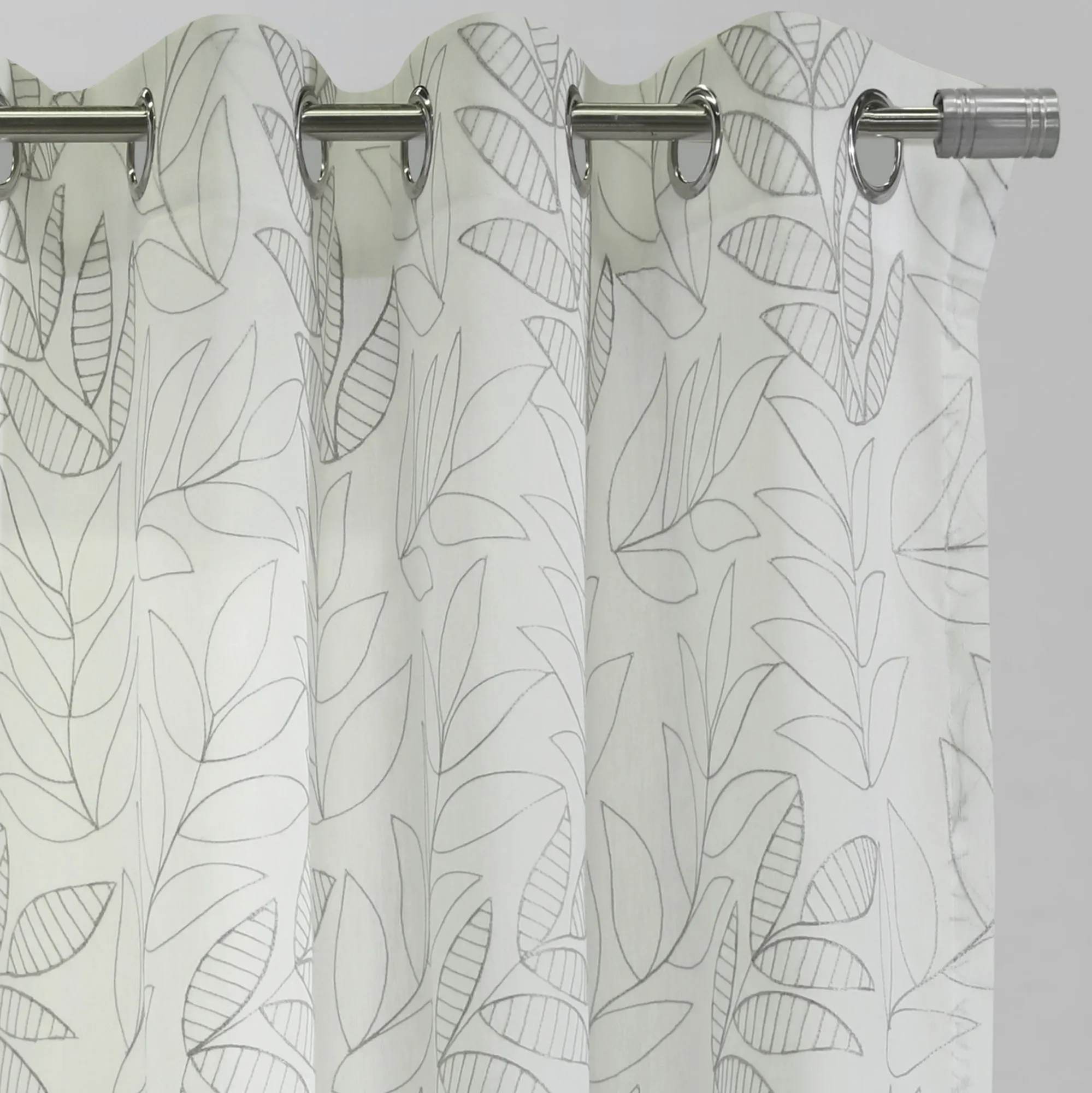 The Burrill Grommet Curtain Panel adds a pristine natural touch to your view. Solid color embroidered openwork and striped leaves decorate the eggshell-hued, semi-sheer polyester panel. Sold individually, each 52"W window panel hangs via 1.5" dia. brushed silver metal grommets. Machine washable. Imported.