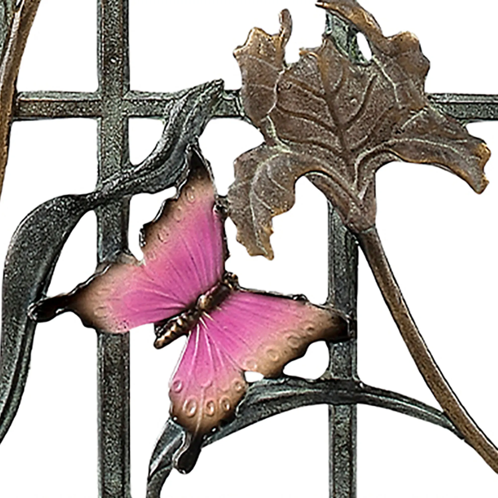The Butterflies and Iris Outdoor Garden Trellis helps your flowering beauties flourish with a touch of nature's charm and sweetness. Hand-cast from aluminum, the hand-finished bronze and verdi lattice features an openwork arched, block frame embellished with dimensional nature designs. Pink and yellow butterflies pop from the background in bright pastels, while more aged gold butterflies visit iris stems with verdi green leaves. Outdoor year-round use. With 6.25"H ground stakes, the sculptural garden trellis measures 14.5"Wx1"Dx39"H overall.