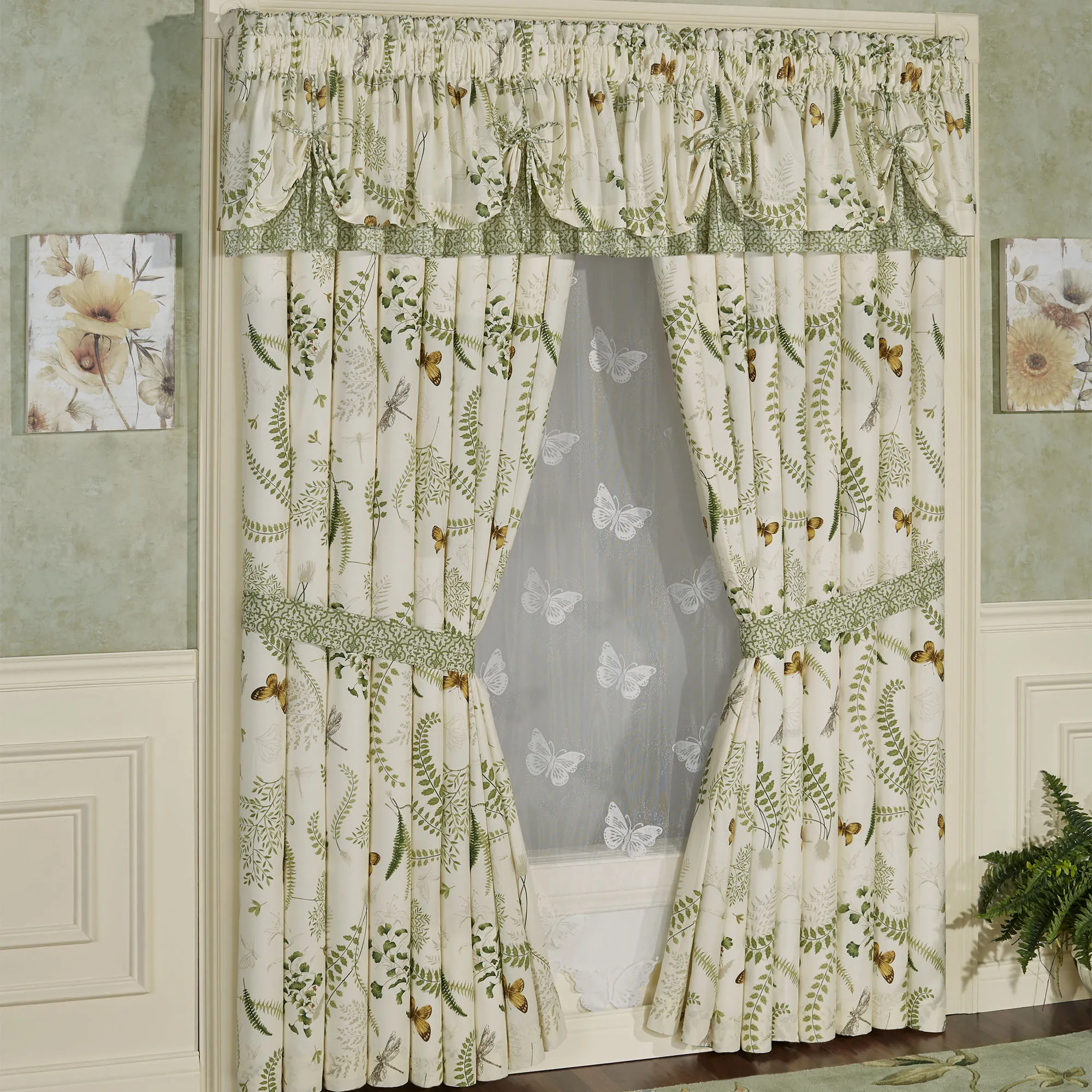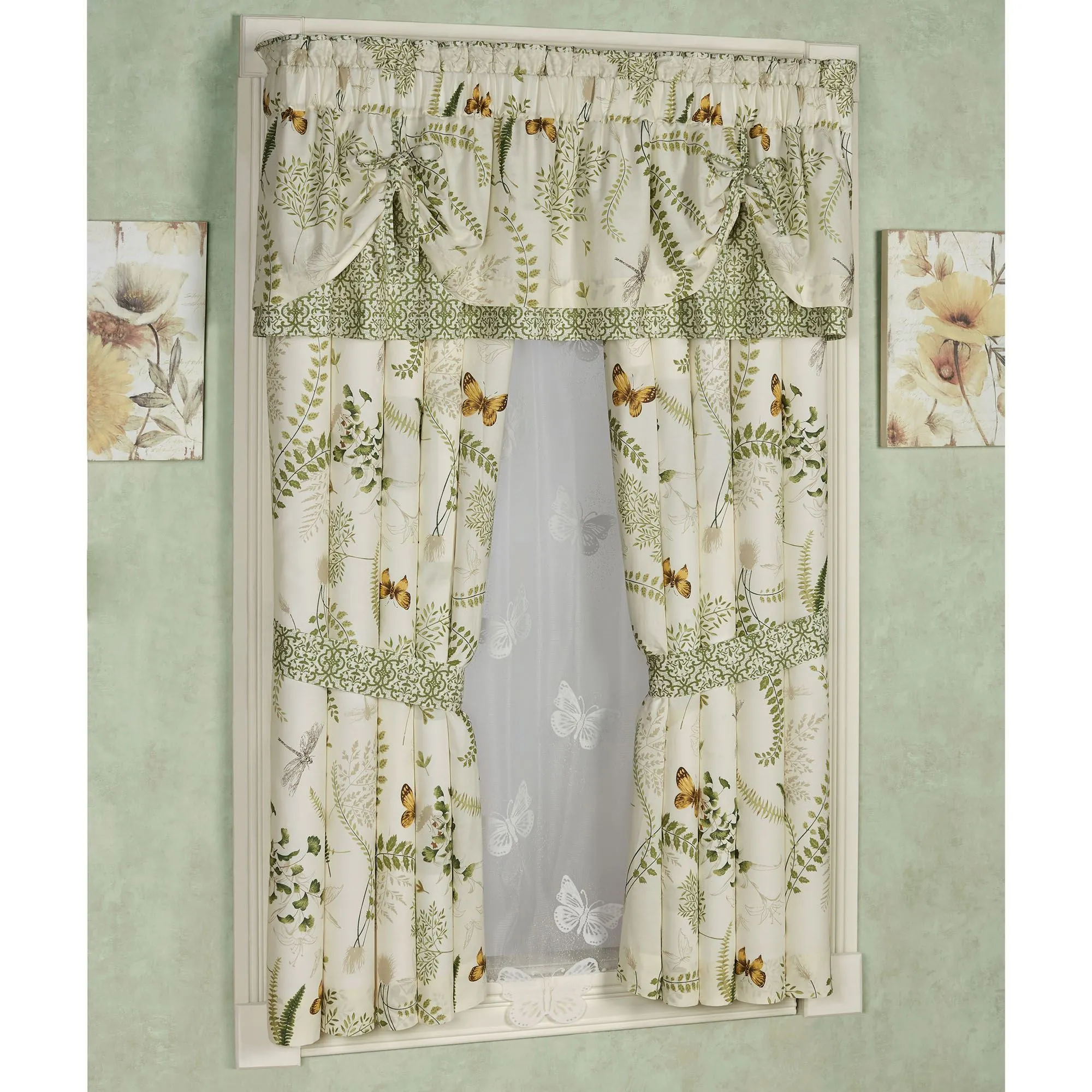 Made from smooth, soft cotton, the charming Butterfly Eden Window Treatment features printed nature designs of ferns, butterflies, dragonflies, and florals. Designs are in green, gray, golden yellow, and chocolate on an eggshell ground. Window treatment has 3" rod pockets. Specify Layered Valance or Curtain Pair. Layered Valance has tie accents and a moss green medallion bottom. Lined Curtain Pair includes tiebacks. Machine washable; for best results, dry clean. Imported. The curtain pair width is the total width of two panels together.