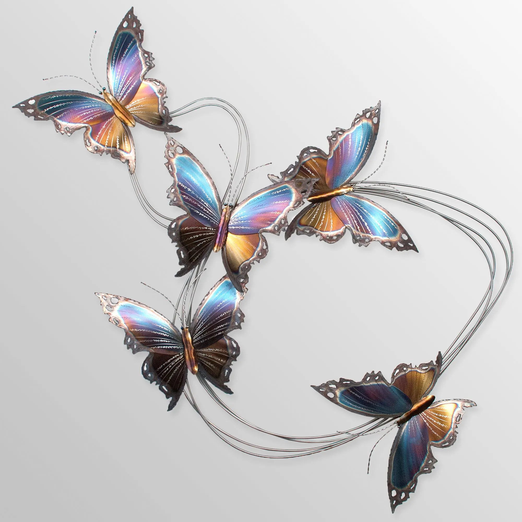 The Butterfly Flight Path I Wall Sculpture features sweet butterflies migrating together. Hand-finished with a heat patina, this handcrafted, stainless steel wall sculpture by M. Malizia features hand-flamed butterflies in brilliant shades of blue, purple, bronze, and golden yellow among winding steel rods. Wall art may be used indoors or outdoors under a covered area. Butterfly wall sculpture measures 42"Wx4"Dx30"H; weighs 10 lbs.