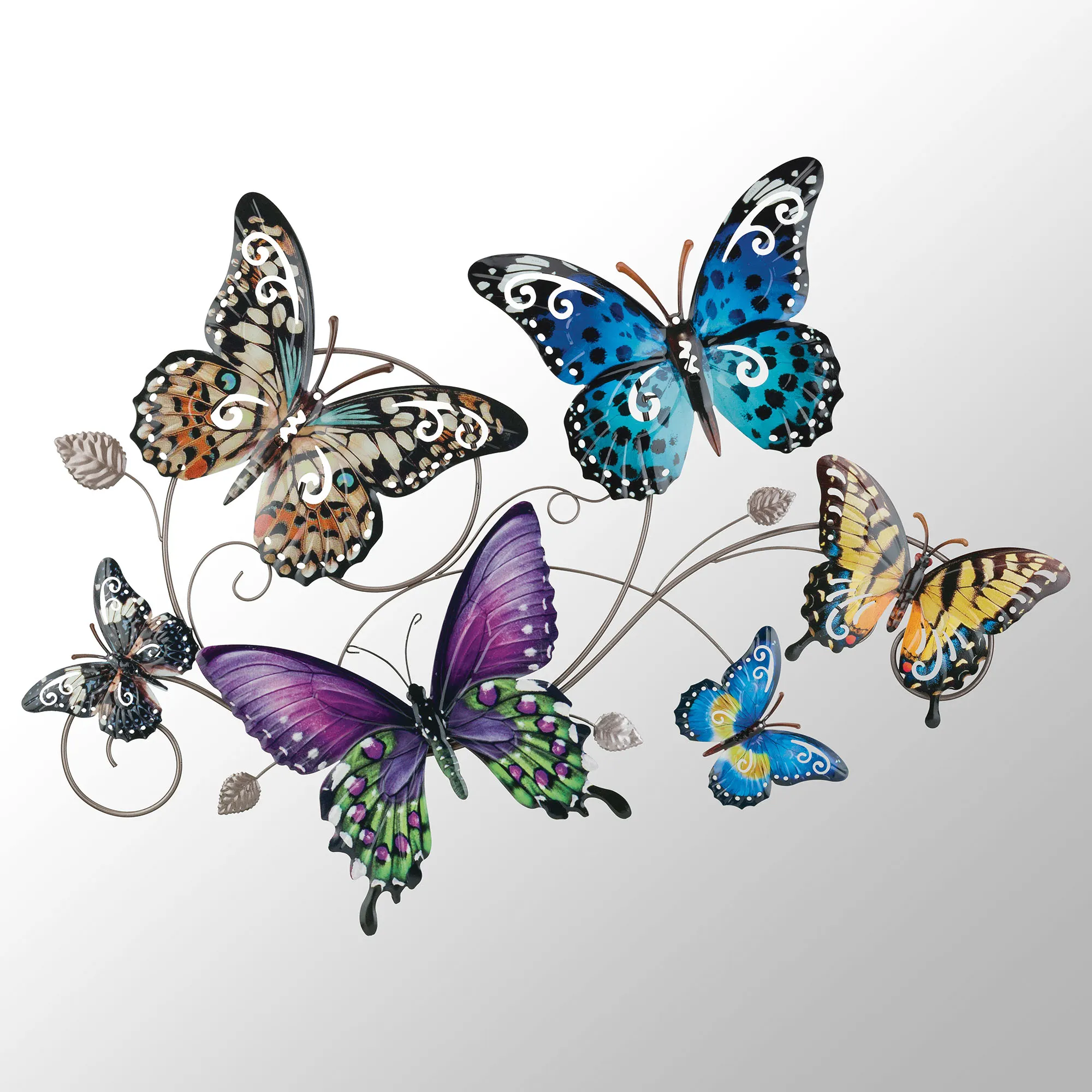 Follow a Butterfly Flutter trail as they flit about your indoor or outdoor space year round. Winging about the silver scrollwork paths, the six butterflies spread their magnificent openwork wings filled with detailed colorful printed designs and covered in a handpainted high-gloss finish. A weather- and fade-resistant powder coat colors the metal wall sculpture with bold hues of blue, purple, yellow, green, brown, silver, and black. Overall, the butterfly wall sculpture is 40"Wx1"Dx31"H.