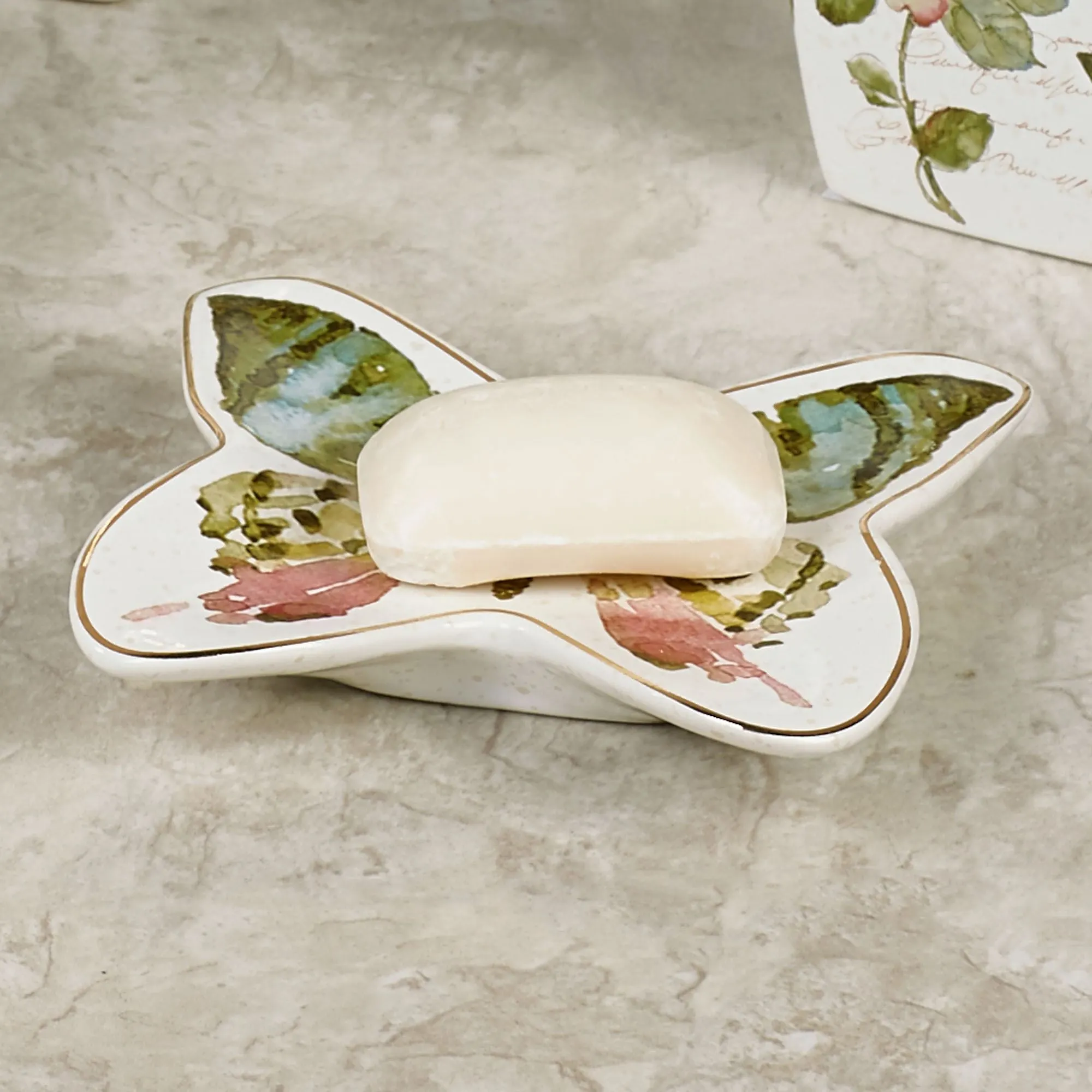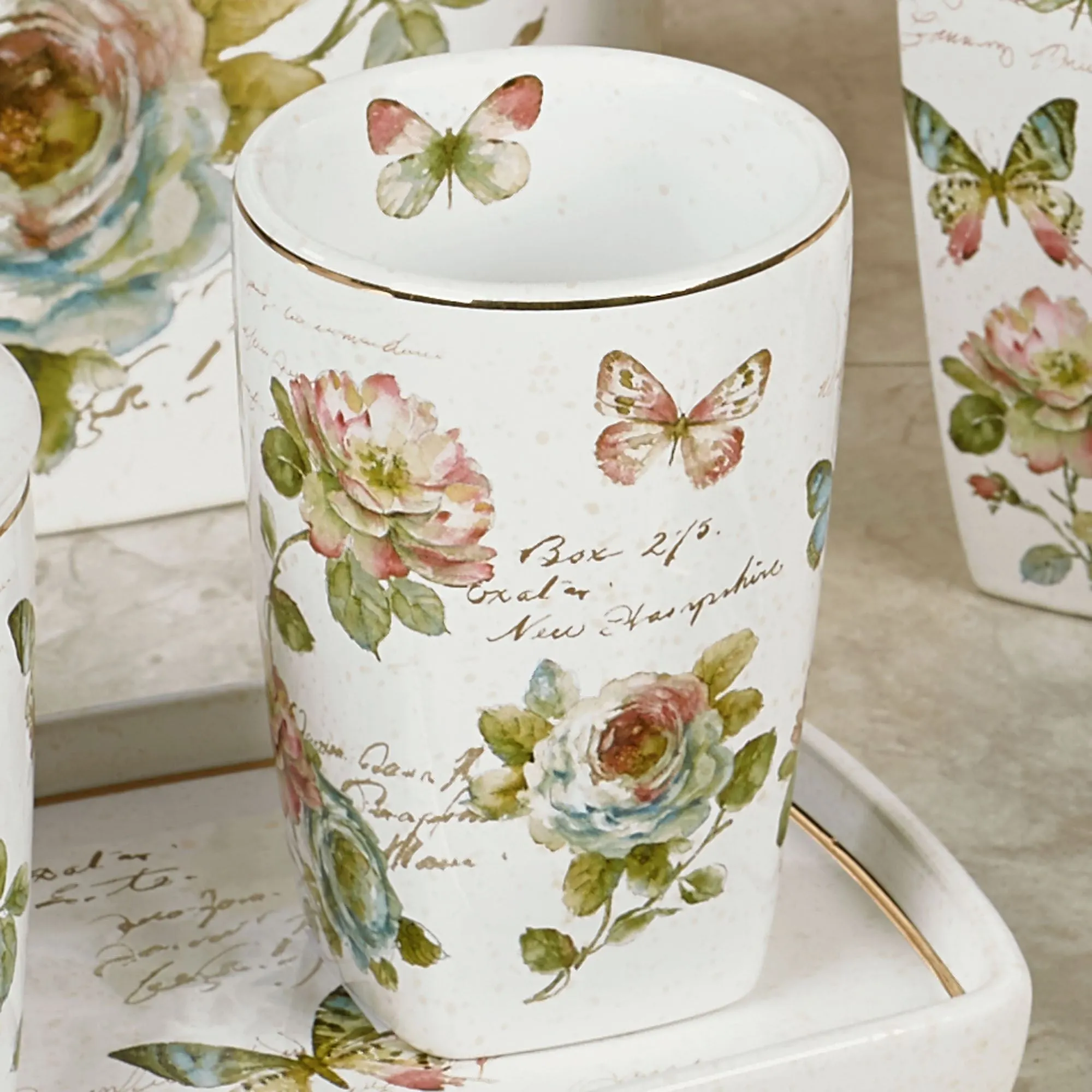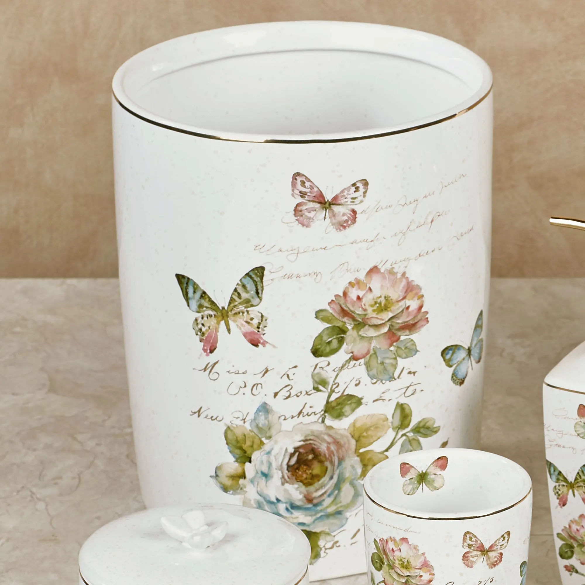 Sweet flowers are a beautiful setting for an enchanting Butterfly Garden. Ceramic bath accessories by (C)Lisa Audit, licensed by Wild Apple, feature butterflies, flowers, and script decals on an ivory background with gold speckles and trim. Other shades include blue, green, and rose. The toothbrush holder can be used to hold your toothbrushes or makeup brushes. Choose Tray, Covered Jar, Tumbler, Wastebasket, Lotion/Soap Dispenser, Soap Dish, Tissue Cover, or Brush Holder. Hand wash.