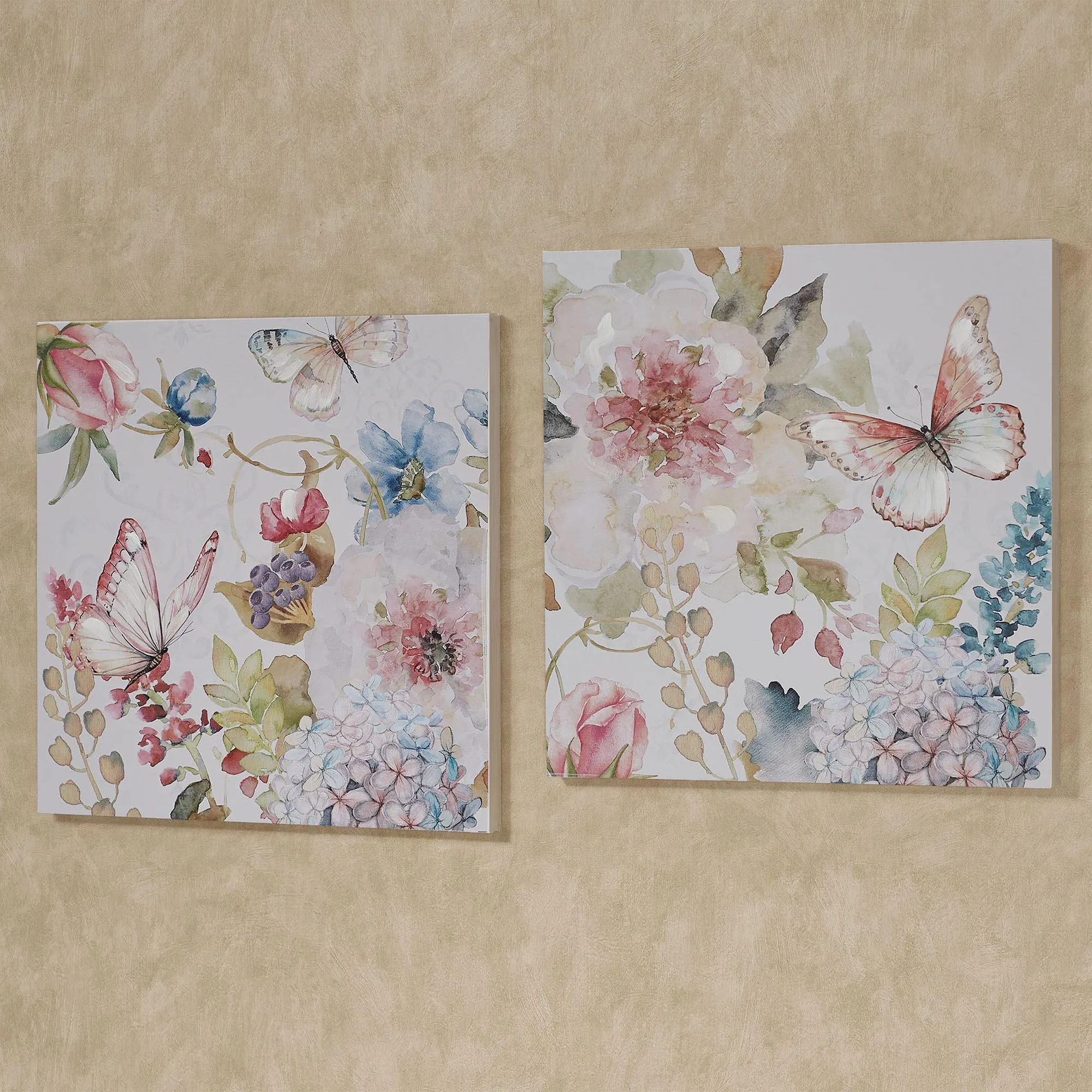 Transform your home into a Butterfly Haven with this sweet canvas wall art set. Watercolor-style printed canvases feature lovely blossoming flowers and visiting butterflies in pink, blue, and green hues. Handpainted embellishments add further beauty. Canvases are gallery-wrapped over wood frames. Each butterfly floral canvas measures 24"sq.x1.5"D.