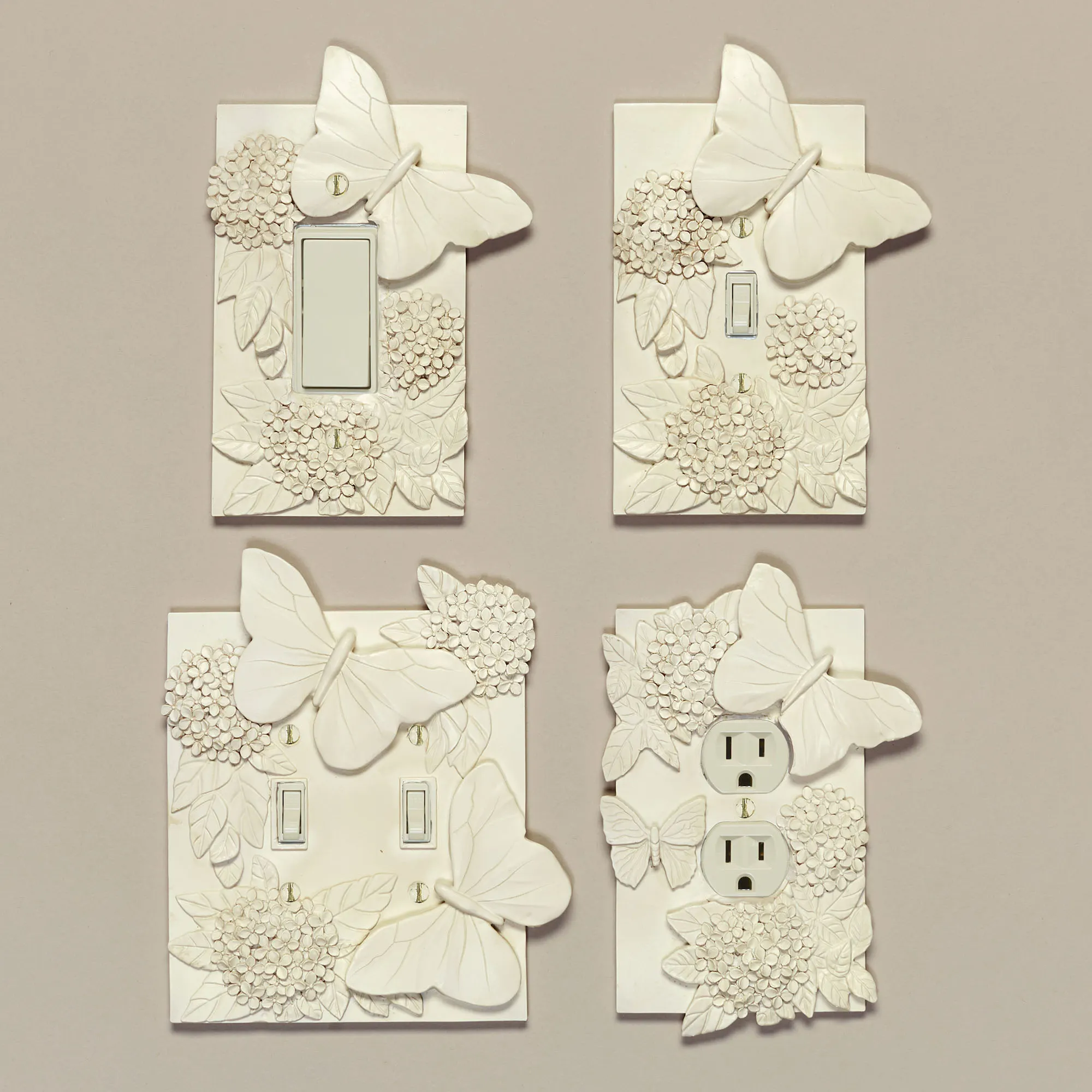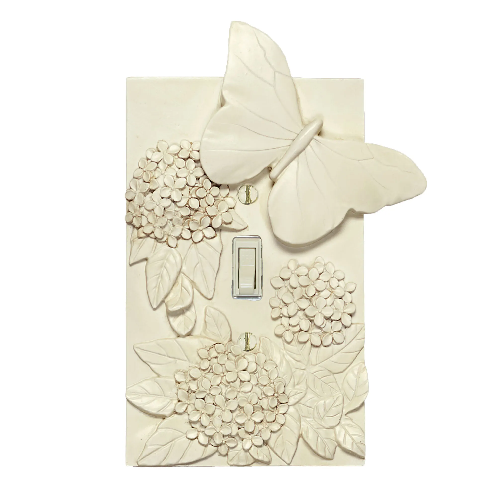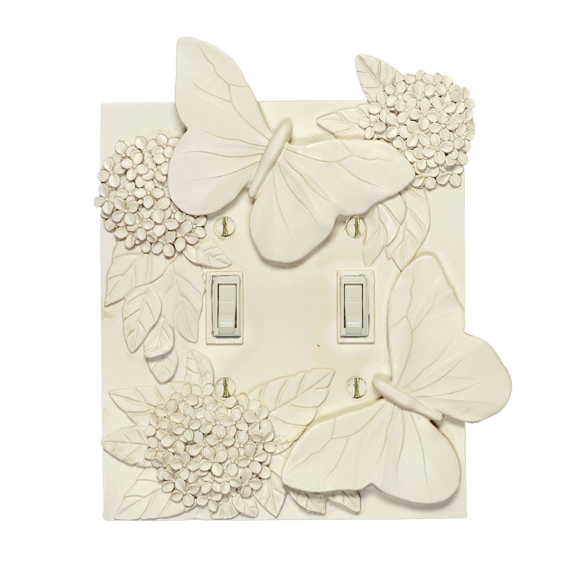 The Butterfly in Bloom flutters among sweet garden flowers. This resin switchplate has a handpainted, antique white finish and features a raised butterfly and hydrangea flower design. Specify Single Switch, Double Switch, Single Outlet (two sockets), or Single Dimmer/Rocker. Fragile item. Do not over-tighten the screws.