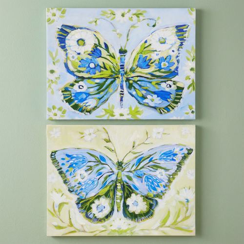 The Butterfly Meadow Canvas Wall Art Set flourishes with beautiful natural whimsy. From artist (C)Susan Winget, each canvas artwork features a lovely painterly butterfly with daisy and tulip flower detailed wings and handpainted gel embellishments. Gallery-wrapped over wood frames, one wall art has a blue background, the other has a soft green background, and both are scattered with more white flowers and green leaves. Each butterfly canvas wall art measures 16"Wx1"Dx12"H.