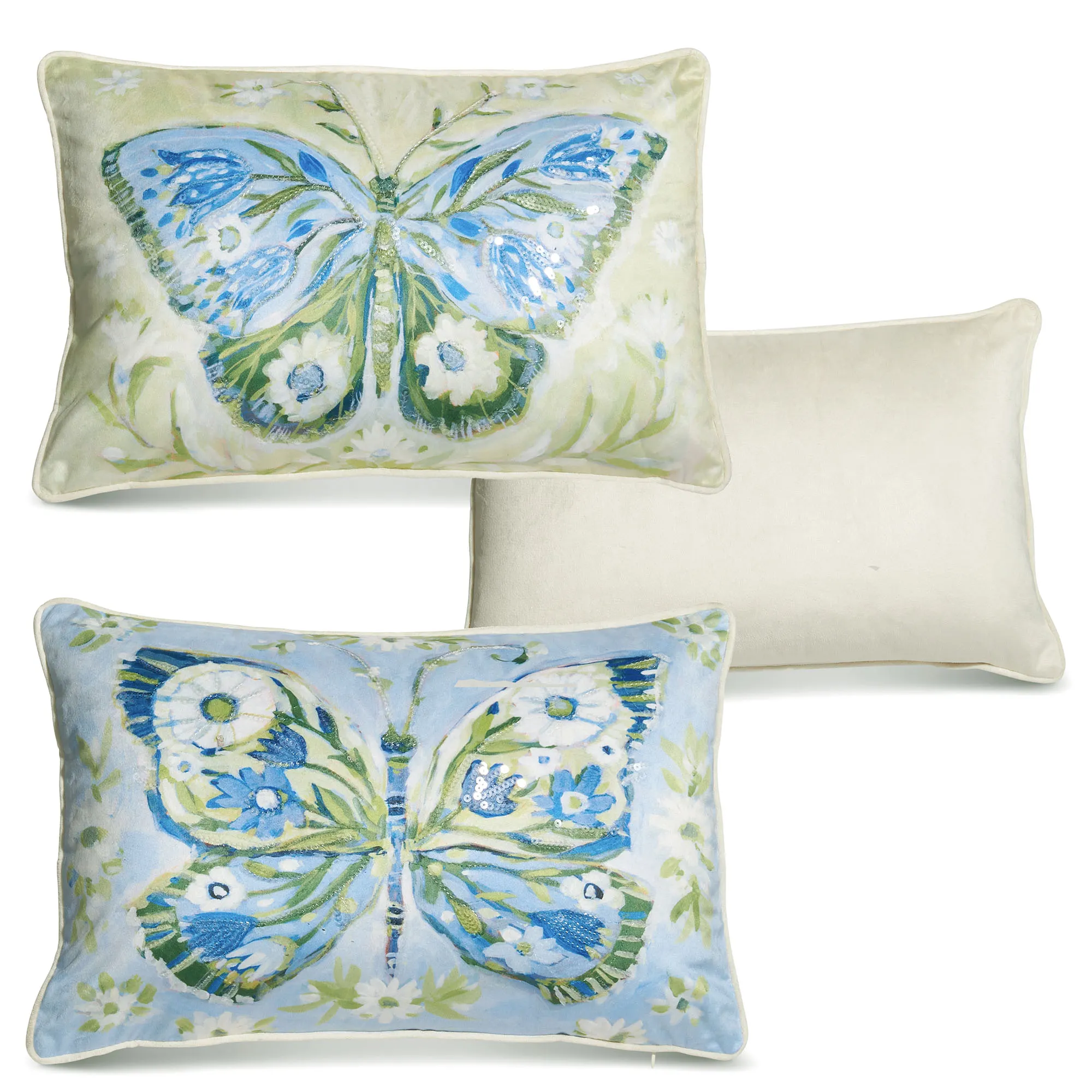 The Butterfly Meadow Pillow Set offers a touch of beautiful natural whimsy. From artist (C)Susan Winget, each rectangle pillow features a lovely painterly printed butterfly with daisy and tulip flower detailed wings and sparkling sequin accents. One has a soft green background, the other has a blue background, and both are scattered with more white flowers and green leaves. Each 18"x12" polyester pillow is backed in ivory with piped edges; hidden zipper closure. Insert is polyester. Dry clean the covers; spot clean the inserts. Imported.