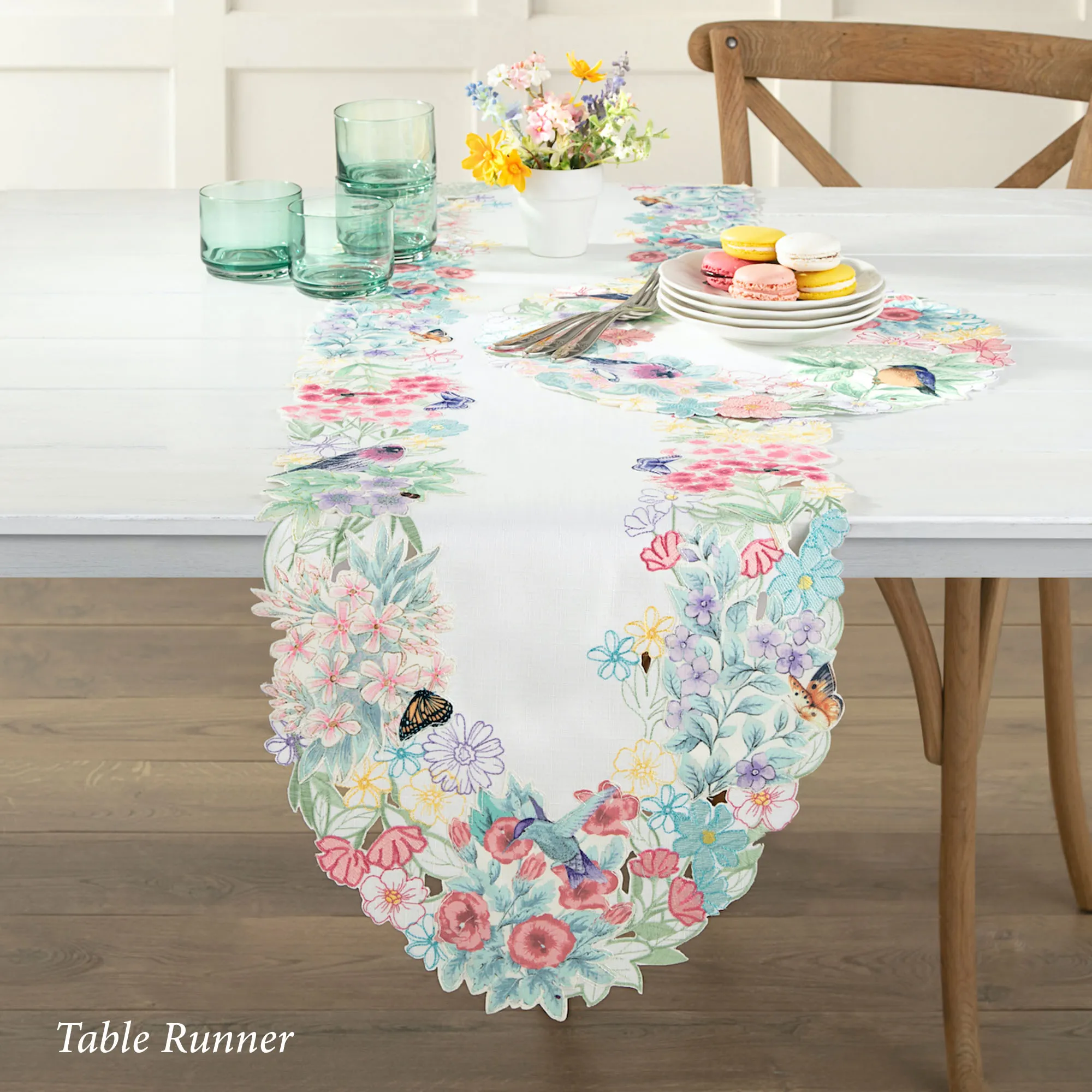 Evoke the sweet charm and colorful sights of spring in your tablescape with the Butterfly Meadow Flutter Floral Table Linens. From Lenox(R) American by Design, the off-white, woven slubbed polyester designs feature embroidered, cutwork appliqued spring delights in shades of blue, pink, green, purple, red, and yellow. Flowers, birds, hummingbirds, butterflies, and bees decorate the collection. Centerpiece Linen has openwork accenting. Napkins have purple flowers, green leaves, a butterfly, and purple embroidered edges. Specify Centerpiece Linen, Oval Table Runner, Round Placemat Set of 4, or Napkin Set of 4. Machine wash. Imported.