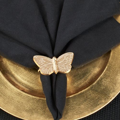 The Butterfly Napkin Ring Set flutters with elegance. Made of metal, these napkin rings each have a gold finish and a butterfly with detailed, pressed wings. Ring opening is 1.75" dia.; overall, measures 3"Wx2"Dx2"H.