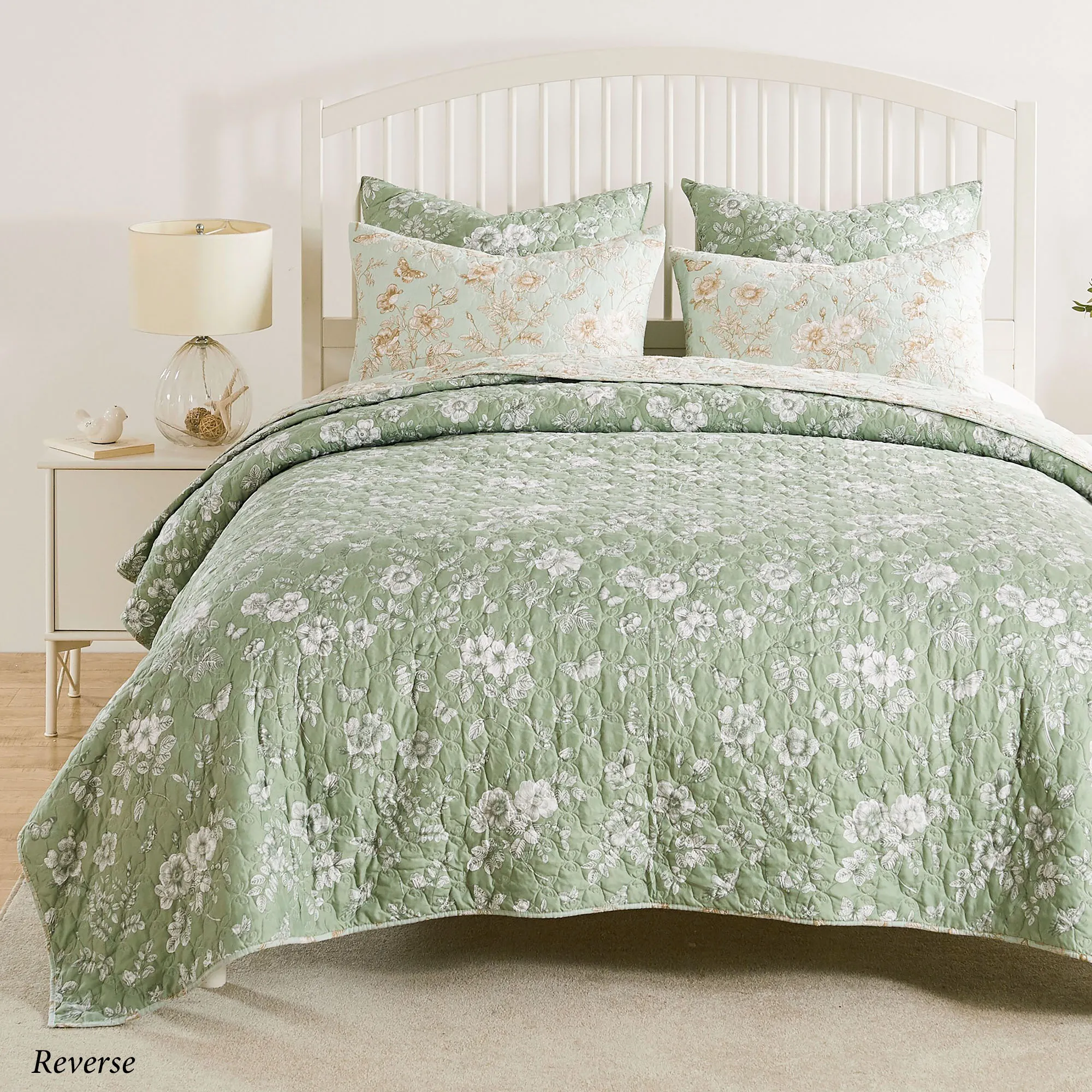 Transform your retreat into Butterfly Paradise with the charm of this quilted bedding. Printed in sepia-toned antique bronze and white, lovely butterflies flit about the cascading wildflowers on the pre-washed and preshrunk mint green cotton ground. More flowers and butterflies decorate the olive green polyester microfiber reverse in soft shades of white and olive green. Unique ogee quilting and bound edges finish each quilted reversible element. The design is OEKO-TEX(R) certified, which ensures a lack of harmful chemicals, making the bedding safe for the whole family.