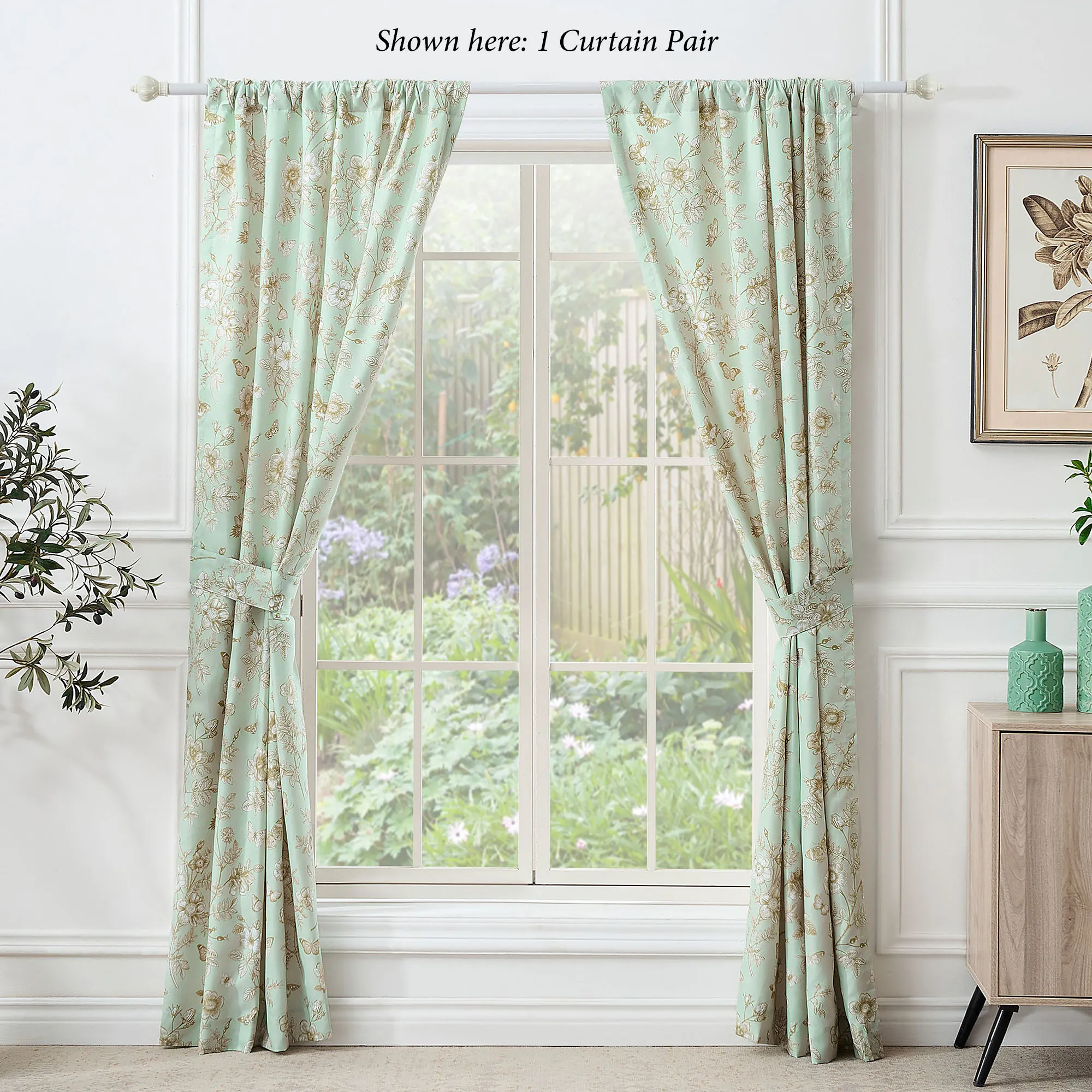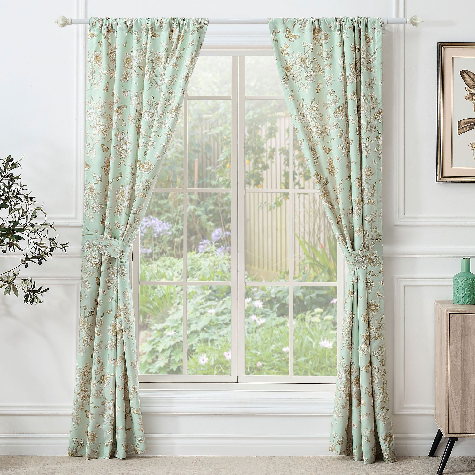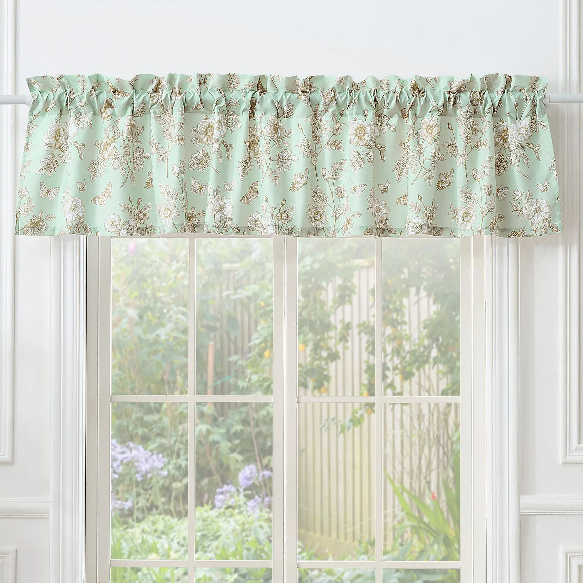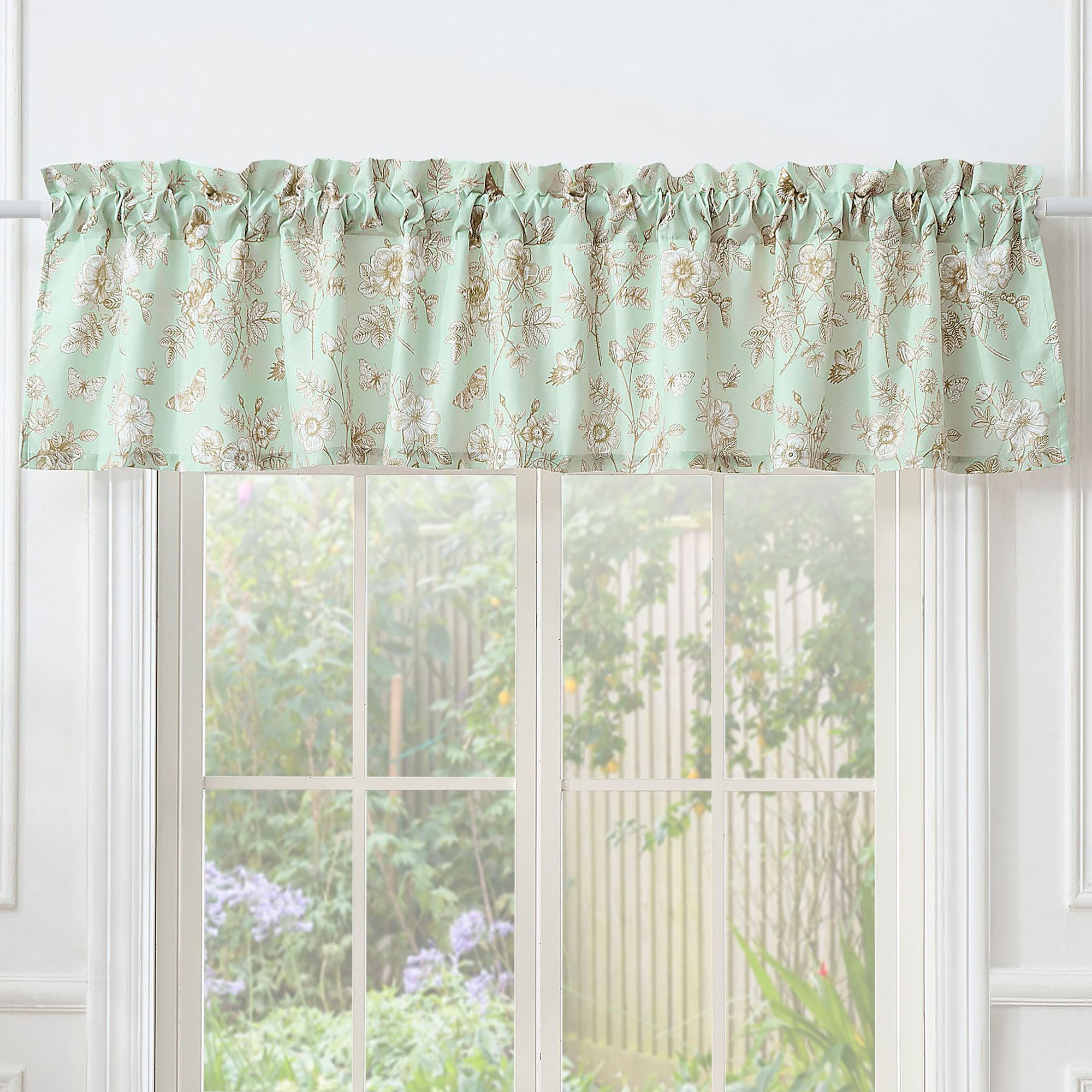Lined Window Treatment features the mint green design, tailored edges, and 3" rod pockets. Curtain Pair includes tiebacks. Valance is also available.